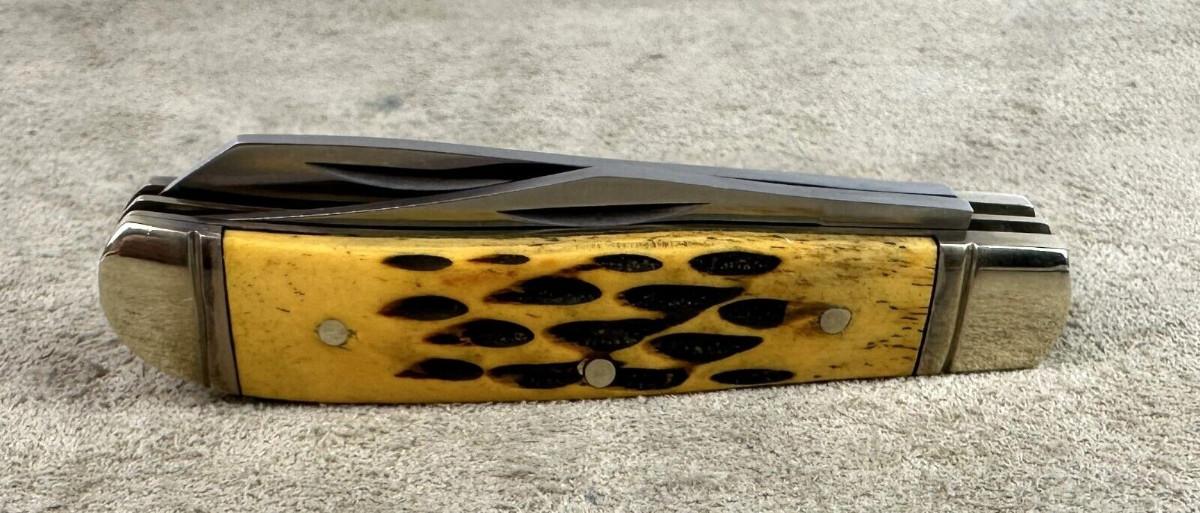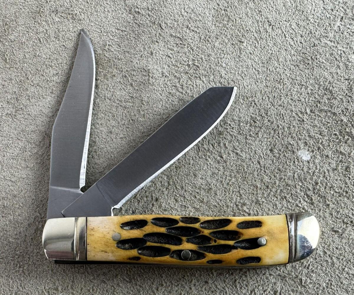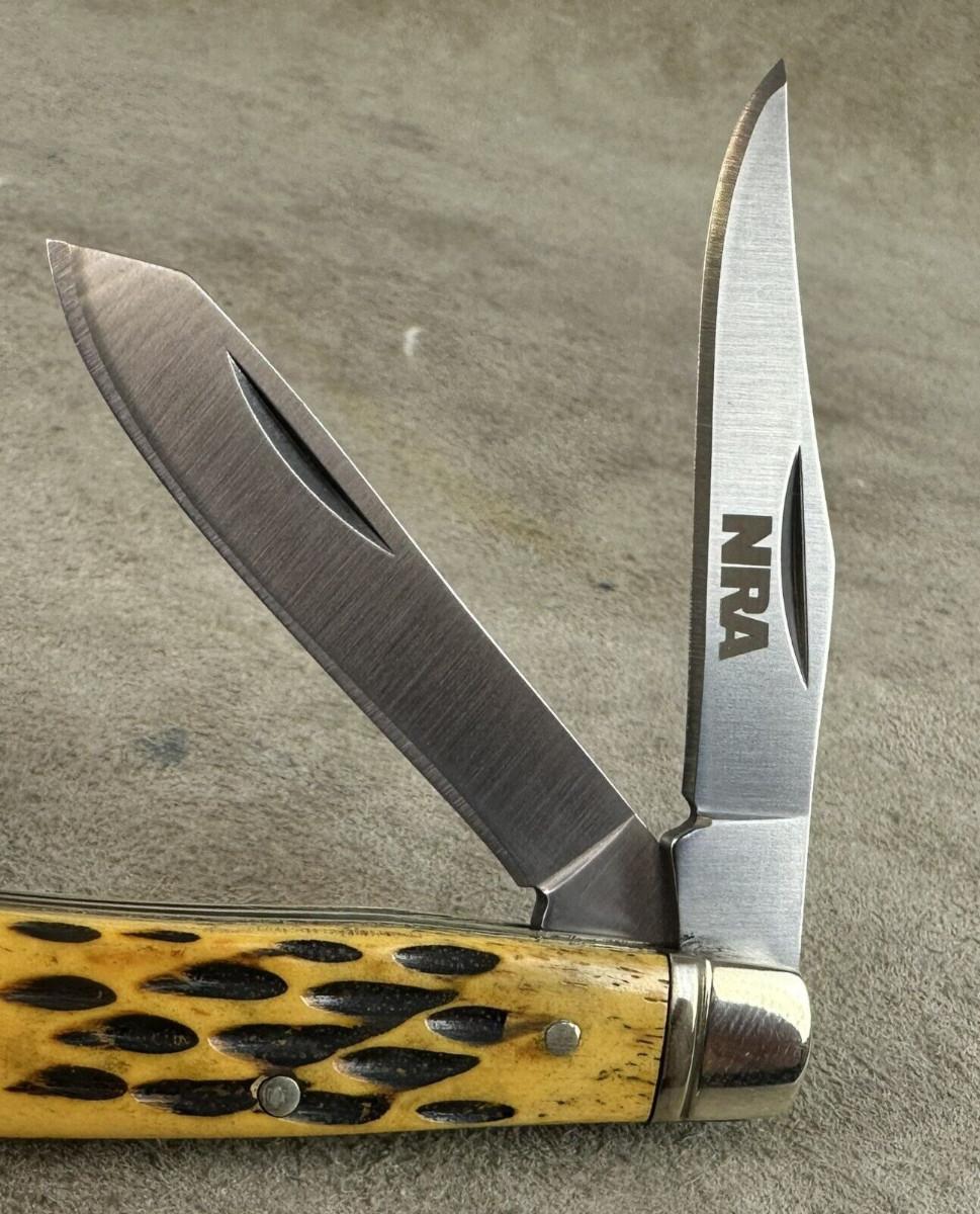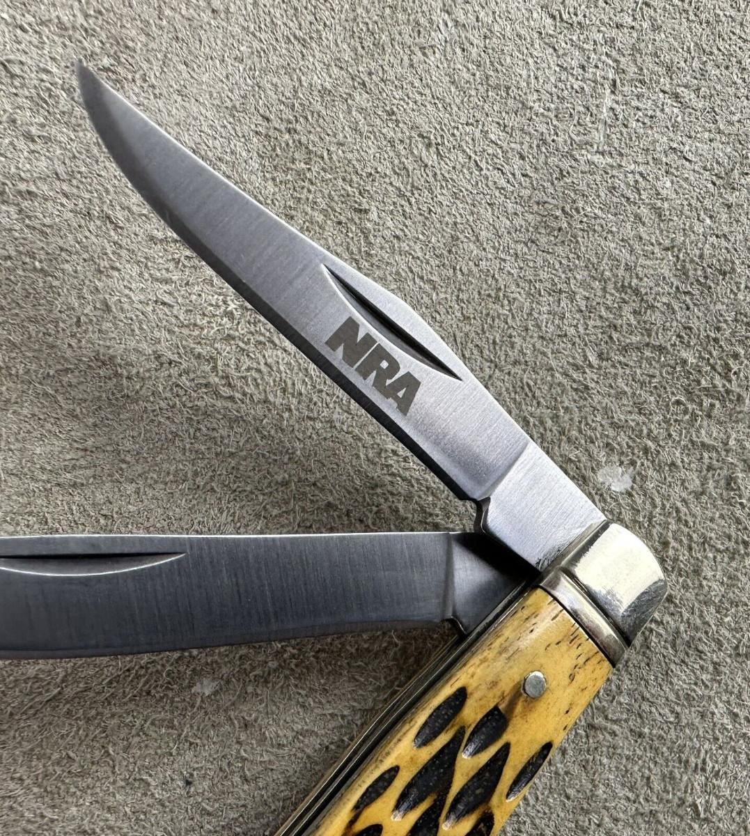 Here is a quality made mini trapper knife NRA branded...Unknown maker? Like new condition..Jigged stag handle..Stainless spey and clip blades...Unmarked other than the National Rifle Association brand...Case? Western? Closed 3"...2.4oz..Nickel bolsters..brass liners..Tight..Good snap..Looks like the factory edge...as shown.