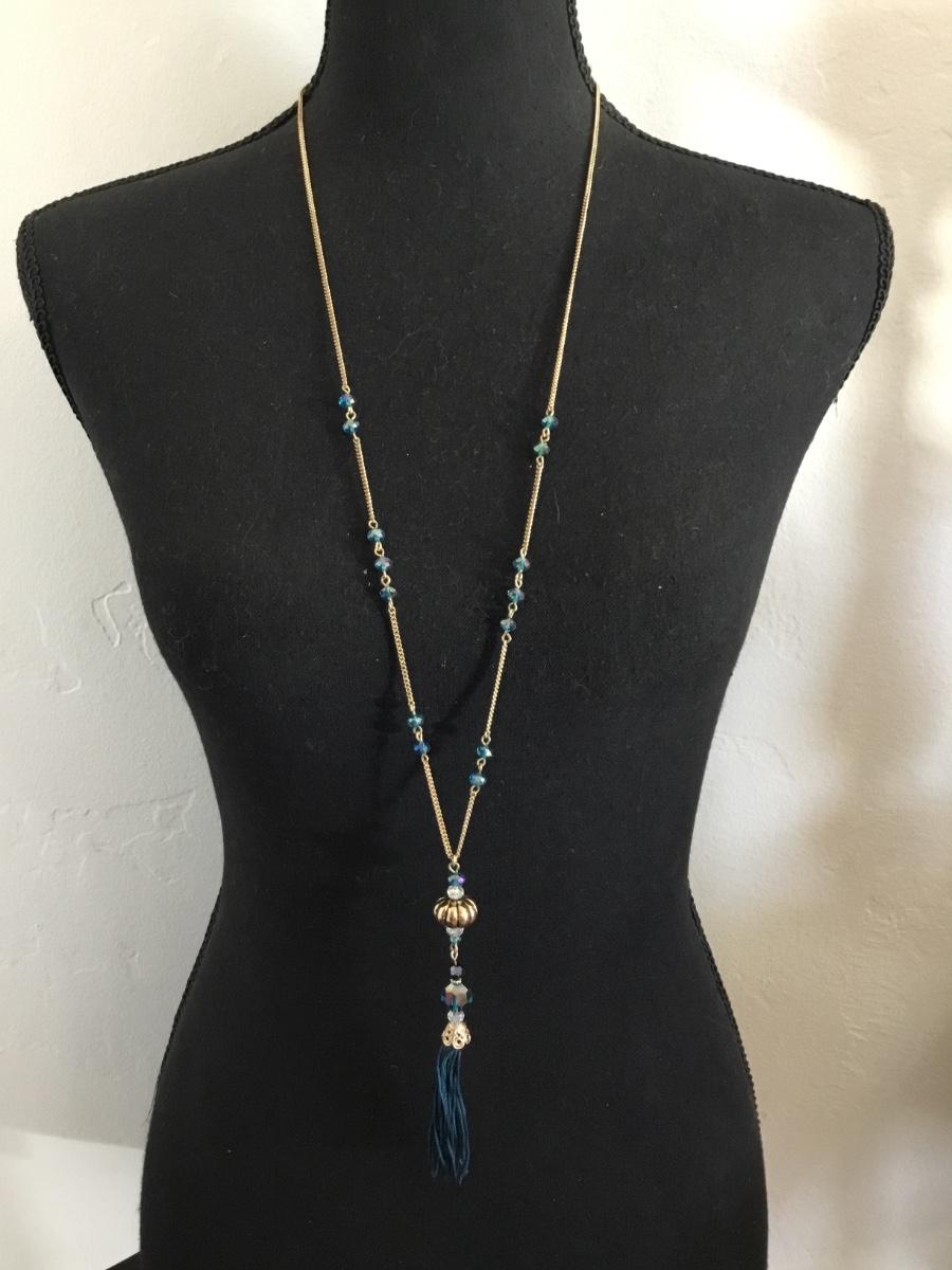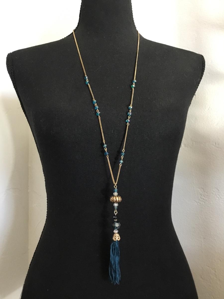 NRT Gold tone, light blue faceted, crystal tassel necklace