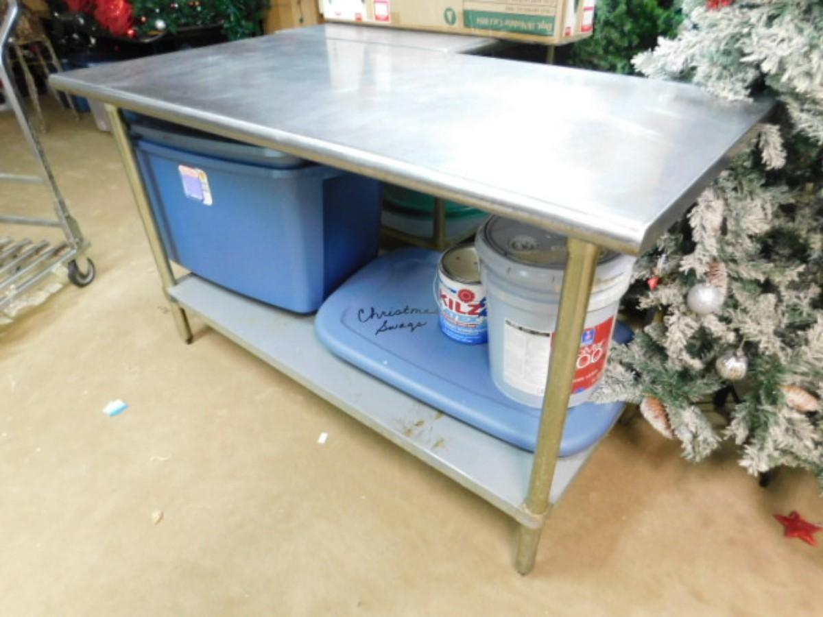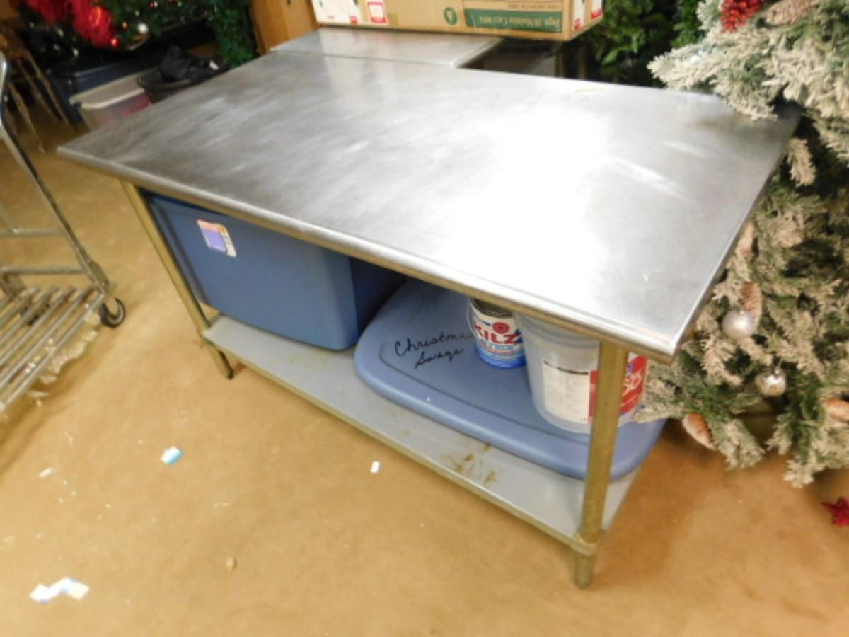 NSF Commercial Kitchen 5' Worktable with Bottom Shelf Choice A (No Contents) Expect some wear or scratches to finish. Shipping option available via freight or local mover at Buyer's expense. Buyer must have all shipping scheduled within the stated dates and times of pickup. Recommended local mover is Beaty Bros. Moving 828-201-2982