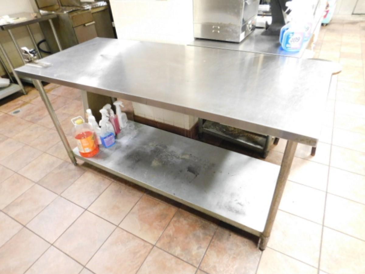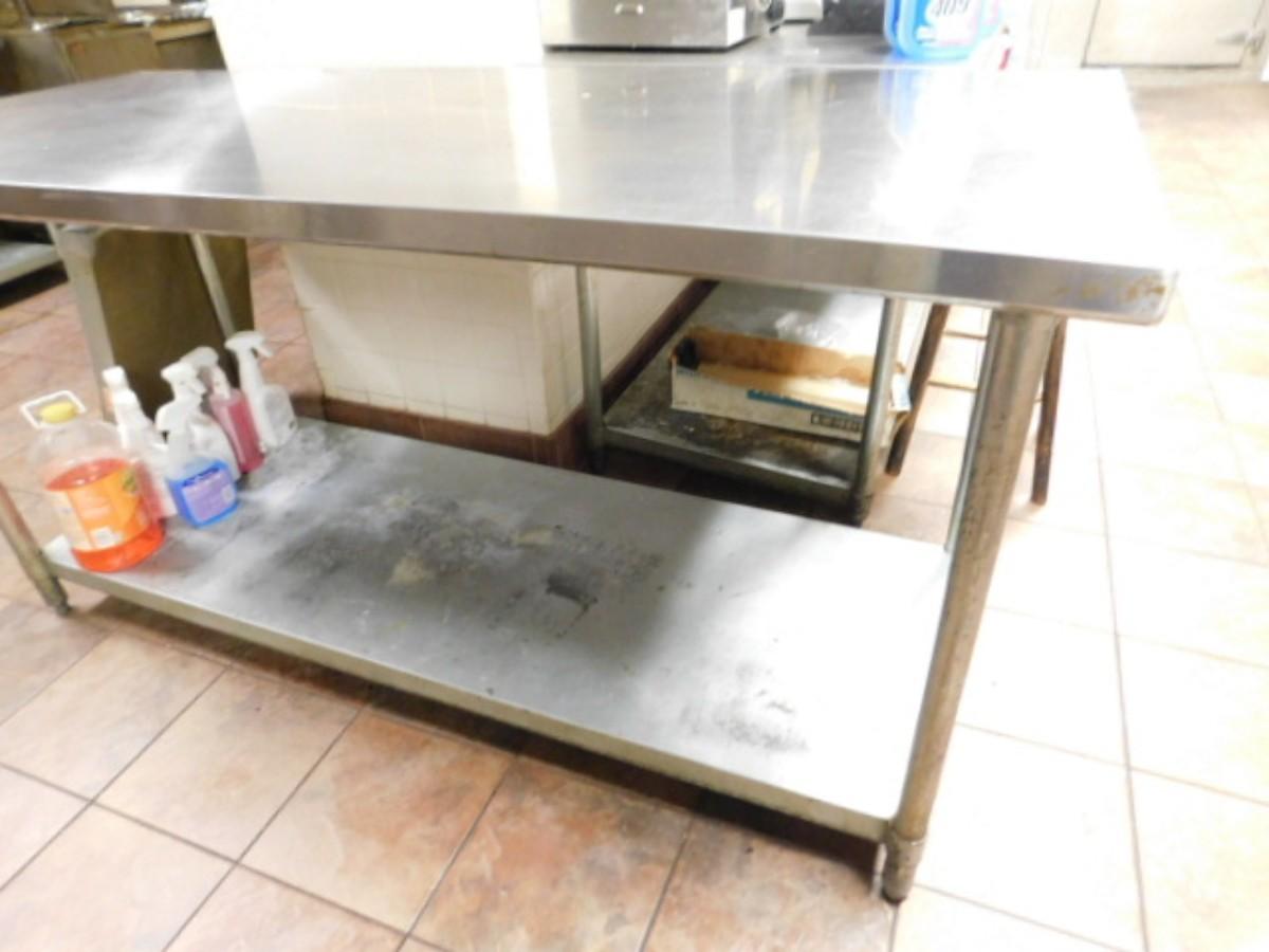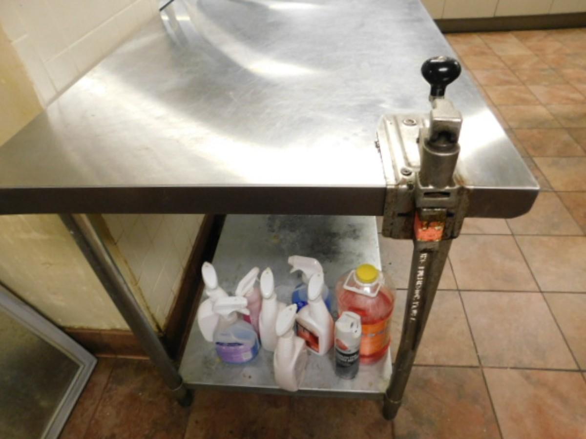 NSF Commercial Kitchen 6' Worktable with Bottom Shelf and Can Opener Attachment Expect some wear or scratches to finish. Shipping option available via freight or local mover at Buyer's expense. Buyer must have all shipping scheduled within the stated dates and times of pickup. Recommended local mover is Beaty Bros. Moving 828-201-2982