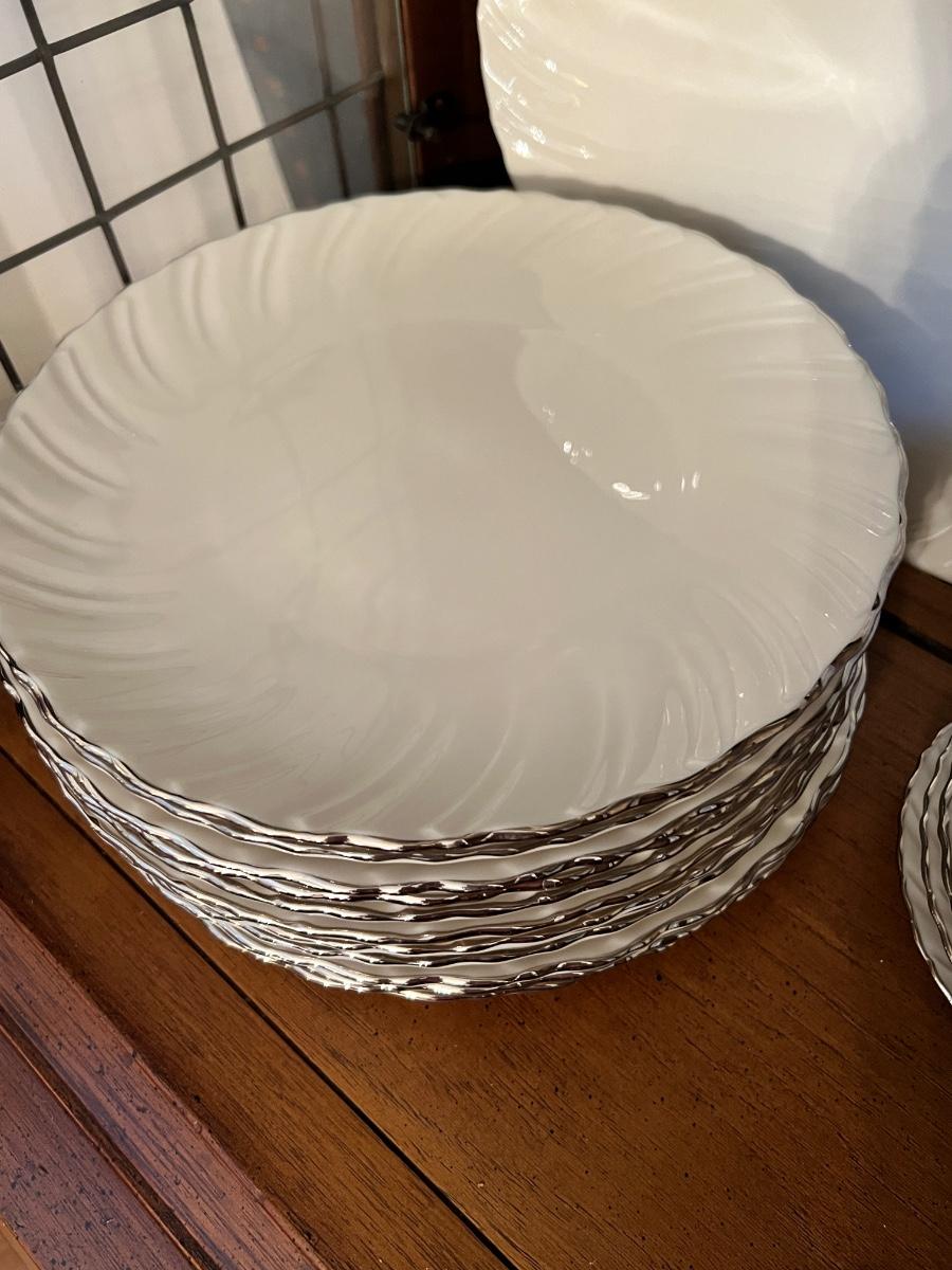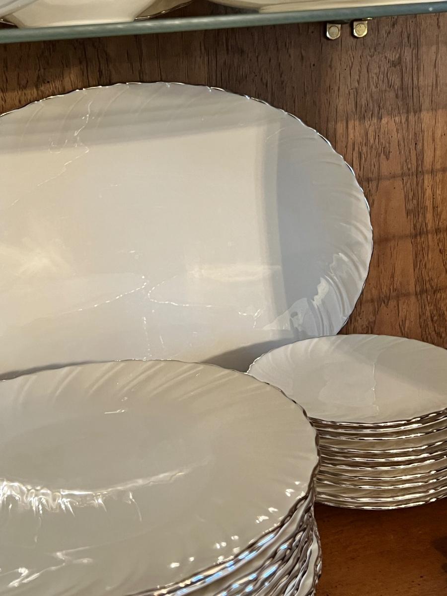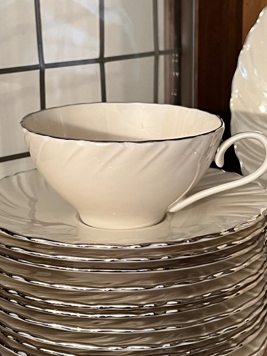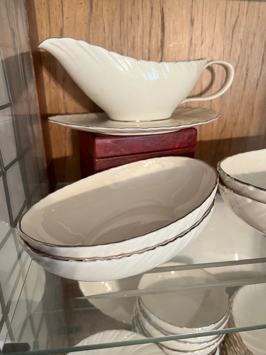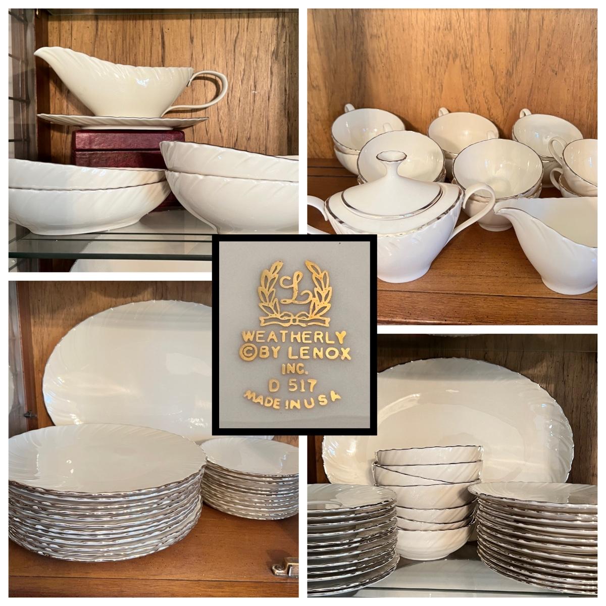 Brand: Lenox Pattern: Weatherly Pattern#: D517 Manufacturer Status: Discontinued In Production: 1959-1986. Description: Cream background, No design, Swirled rim, Platinum trim Theme: Traditional. See the last picture for list of pieces included.