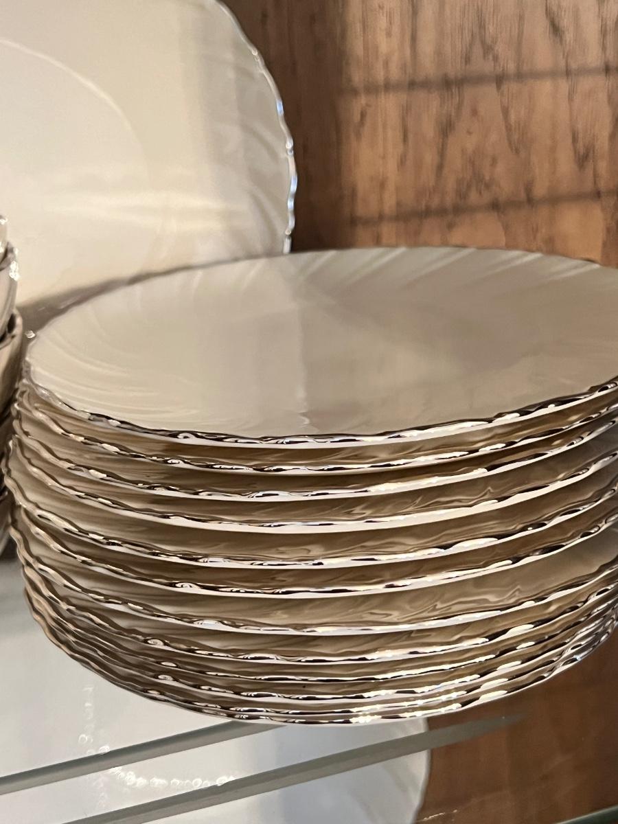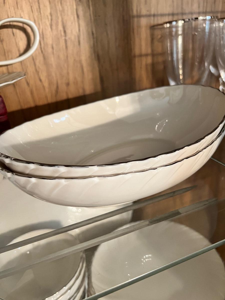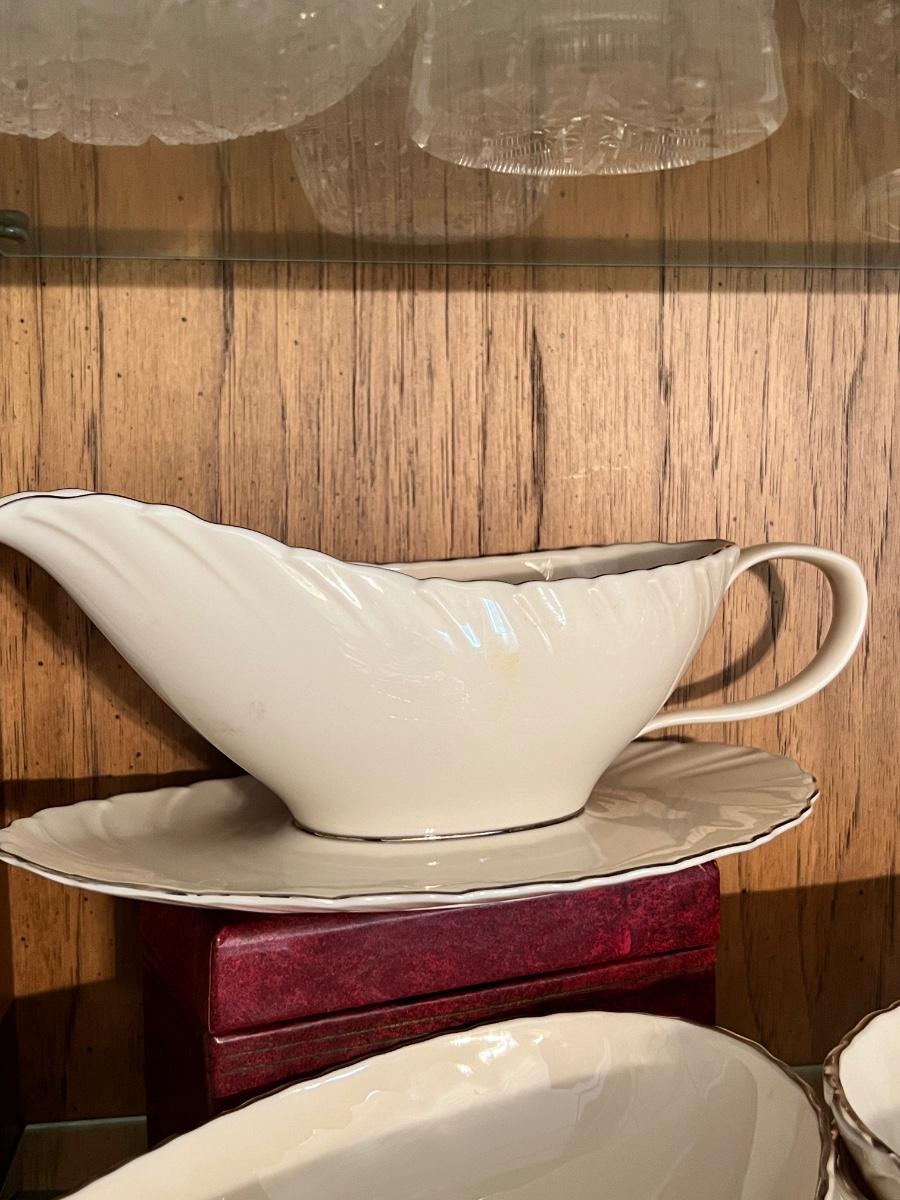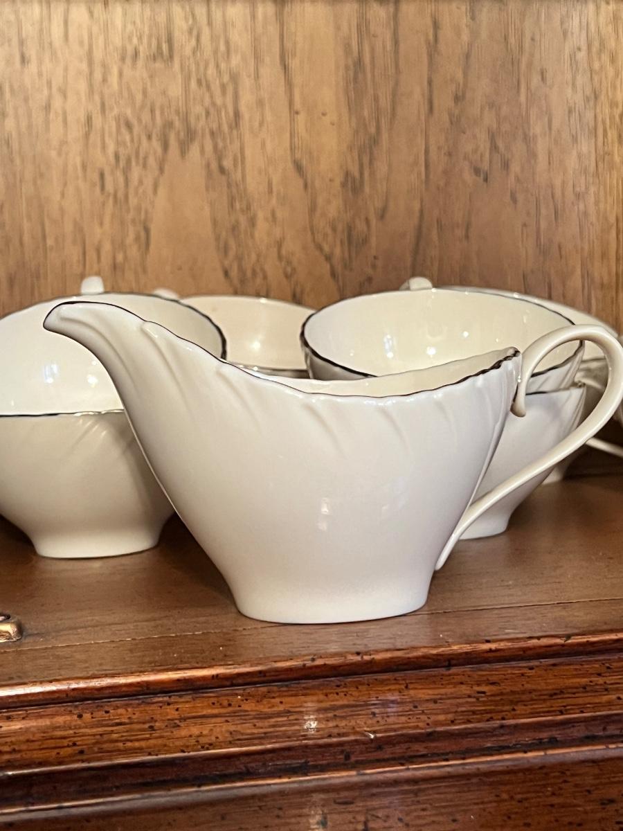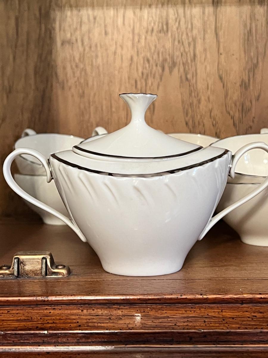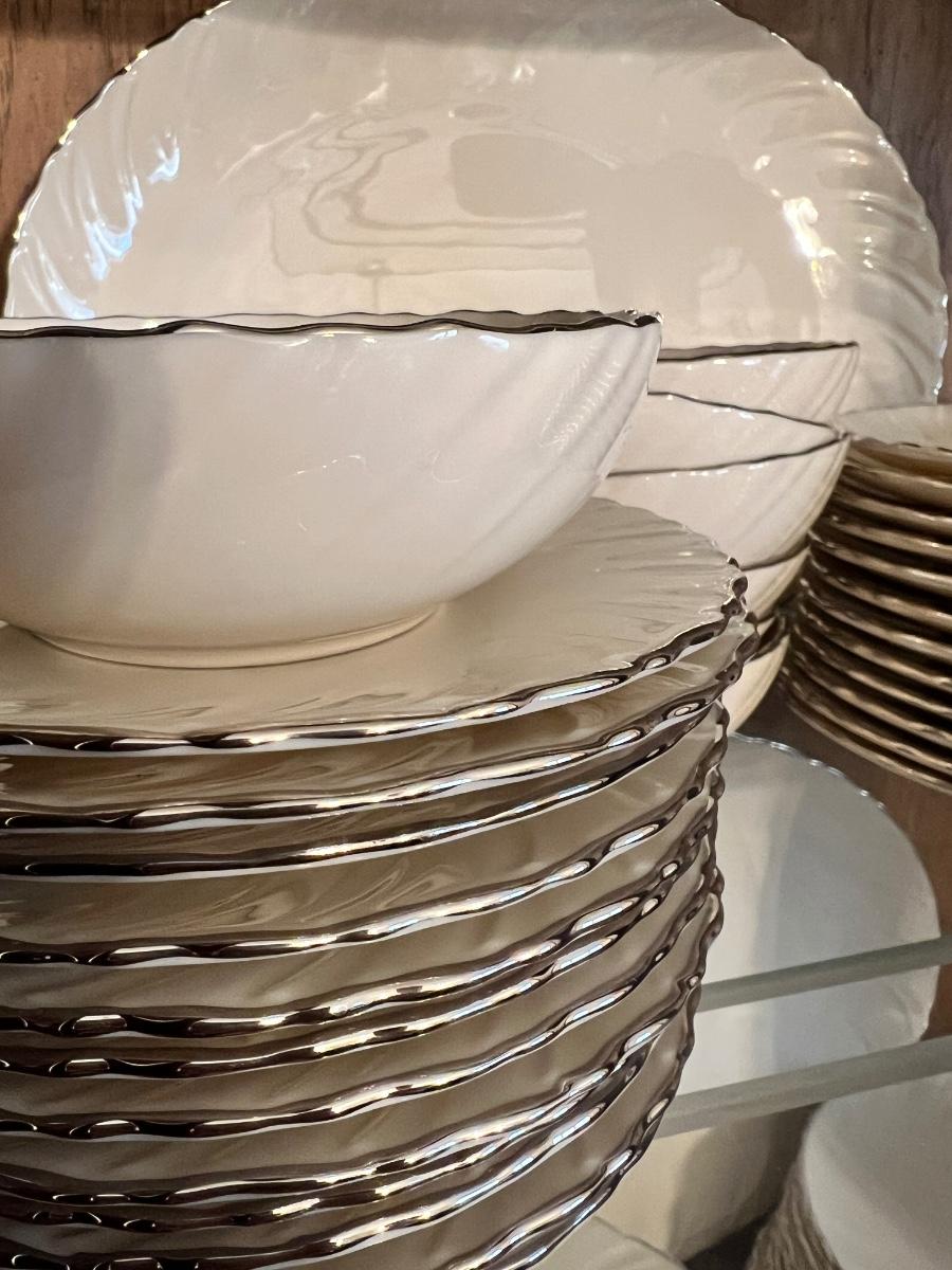 Brand: Lenox Pattern: Weatherly Pattern#: D517 Manufacturer Status: Discontinued In Production: 1959-1986. Description: Cream background, No design, Swirled rim, Platinum trim Theme: Traditional. See the last picture for list of pieces included.