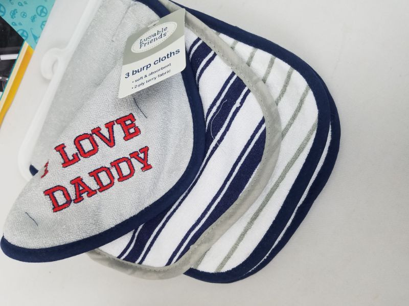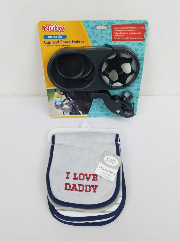 Nuby Cup & Snack Holder, & 3 Burp Cloths (gray/white/navy/red) - New