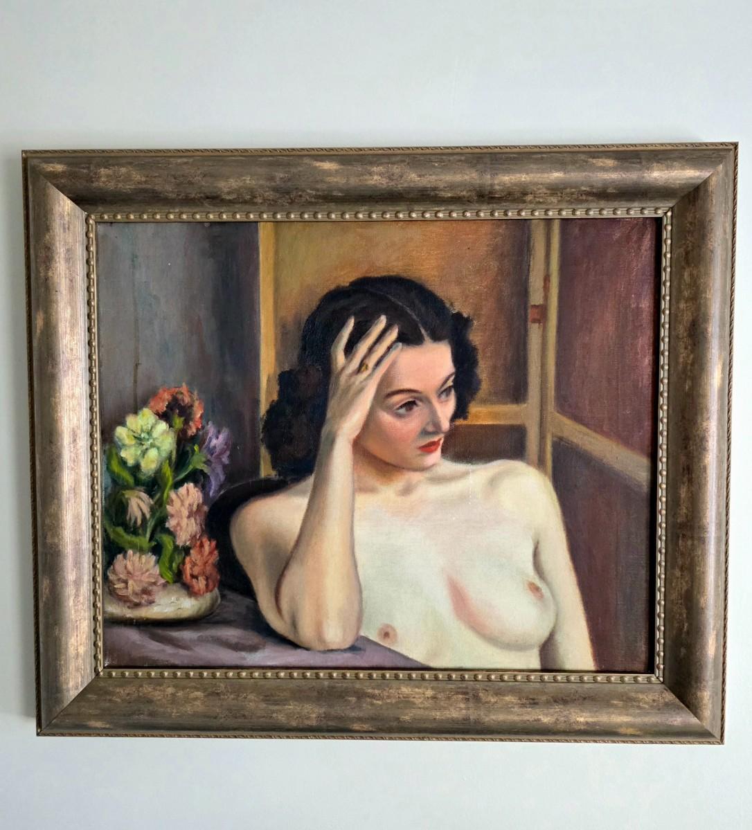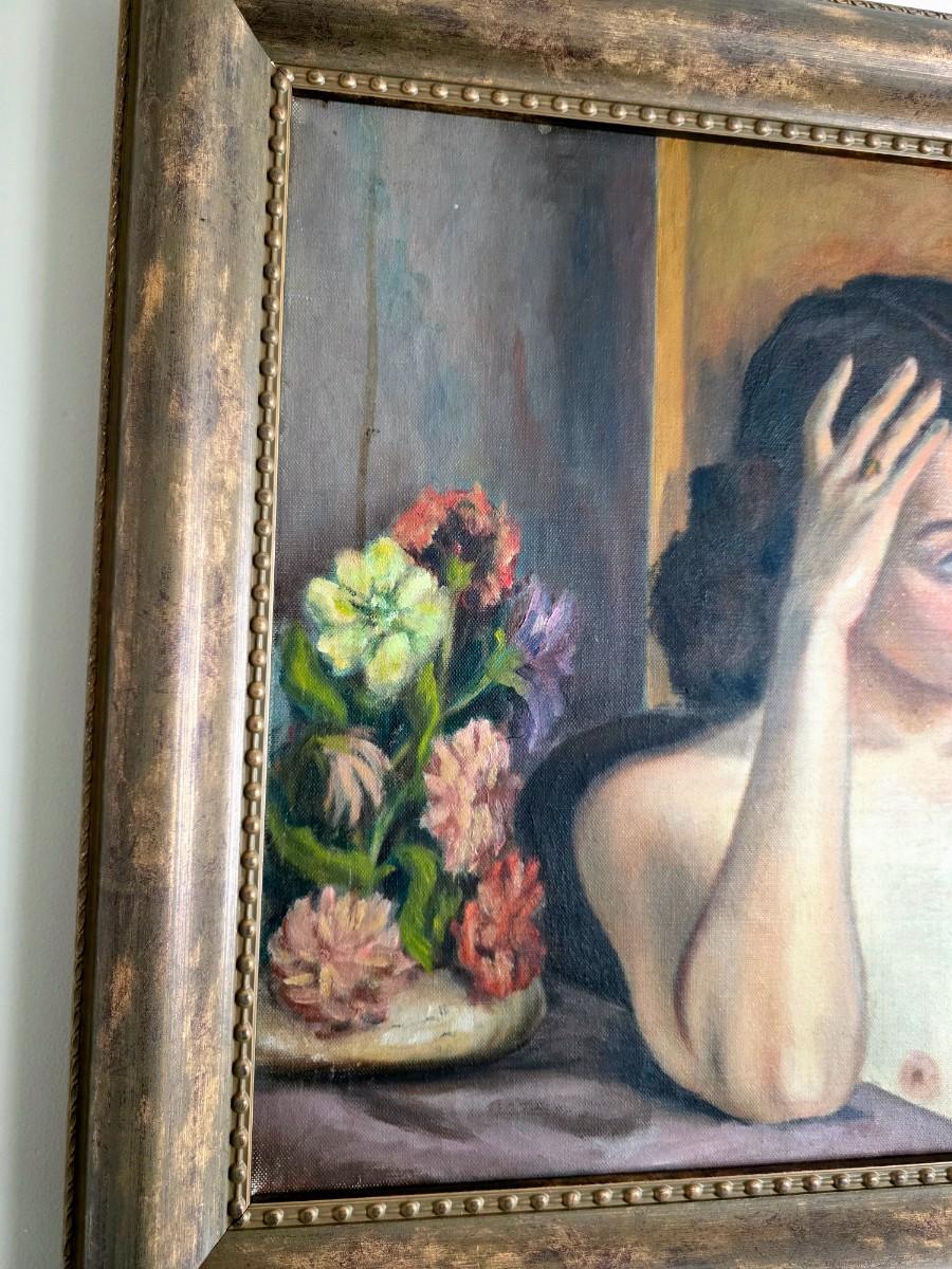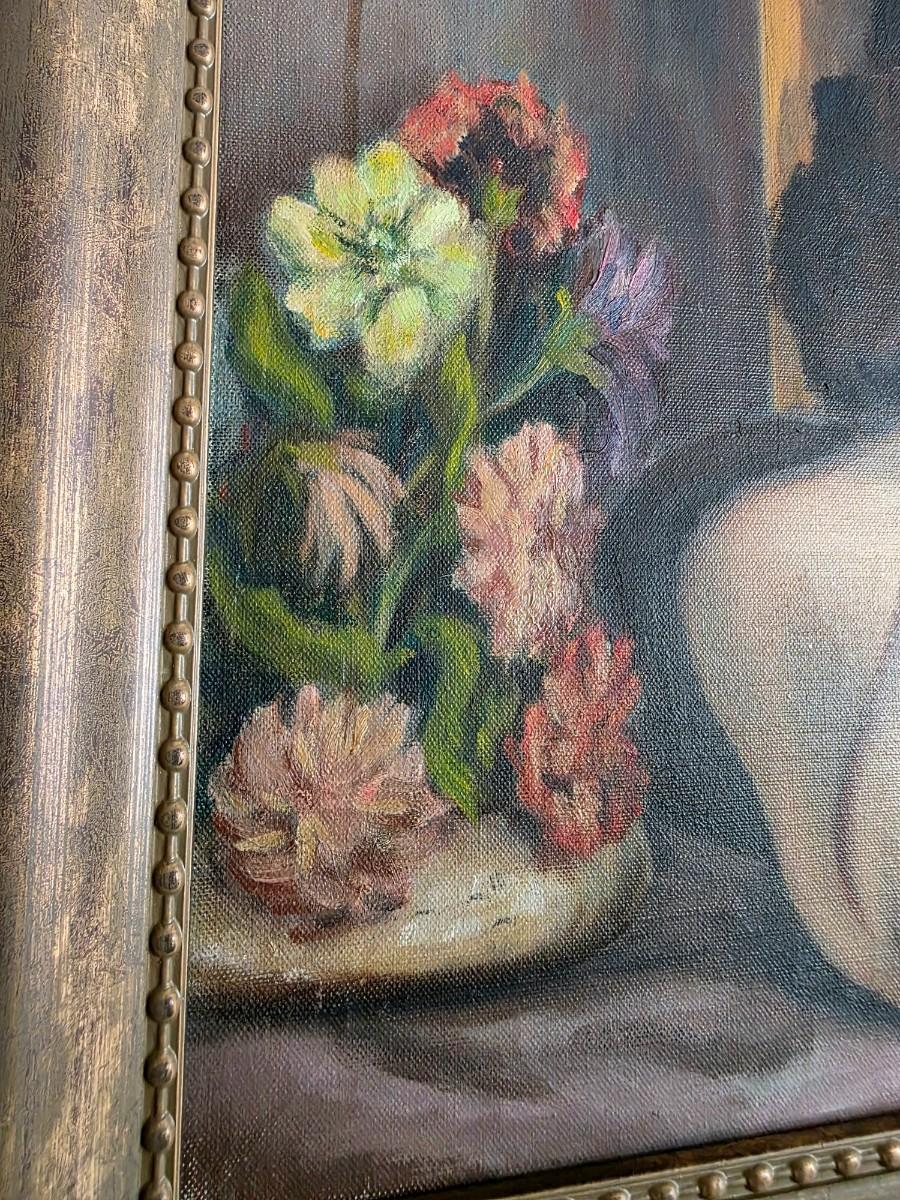 by Grand Junction, CO artist, Ruth G. Moss (1916-2011) is exceptionally beautiful. It truly warrants appreciation. Ruth started with sculpting and works with clay in high school and pursued her education At John Herron Art Institute in Indianapolis, IN and then Students Art Legue in New York City. She was a founding member of the Western Colorado Center for Arts, as well as a long-time member of Altrusa. She favored landscape and portrait paintings. After viewing several of her works, I am in awe! In spite of its vintage classification, I find her art to be surprisingly relevant and modern. Frame measures 27"L x 23"H.