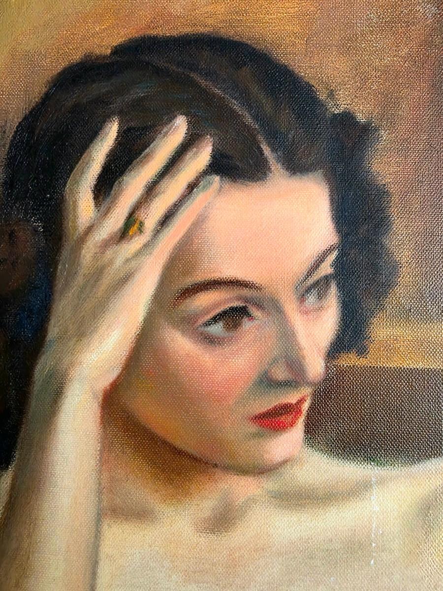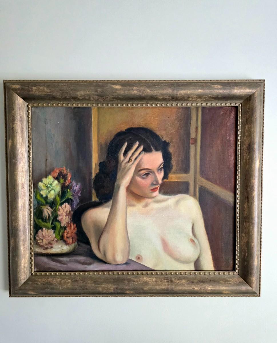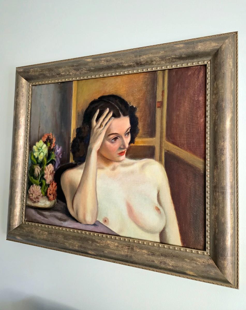 by Grand Junction, CO artist, Ruth G. Moss (1916-2011) is exceptionally beautiful. It truly warrants appreciation. Ruth started with sculpting and works with clay in high school and pursued her education At John Herron Art Institute in Indianapolis, IN and then Students Art Legue in New York City. She was a founding member of the Western Colorado Center for Arts, as well as a long-time member of Altrusa. She favored landscape and portrait paintings. After viewing several of her works, I am in awe! In spite of its vintage classification, I find her art to be surprisingly relevant and modern. Frame measures 27"L x 23"H.