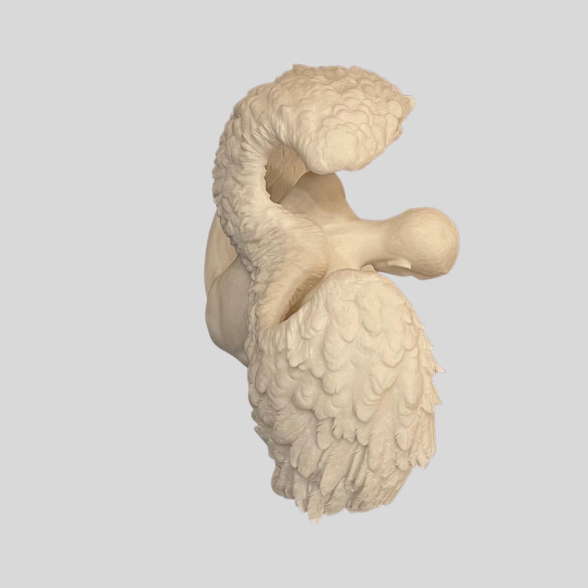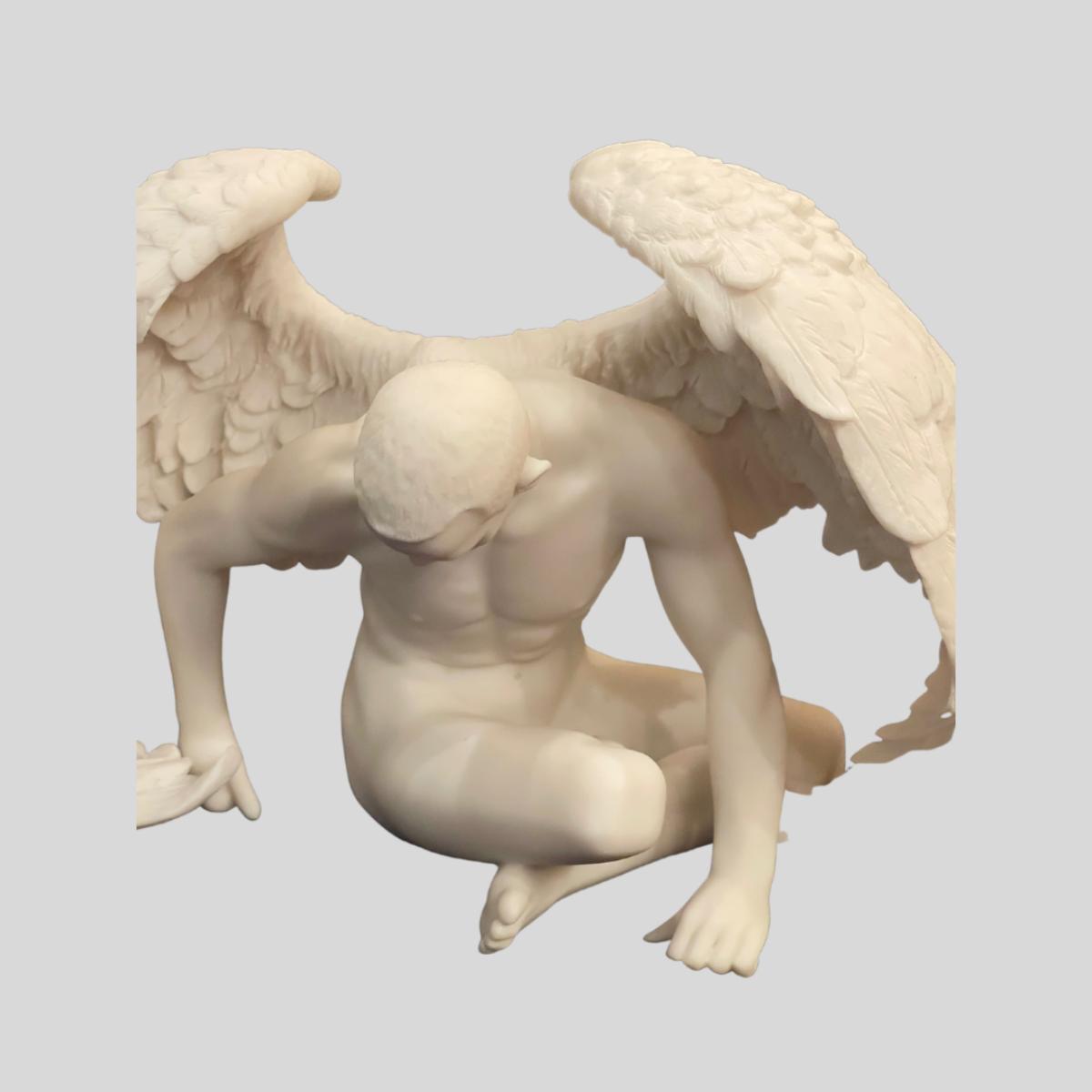 This pensive male angel looks down as he intensely surveys the mortal world below him. This figure is cast with exquisite detail in the feathered wings and muscular contours of the angel`s body.