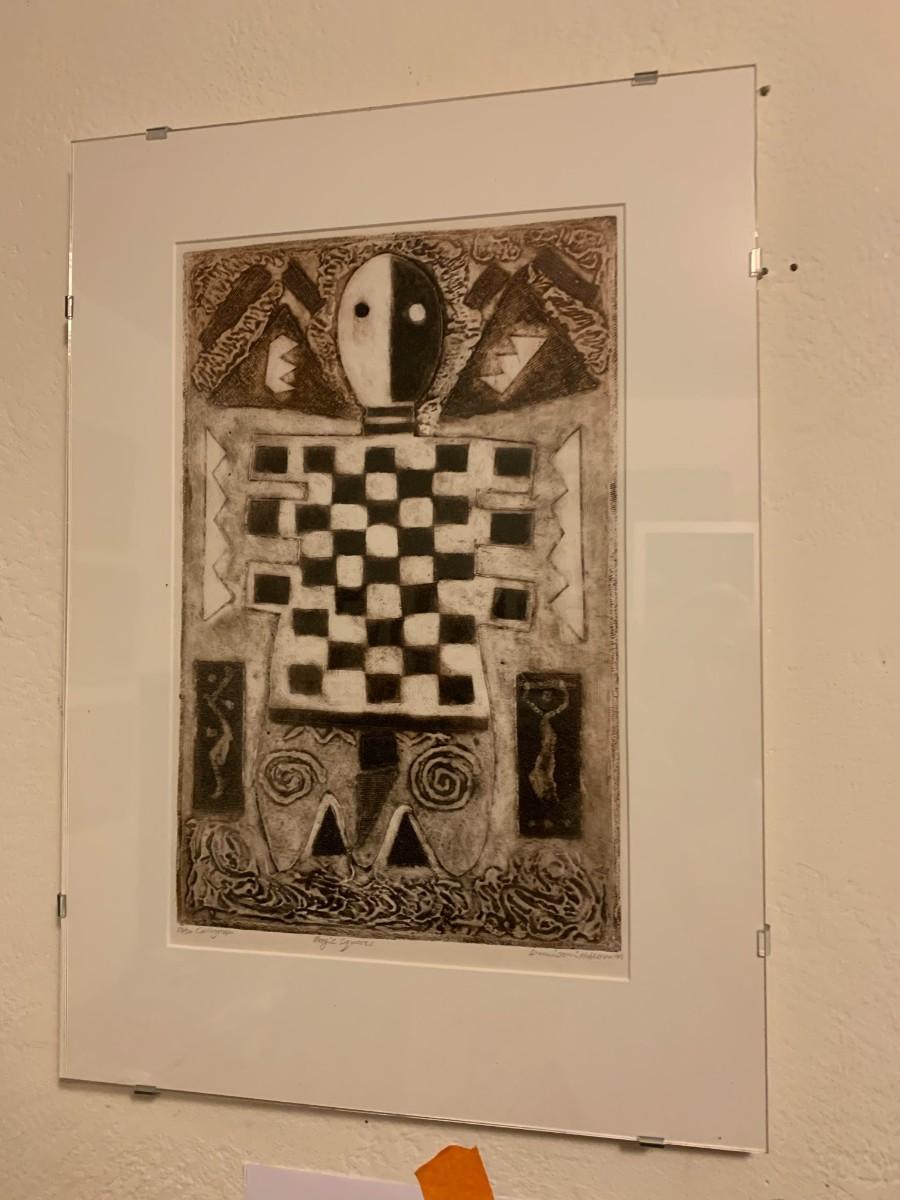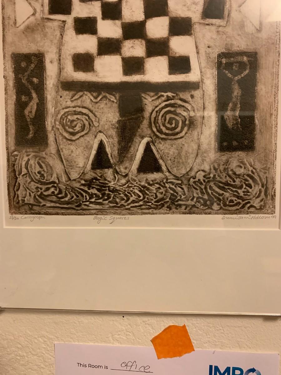 1999 collograph "Magic Squares" matted in glass. 14.5x20.5"