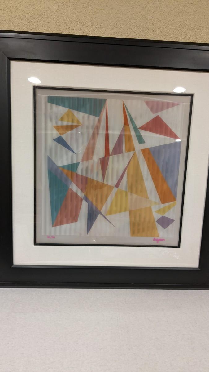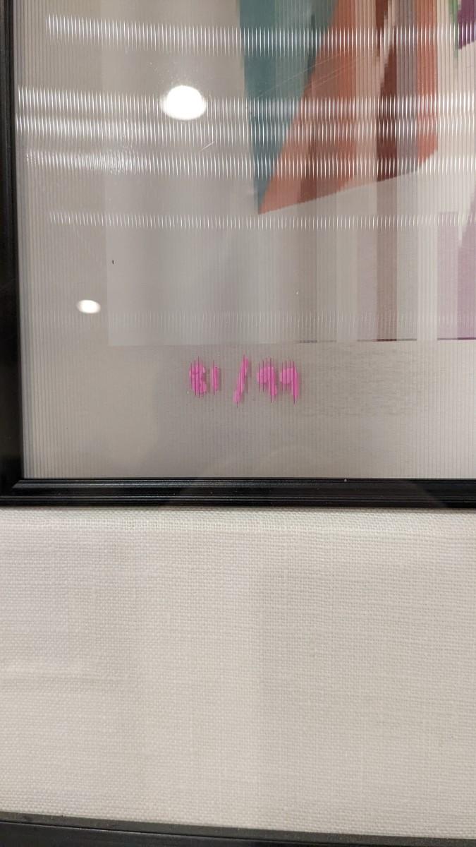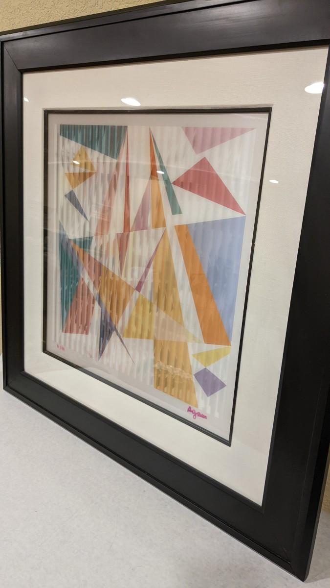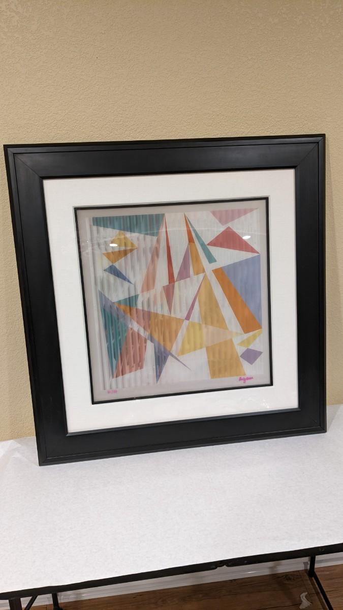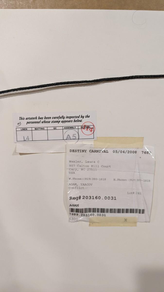Yaacov Agam is an Israeli sculptor and experimental artist widely known for his contributions to optical and kinetic art. This 81/99 numbered and signed piece from 2008 titled "Destiny Carnival" is a beautiful example of such work. With a lenticular optical from one side this piece looks completely different from the other side. Professionally framed with museum quality glass, linen mat and black fillet this piece is PHENOMENAL and an amazing piece to own from the number one selling artist! Outer dimensions at 32"x32", please note one corner has ever so slight chip, located on top, so easily hidden with clever hanging.