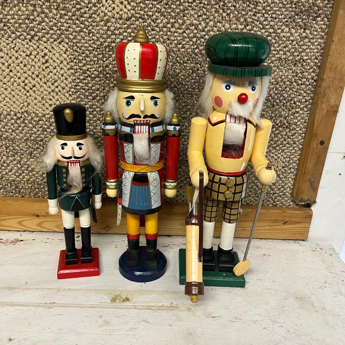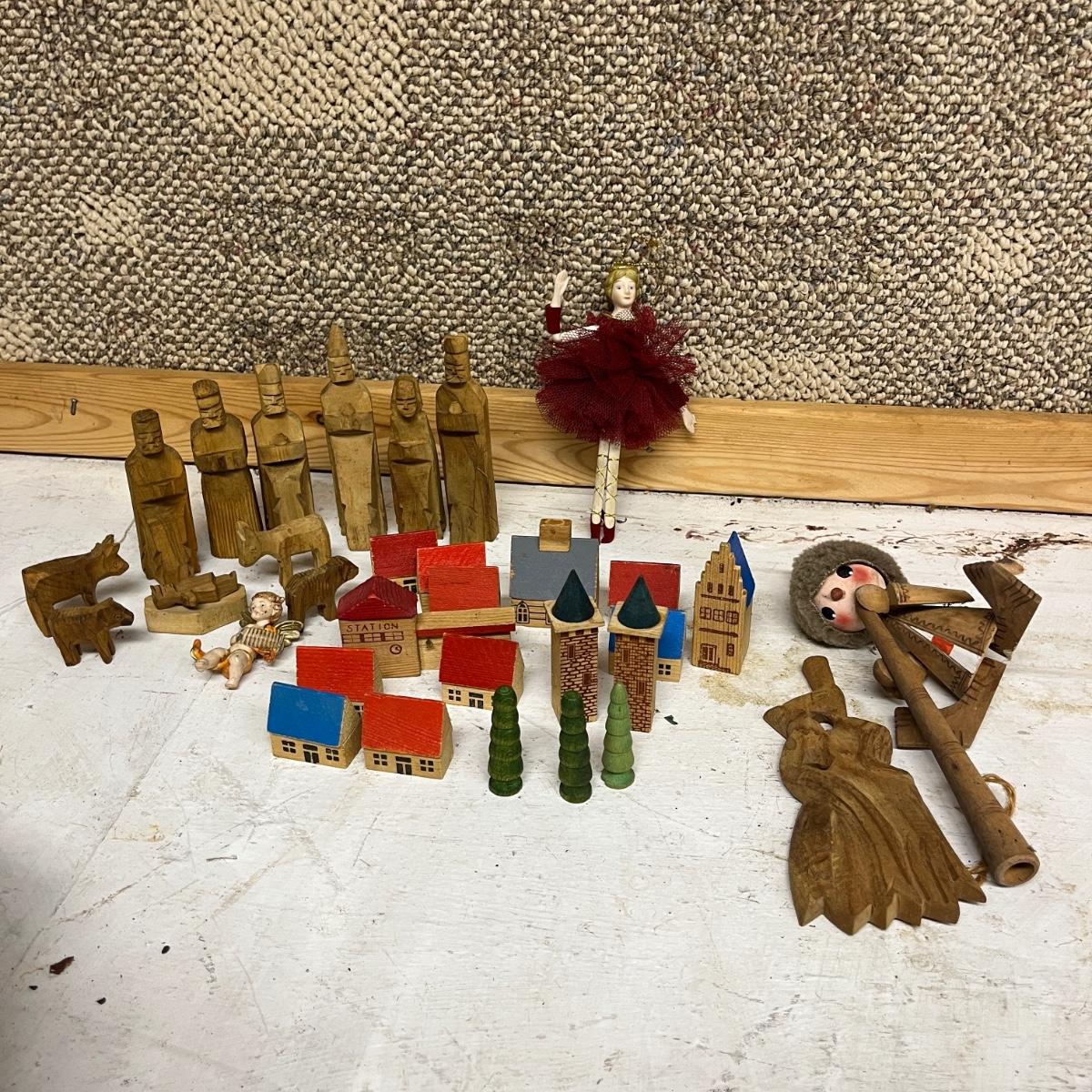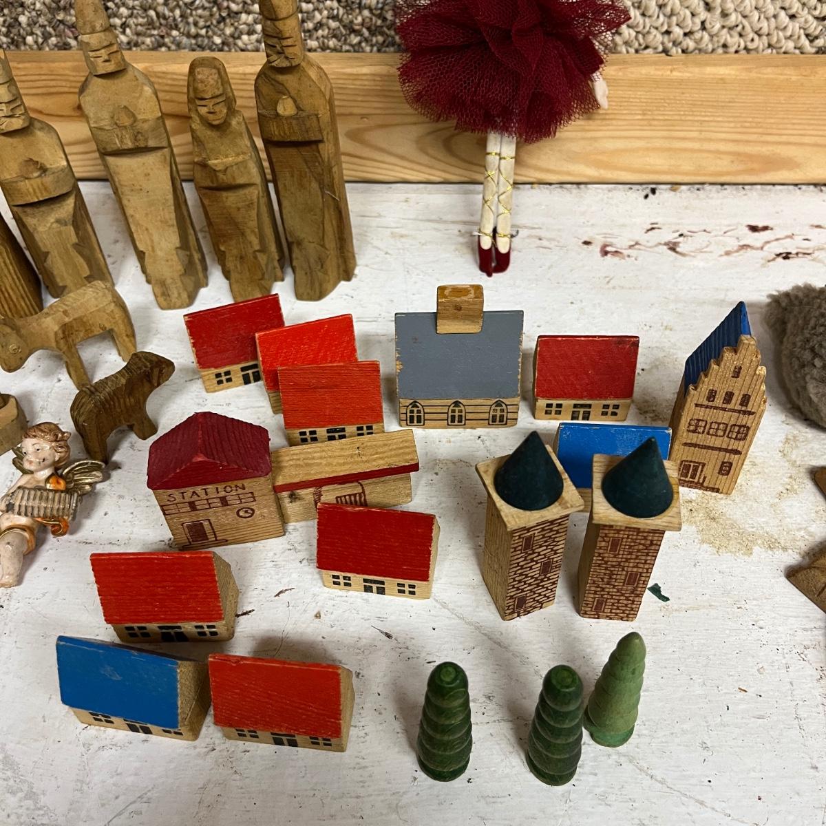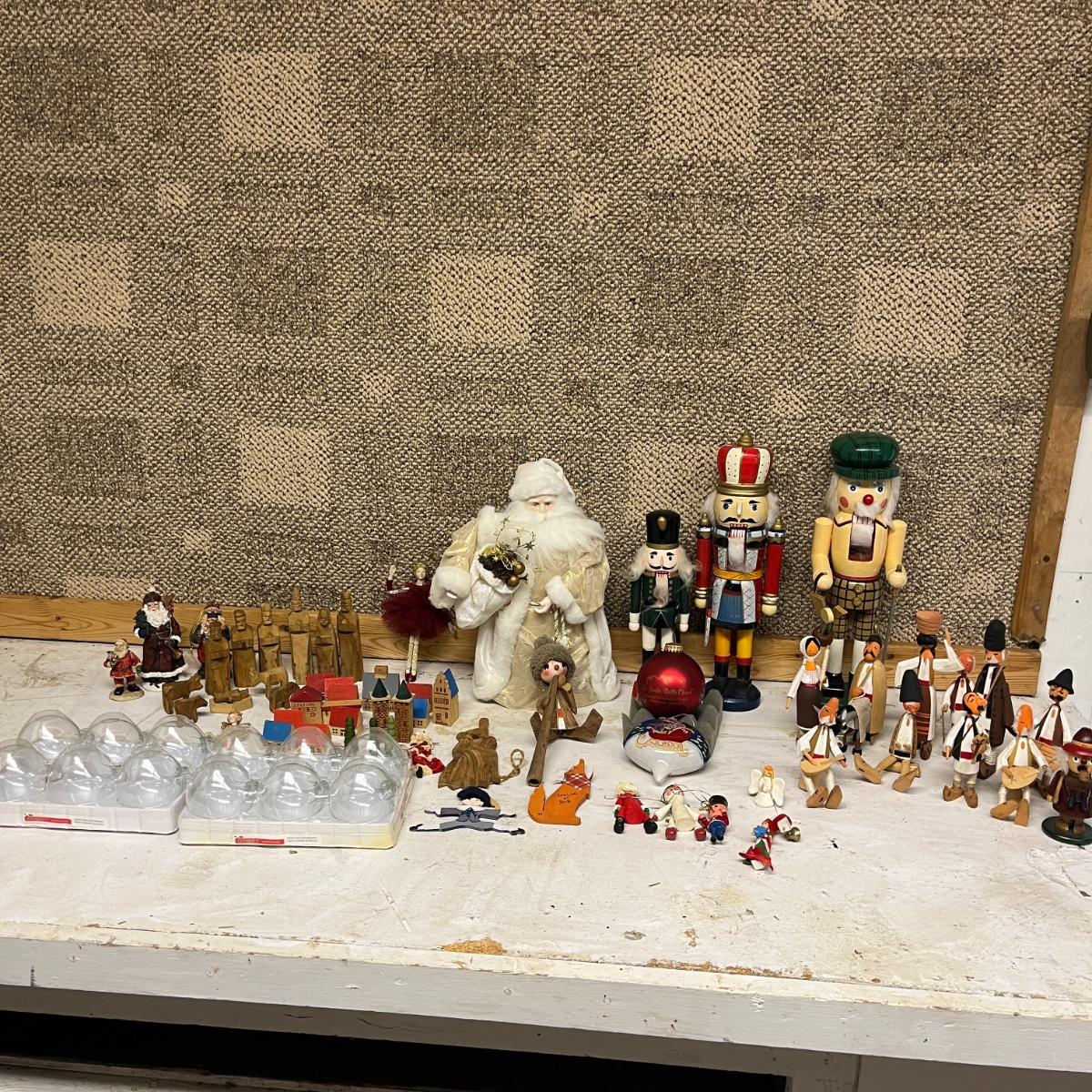Lot includes three wooden nutcrackers, tree topper, 12 craft ornaments, selection of wooden nativity pieces, Santa resin figurines and more. Largest nutcracker measures 5” x 3” x 14”H.