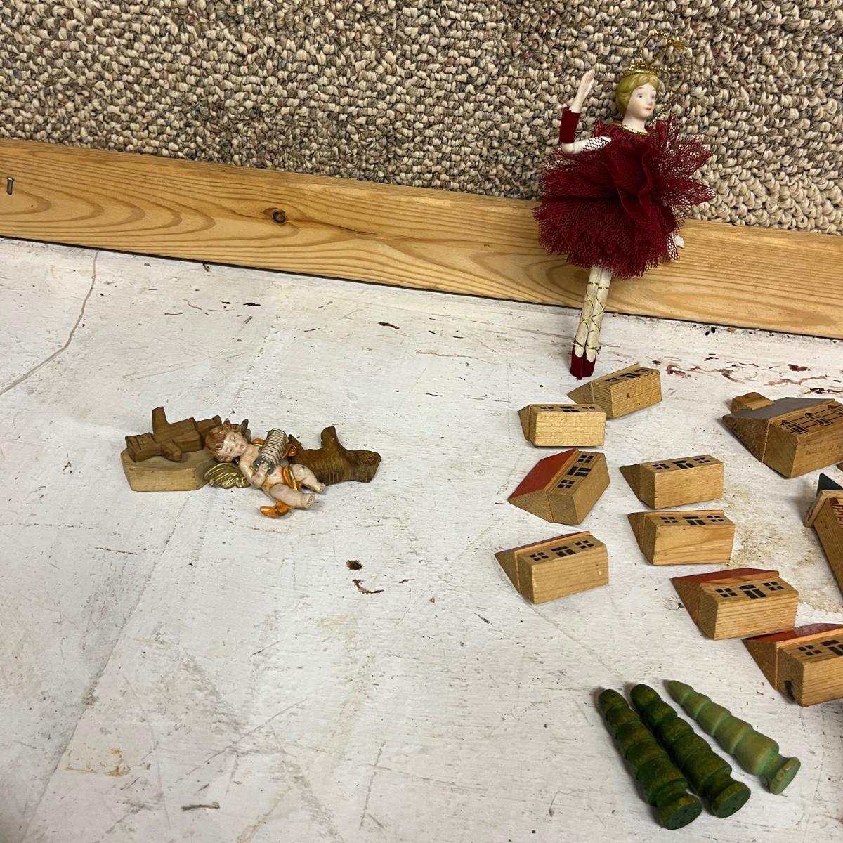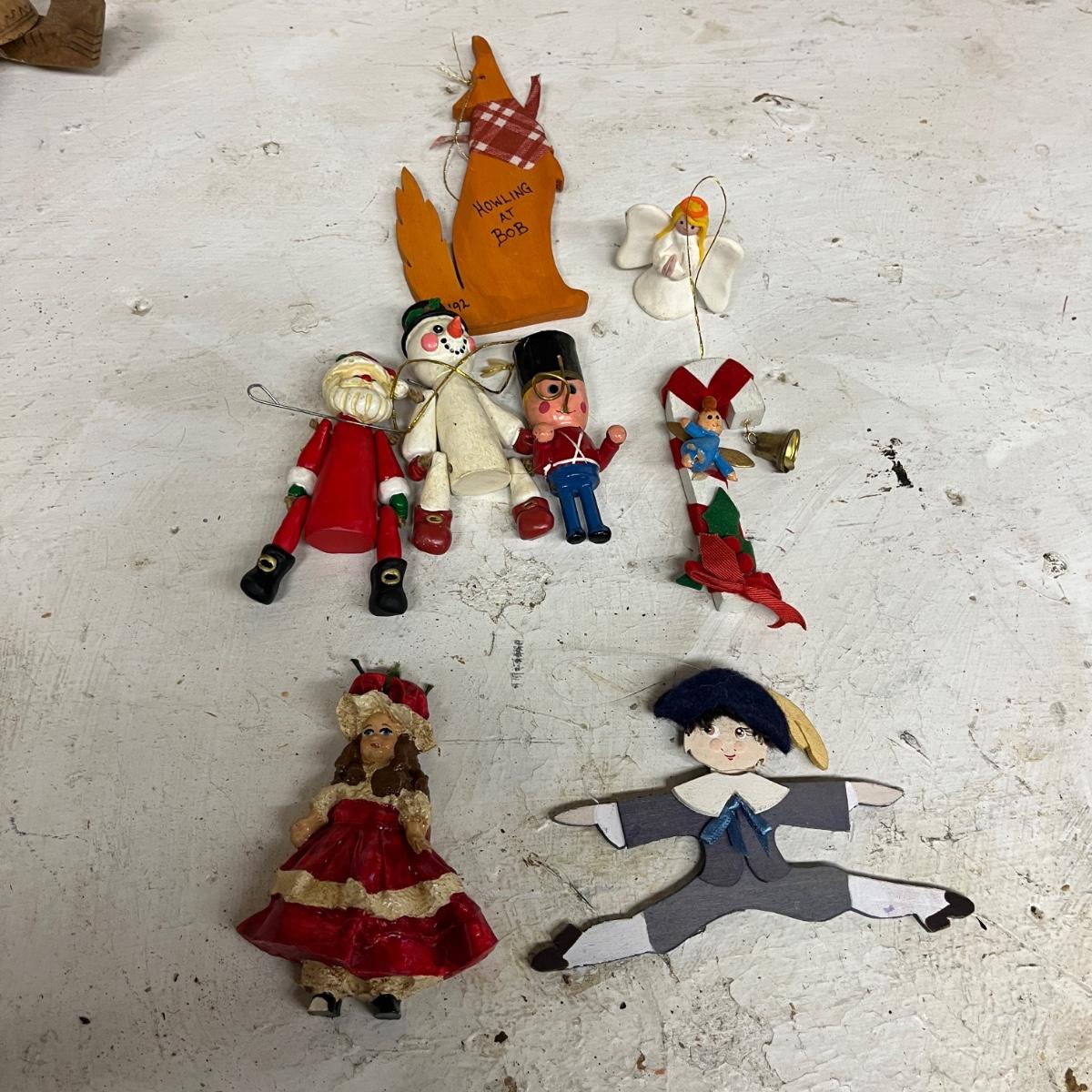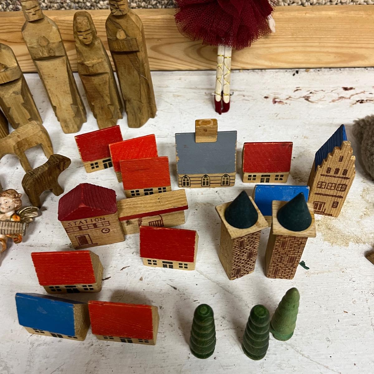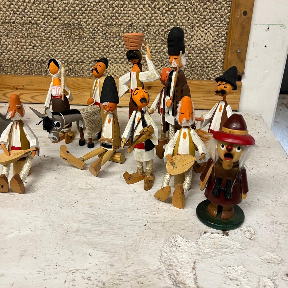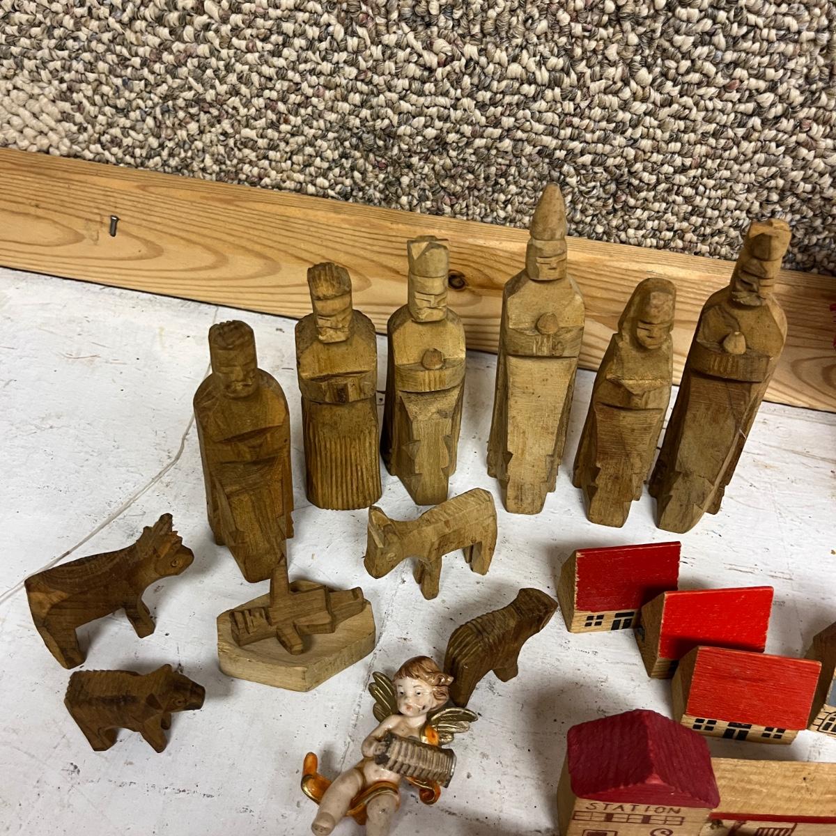 Lot includes three wooden nutcrackers, tree topper, 12 craft ornaments, selection of wooden nativity pieces, Santa resin figurines and more. Largest nutcracker measures 5” x 3” x 14”H.