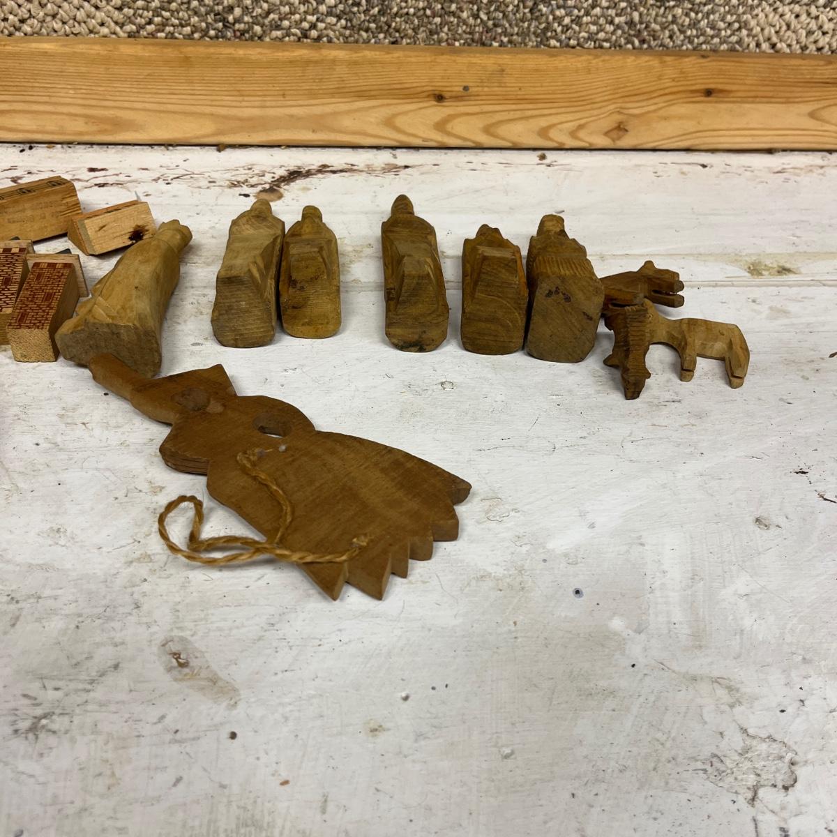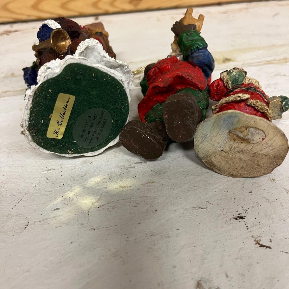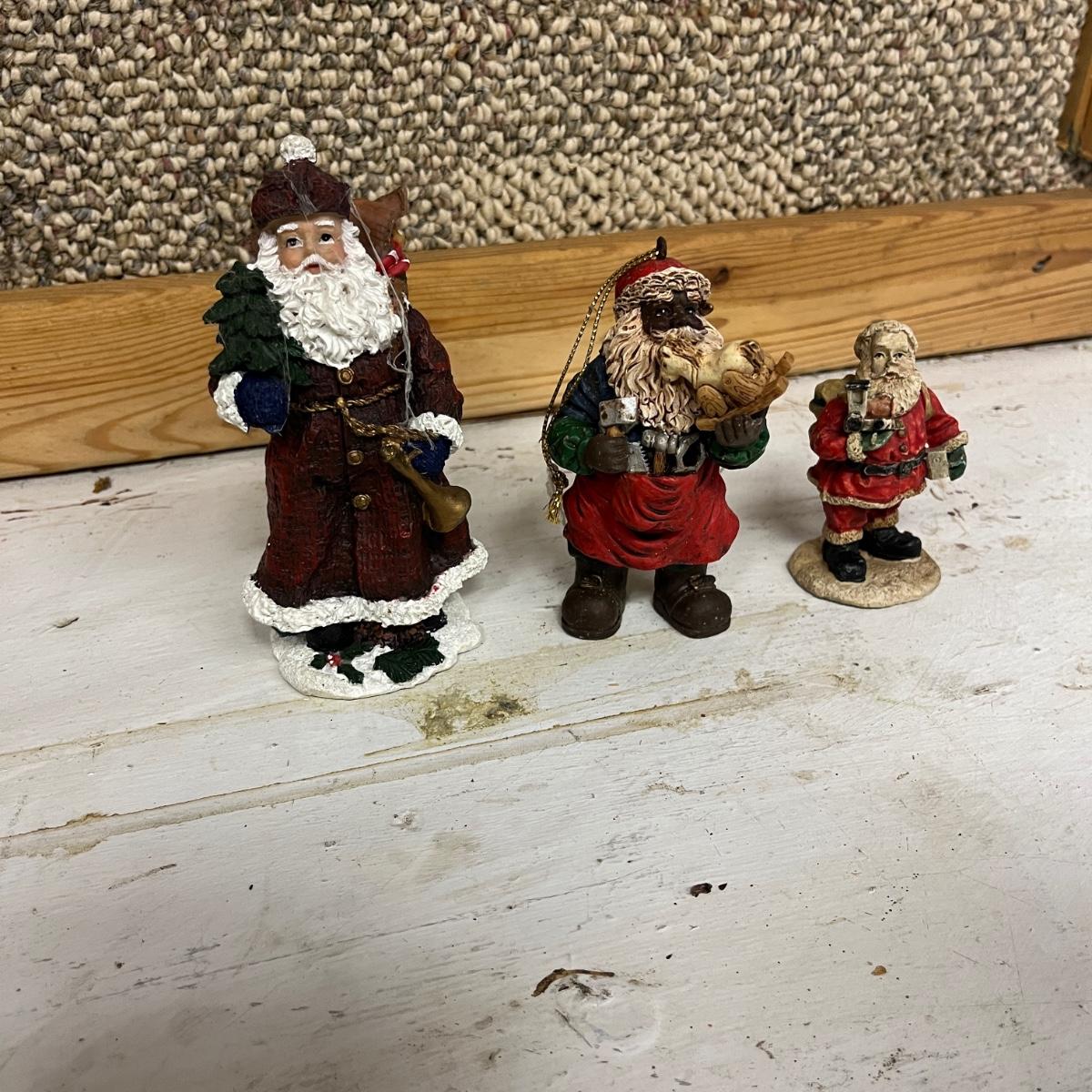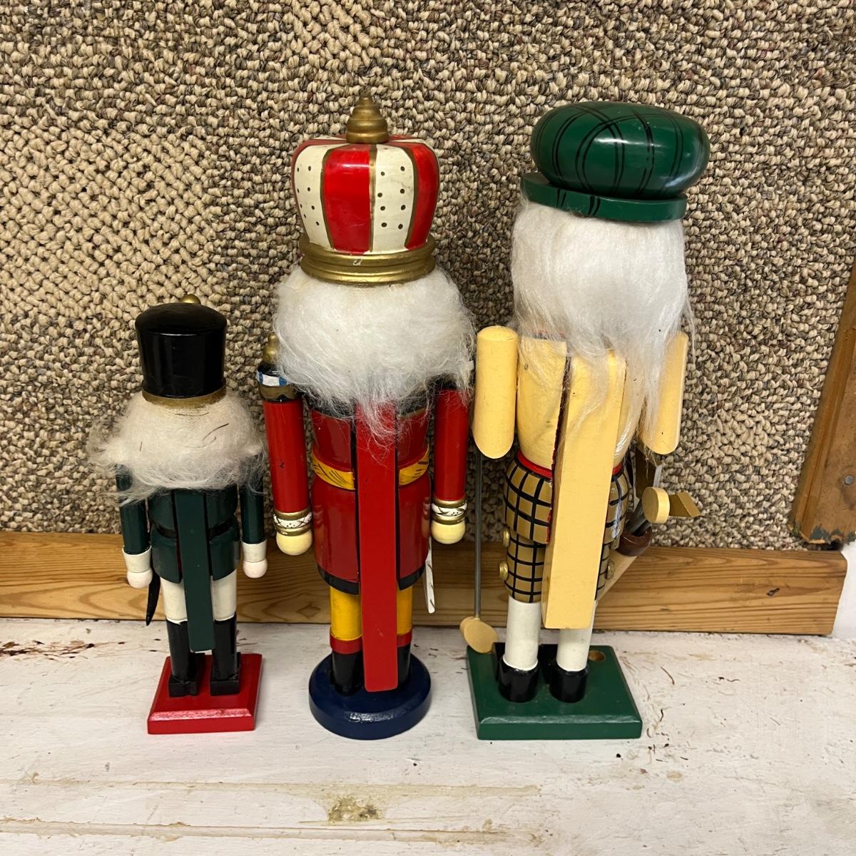 Lot includes three wooden nutcrackers, tree topper, 12 craft ornaments, selection of wooden nativity pieces, Santa resin figurines and more. Largest nutcracker measures 5” x 3” x 14”H.
