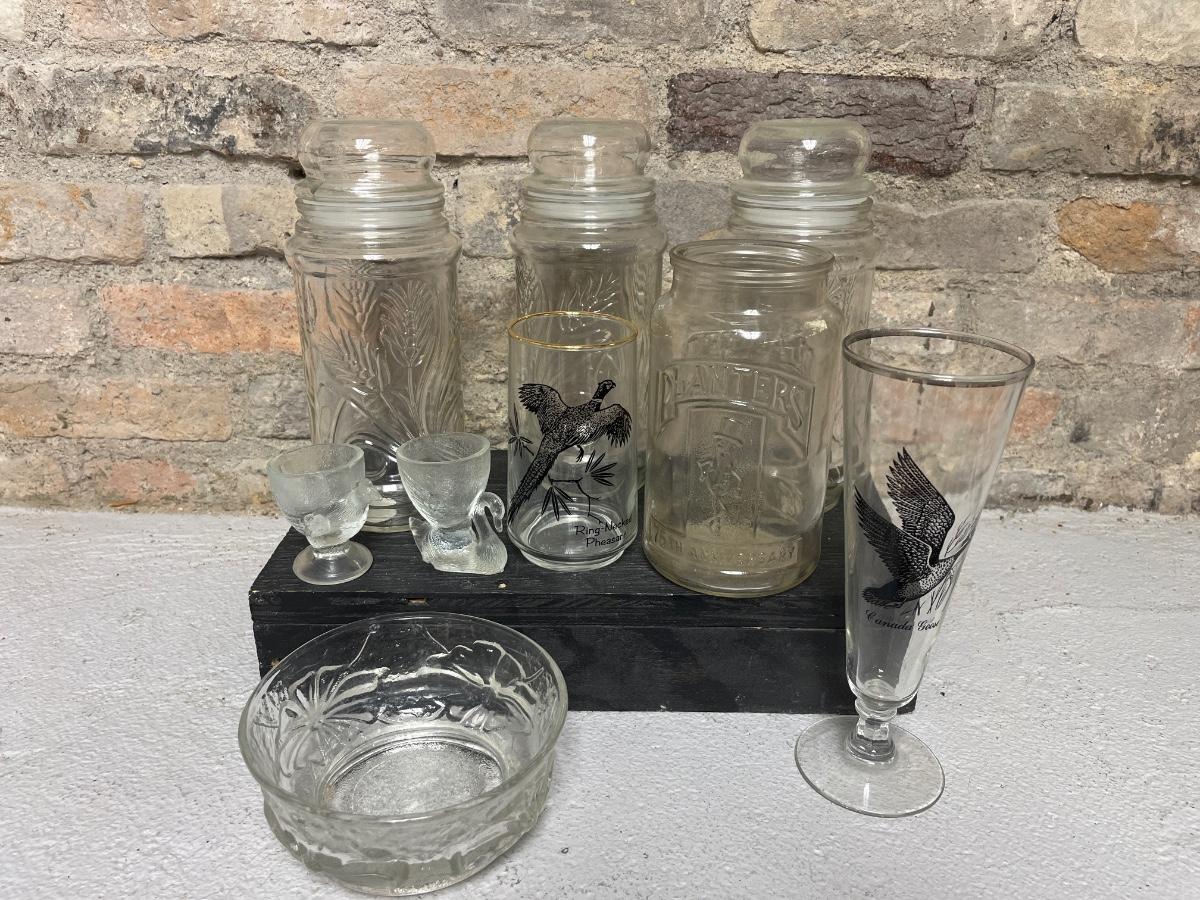 Vintage Planter’s Peanuts containers, wildlife drinking glass and Pilsner glass, nut/candy dishes and swan & rooster egg cups