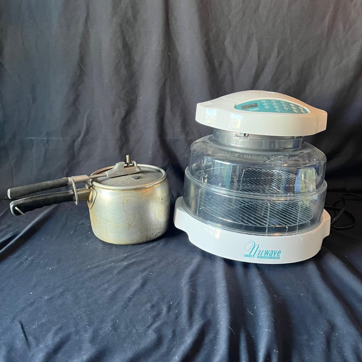 Lot includes a Nuwave Pro infrared oven that powered on when tested and a Wear-Ever model # 3604 pressure cooker. Oven measures 15”D x 13” tall.
