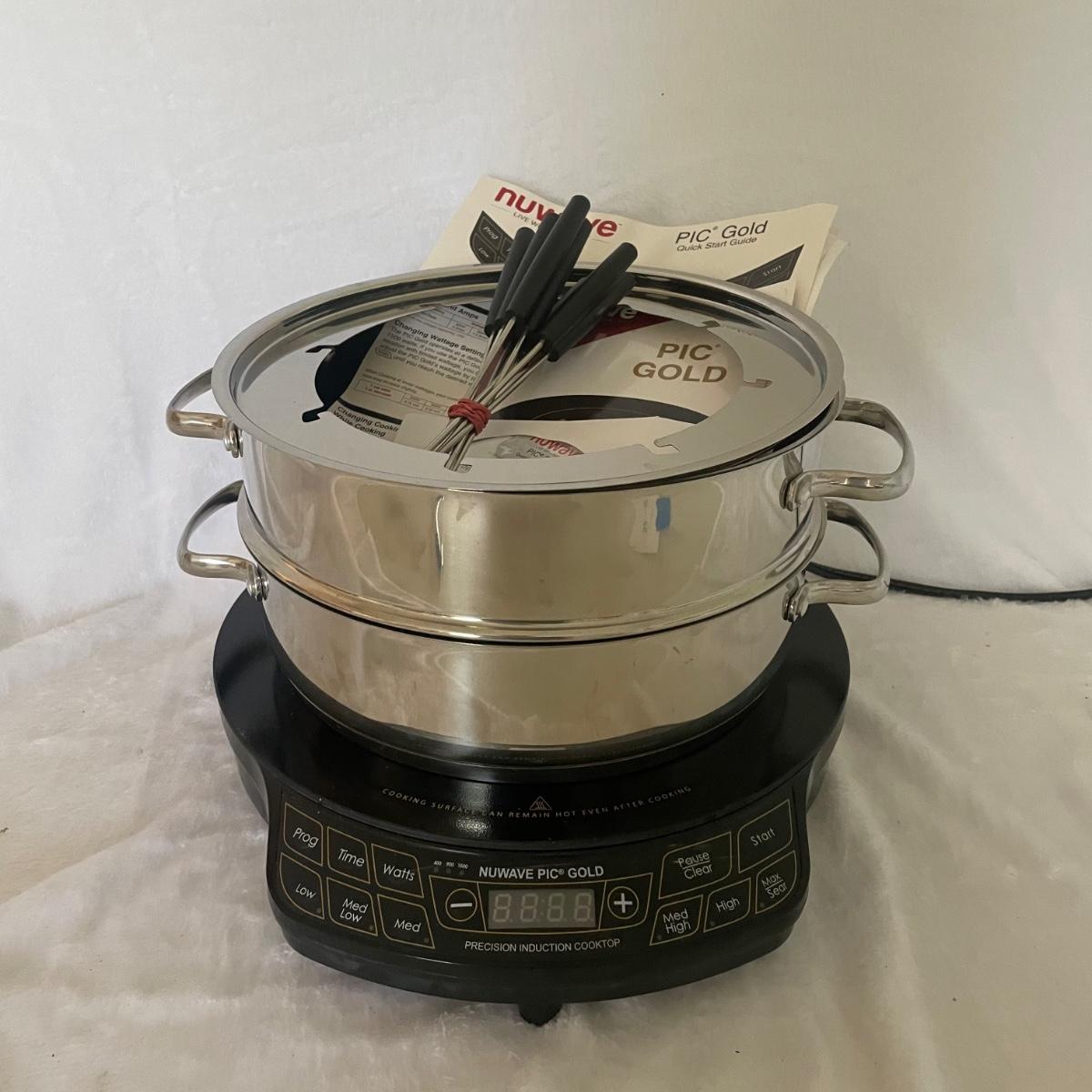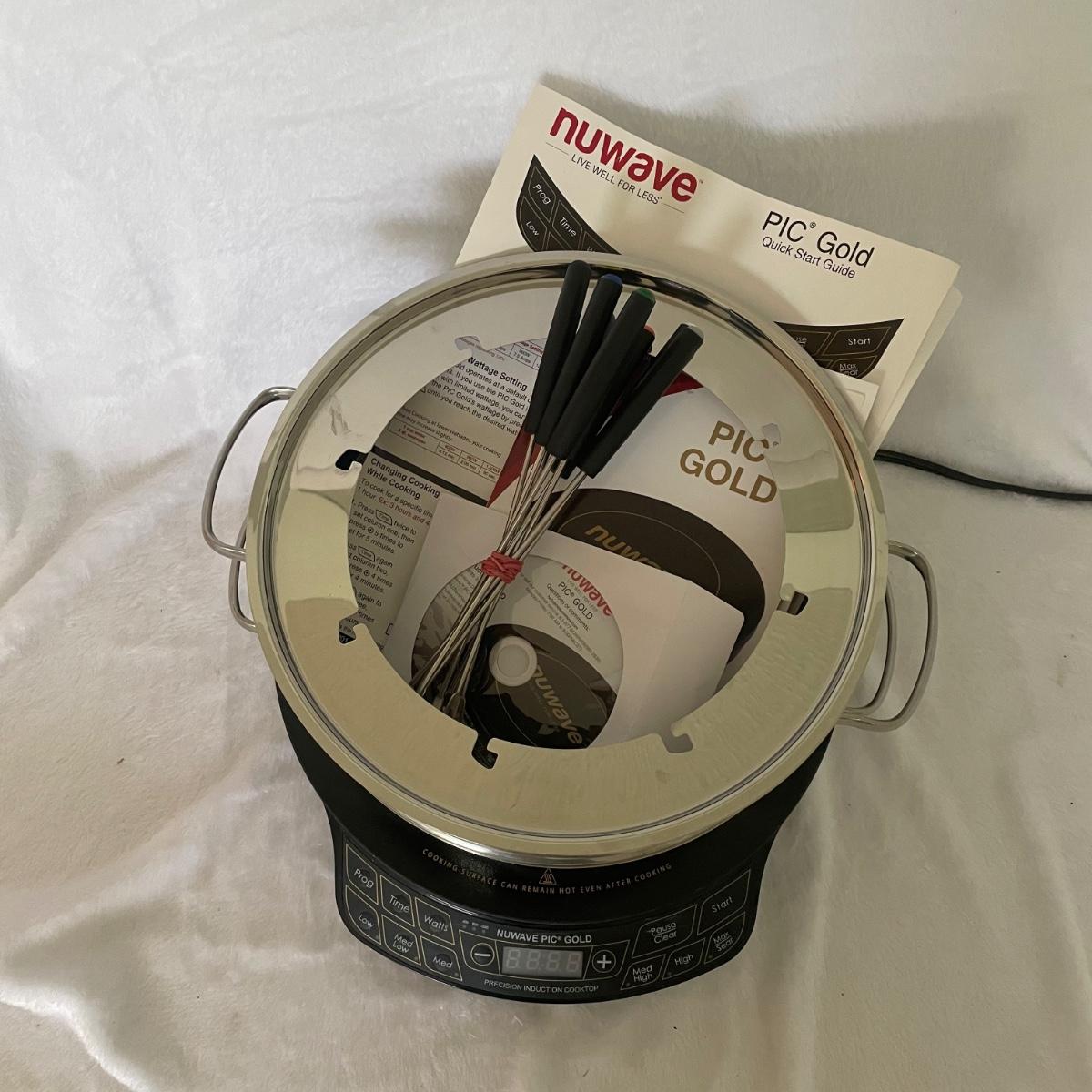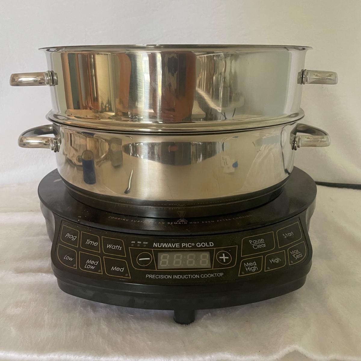 Nuwave Ultimate Cookware Set is in great condition. Powers on when plugged in. Comes with several separate appliances. Measures at 8” H all put together.