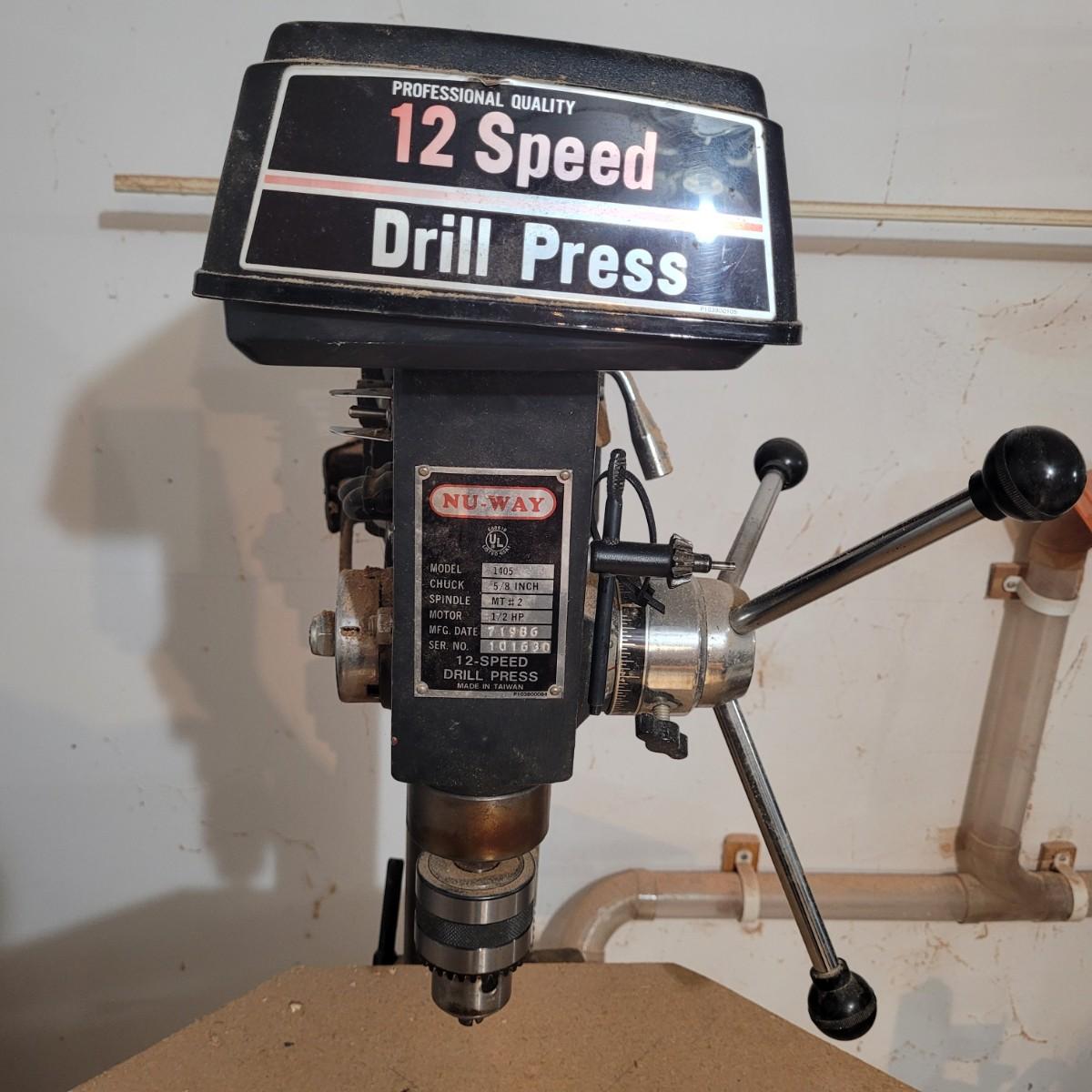 Nu-Way brand twelve speed drill press. 1/2 horsepower with 5/8" chuck. Powers on and appears to be in working order. Item measures approximately 24" x 25" x 65"H.