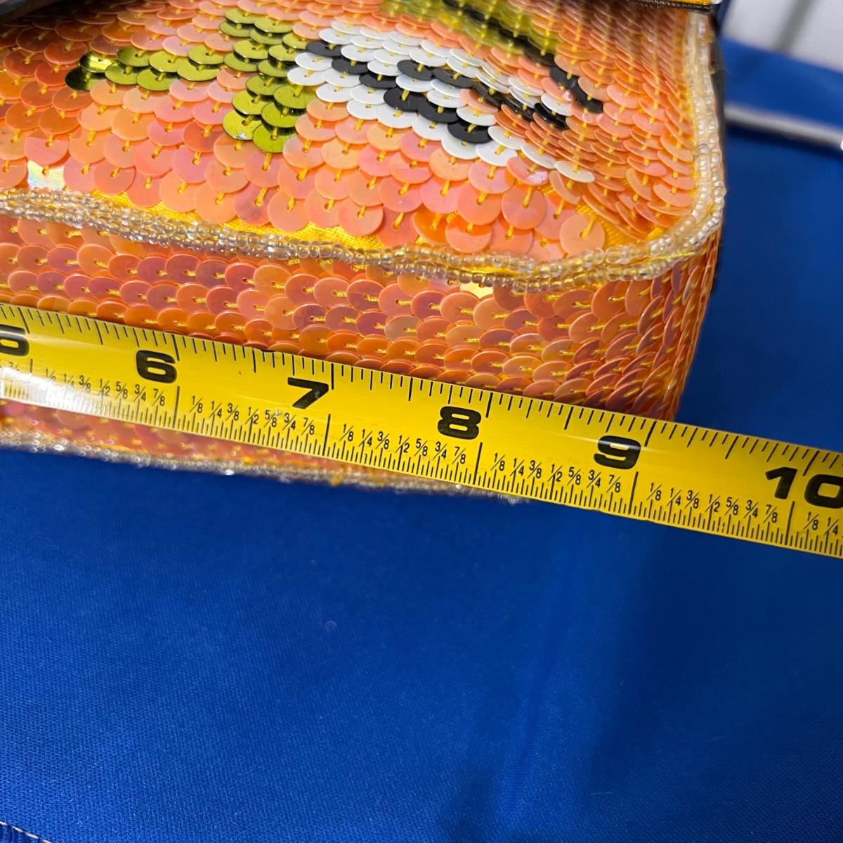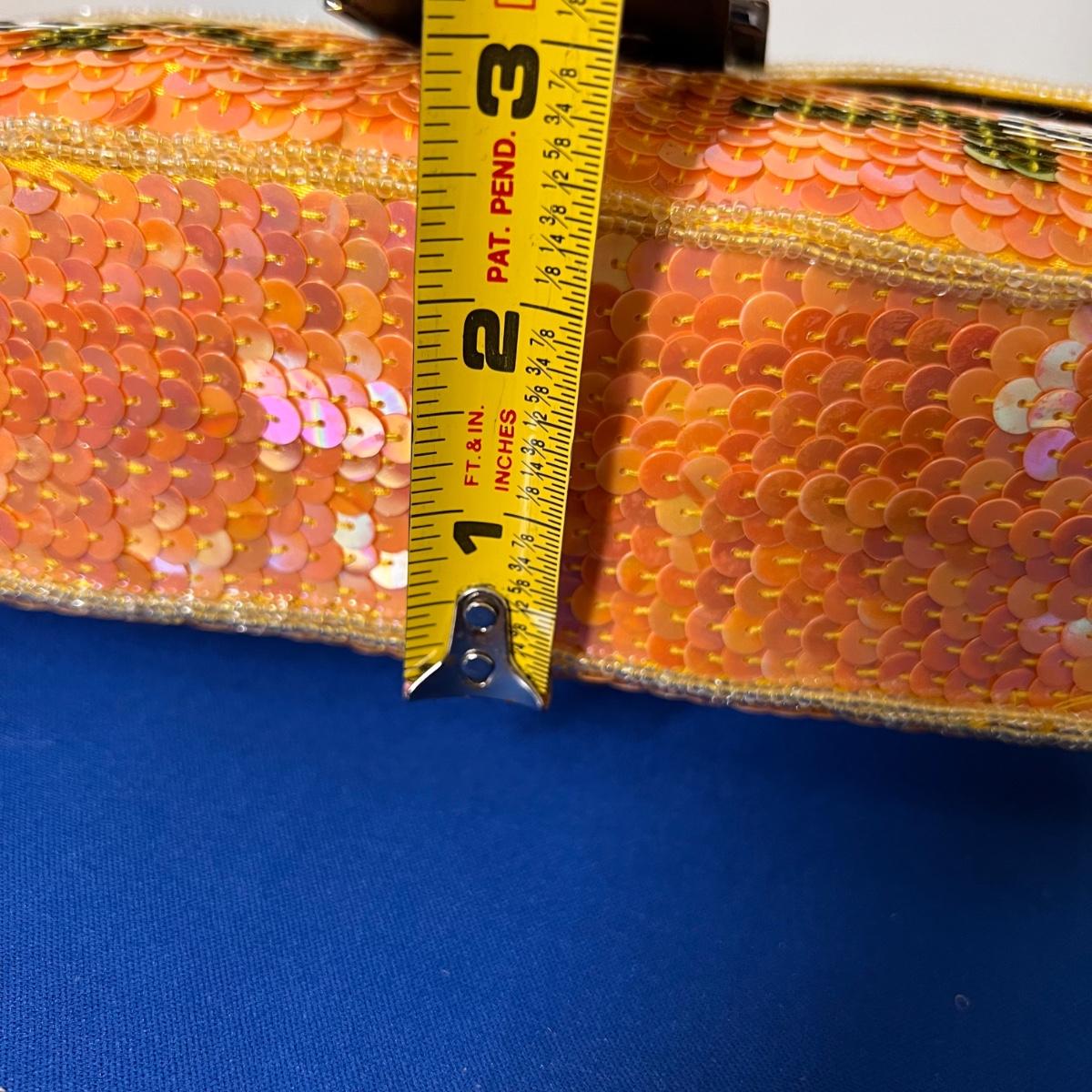 Color: orange with multicolored sequin, maroon snake strap, dark gunmetal gray hardware and adornment