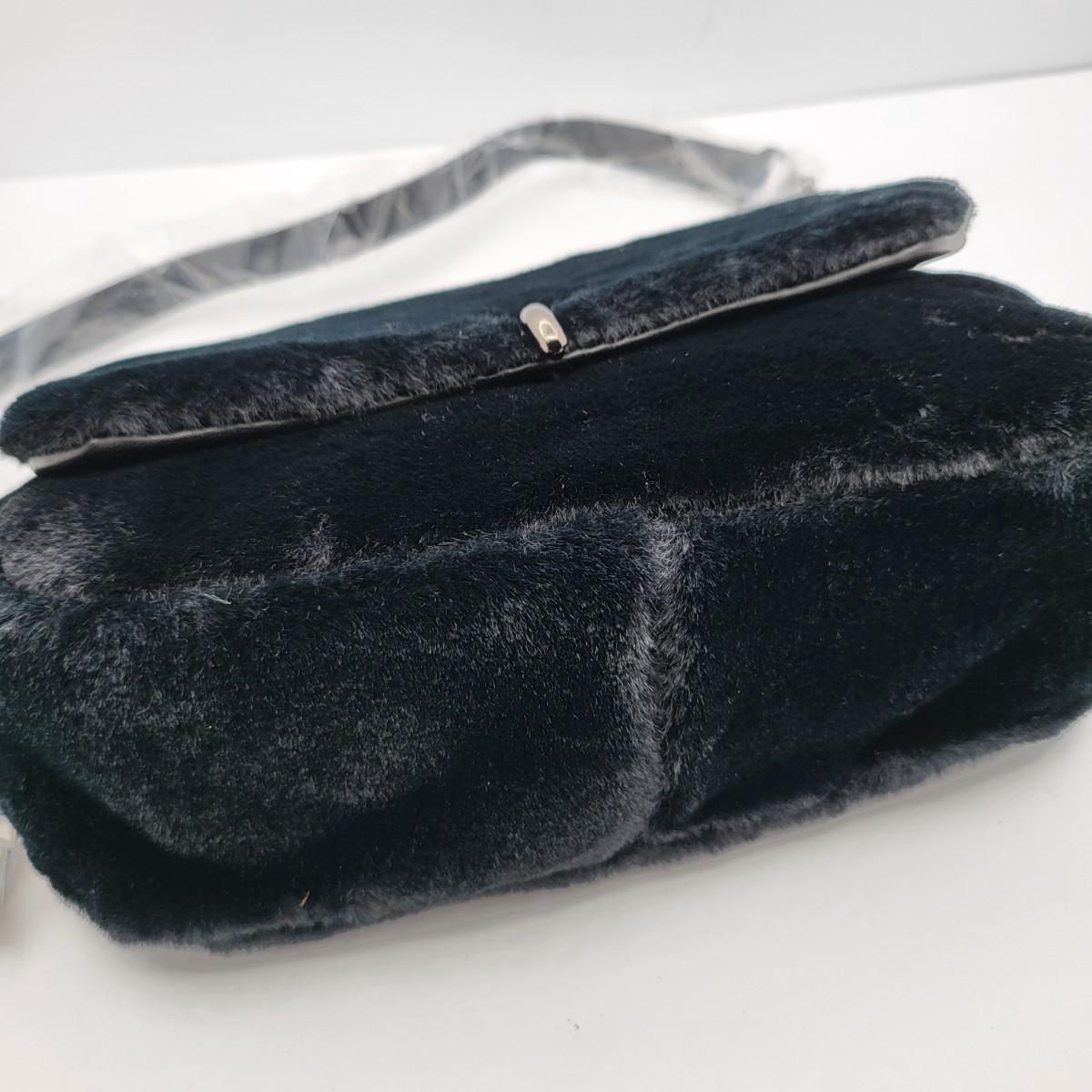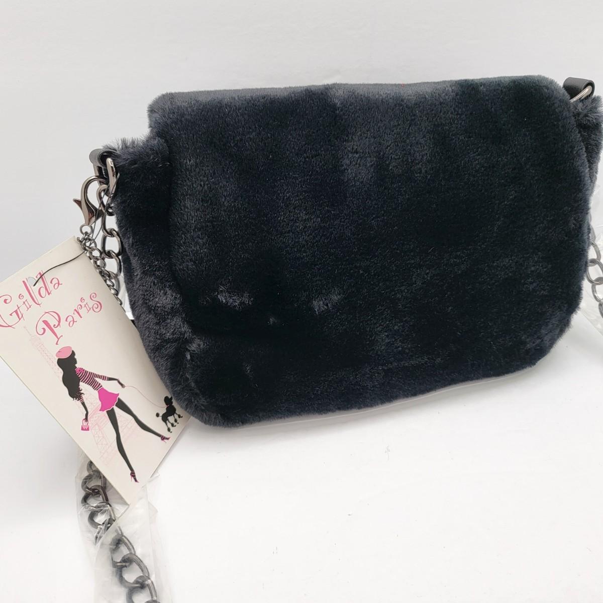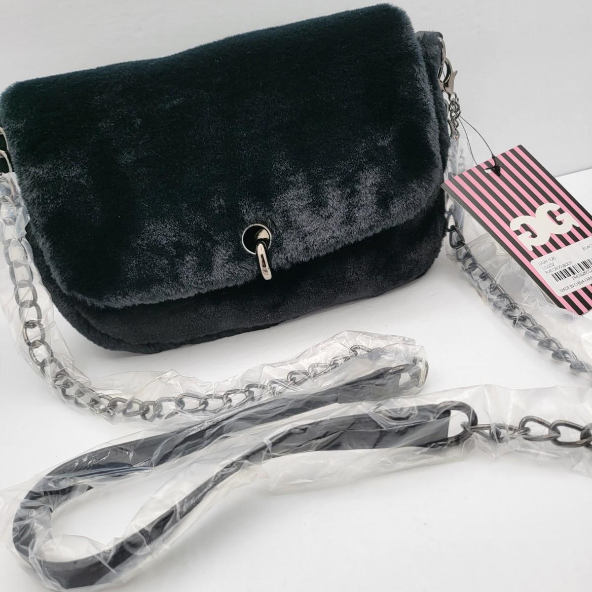 Gilda Paris soft fuzzy, faux black fur. Chain and faux leather crossbody strap (original plastic wrapped). Bag measures 9" x 6.5" x 3". Unique twist clasp closure. MSRP $129.00