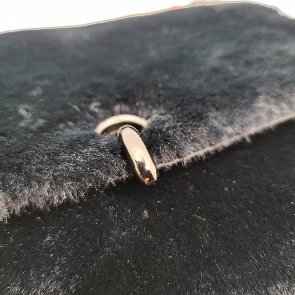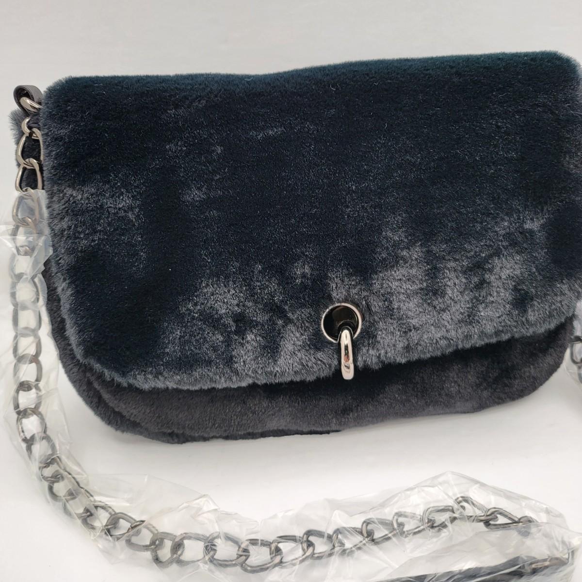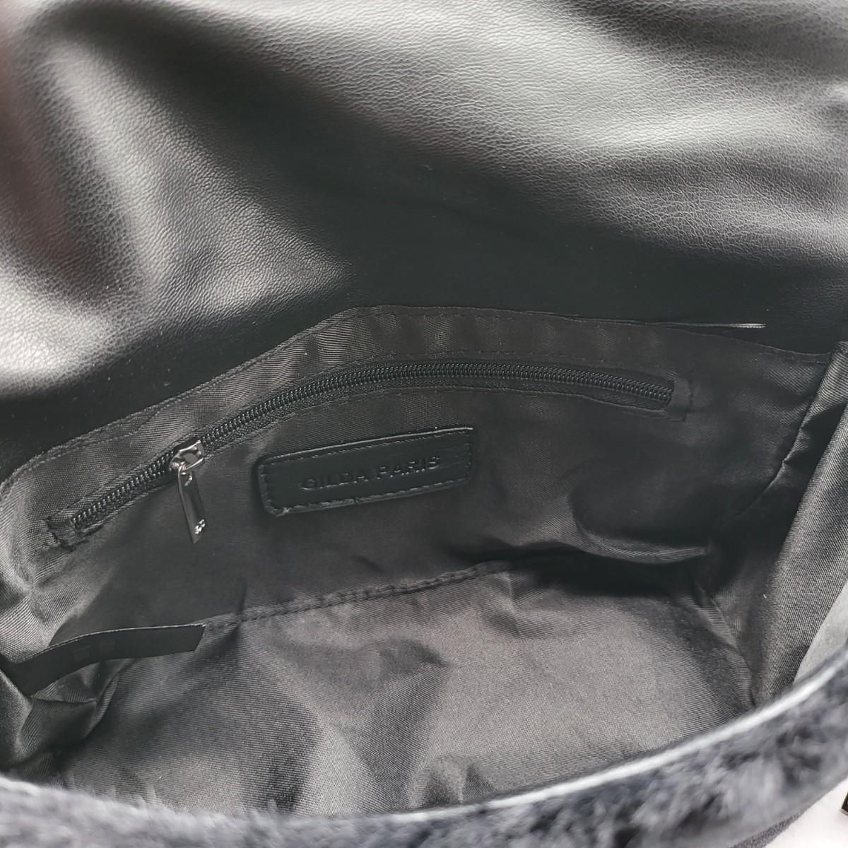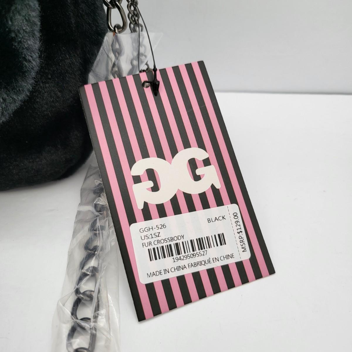 Gilda Paris soft fuzzy, faux black fur. Chain and faux leather crossbody strap (original plastic wrapped). Bag measures 9" x 6.5" x 3". Unique twist clasp closure. MSRP $129.00