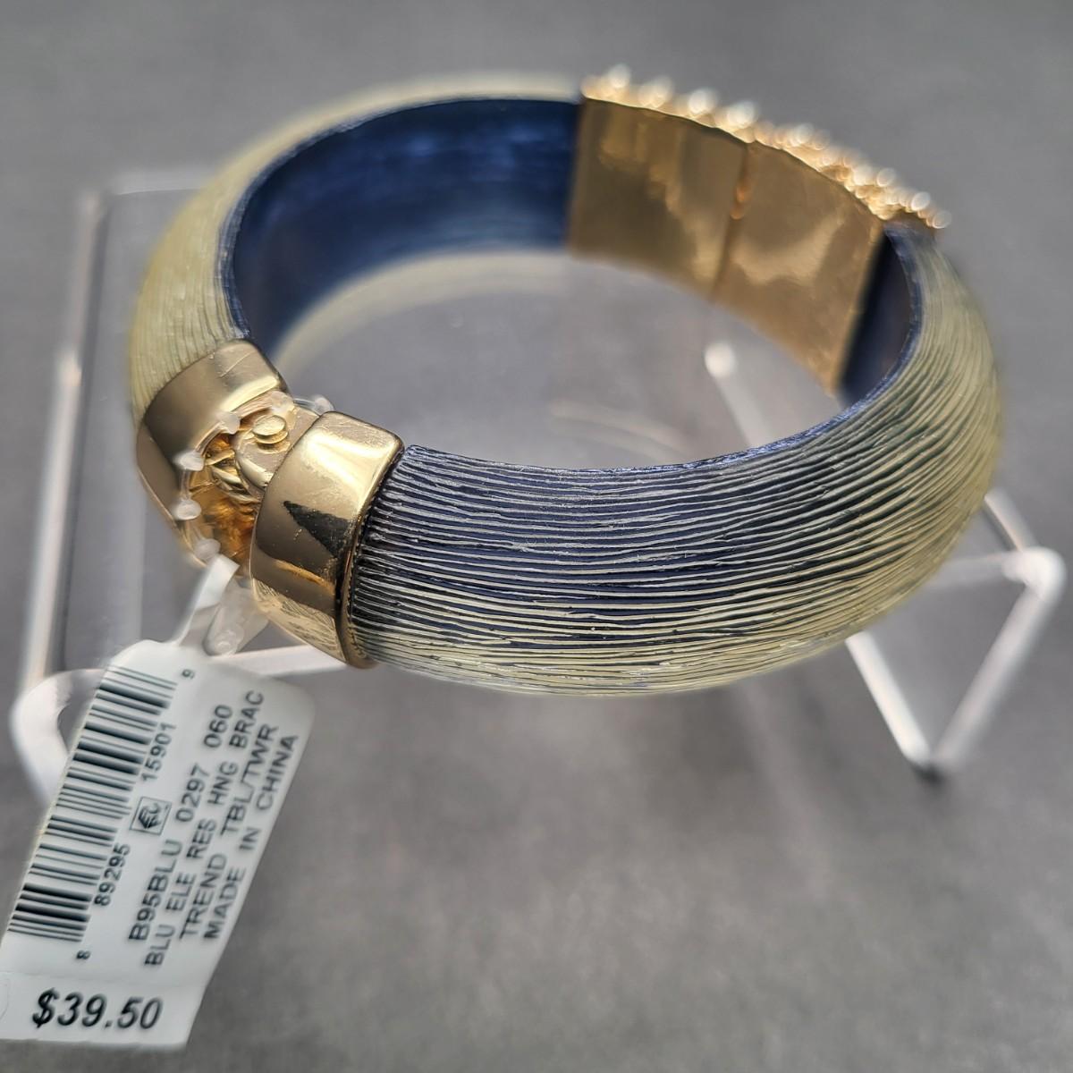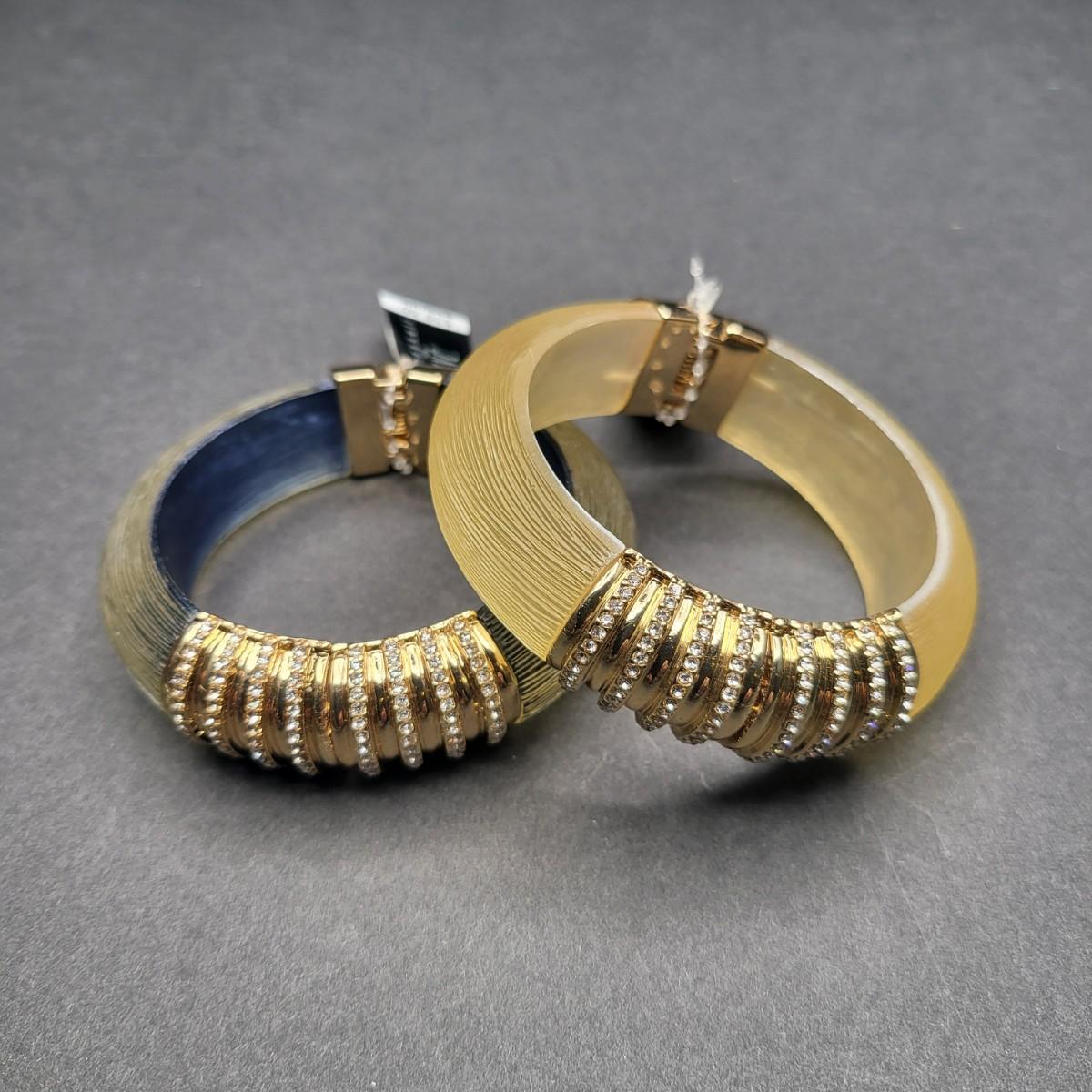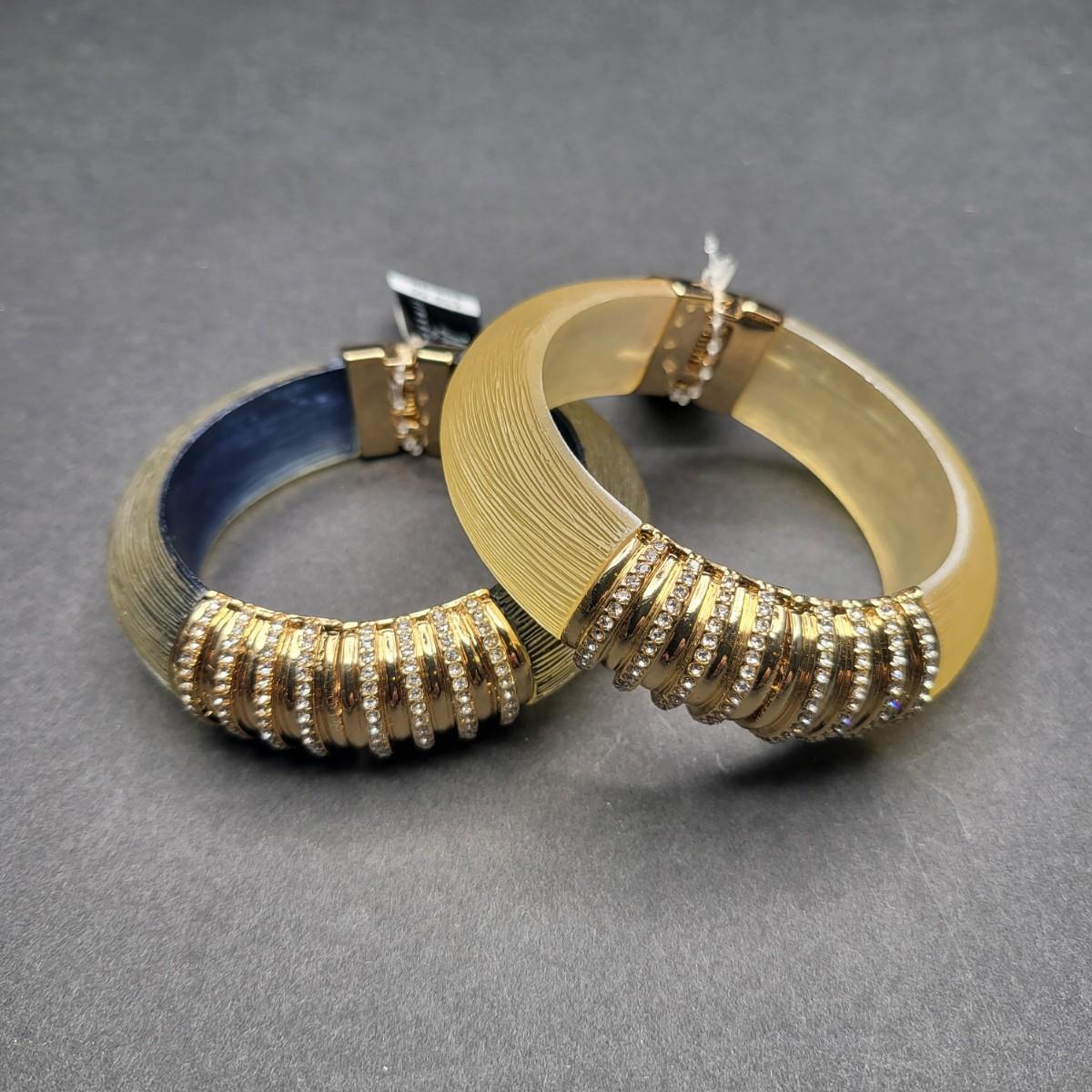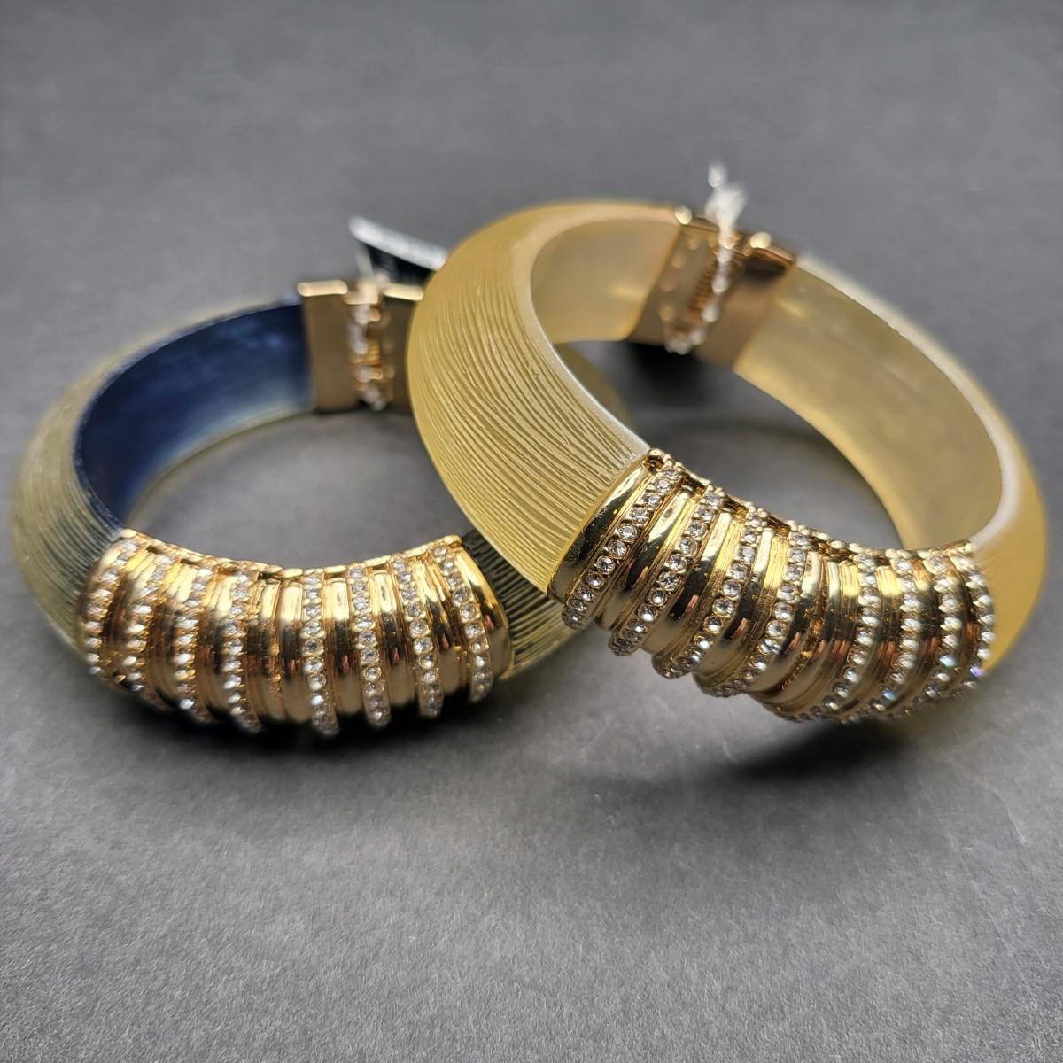 New with tagsBlue and yellow, thick acrylic, clear rhinestone, gold tone clamp-style bracelets. Original tags.