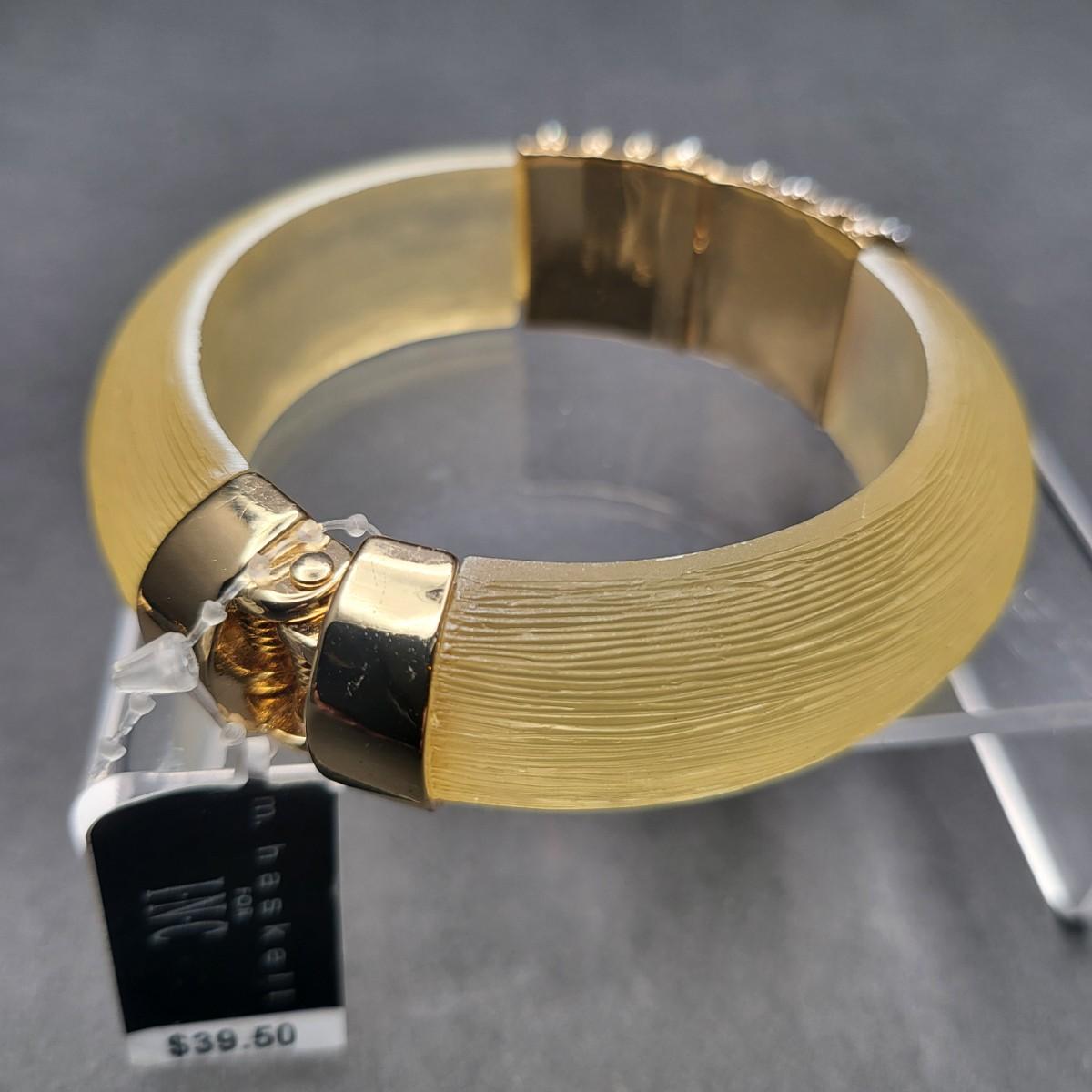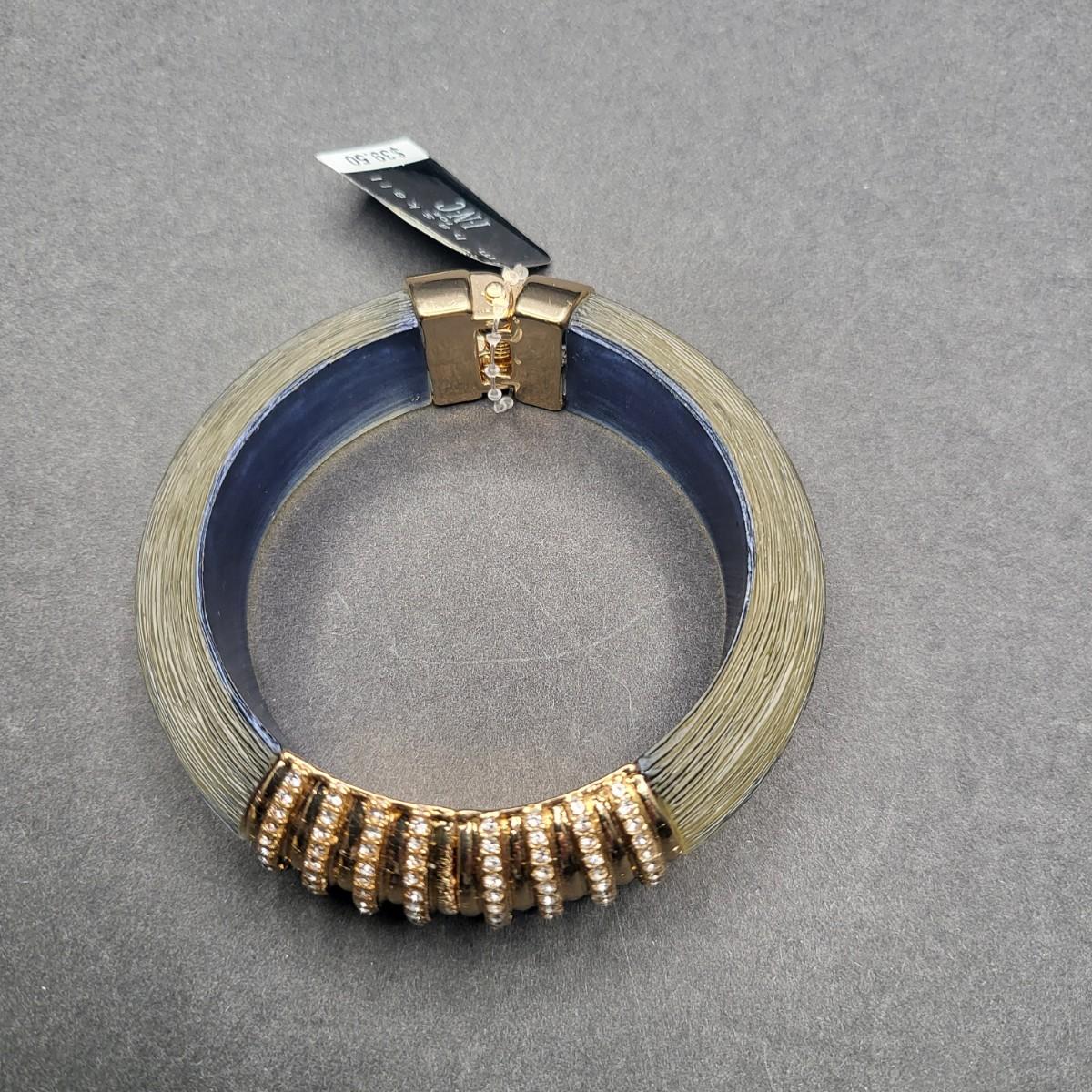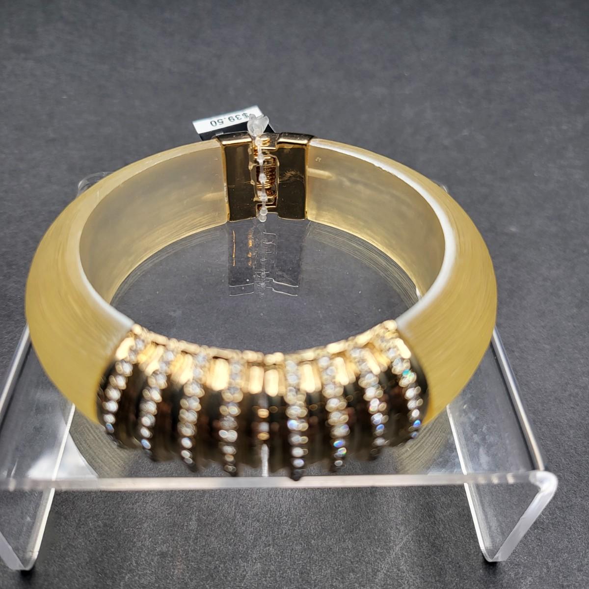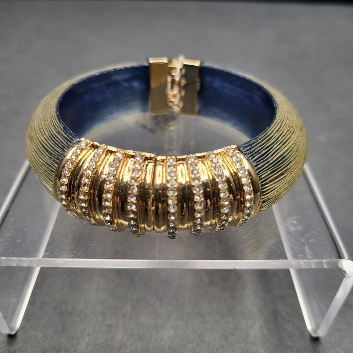 New with tagsBlue and yellow, thick acrylic, clear rhinestone, gold tone clamp-style bracelets. Original tags.
