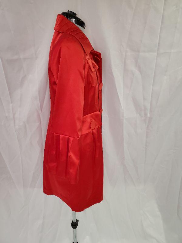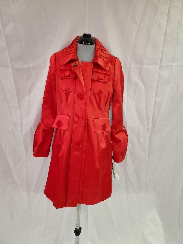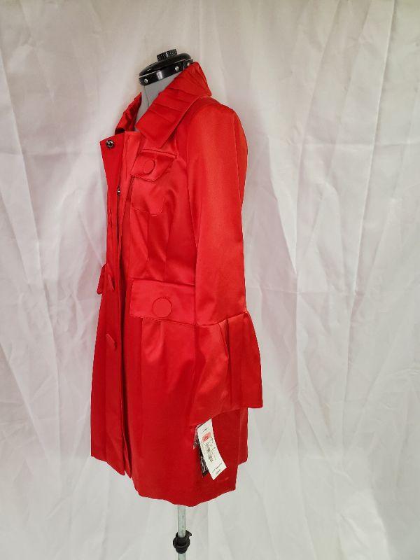 This coat has a slight flaw but with a little TLC could be fixed and would look as good as new! The top button back has pulled off the coat. Size 8. Tags attached with extra buttons included.