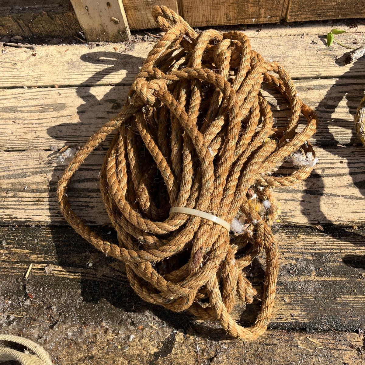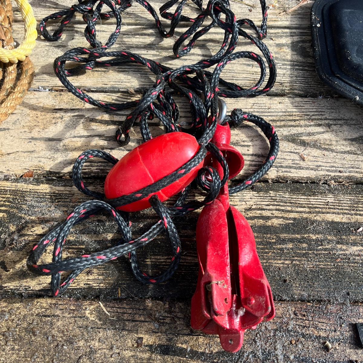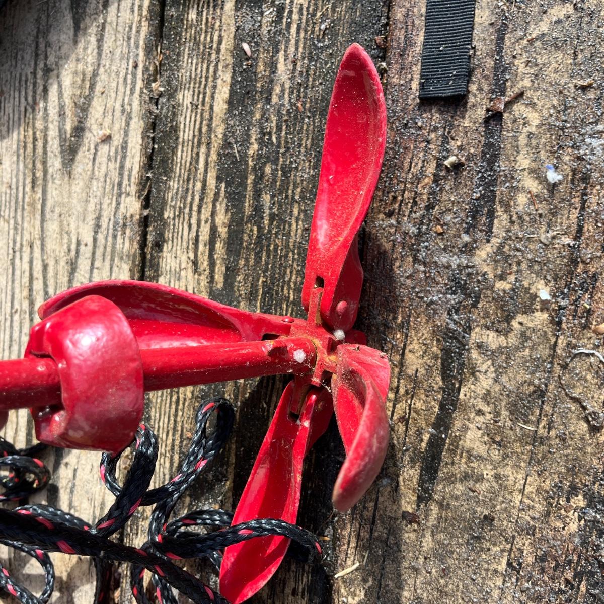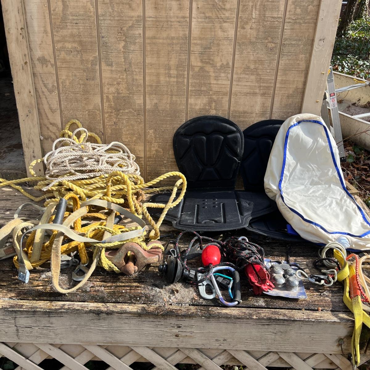 Lot includes nylon rope, sisal rope, cotton rope, two boat anchors, two folding boat seats, inflatable Sea Eagle boat seat, boat engine hose adapter and more. Folding seats measure 24” x 16” x 18”H.