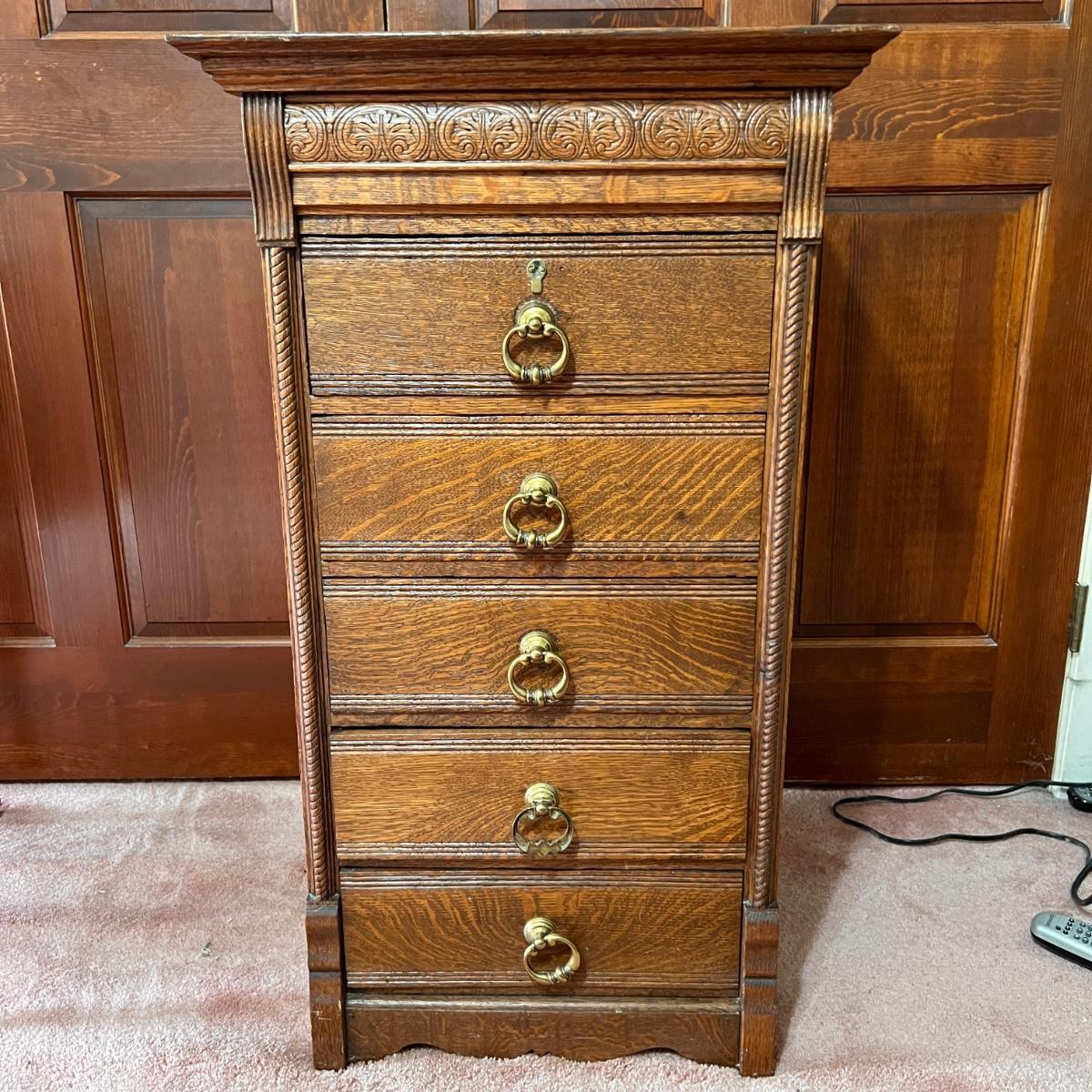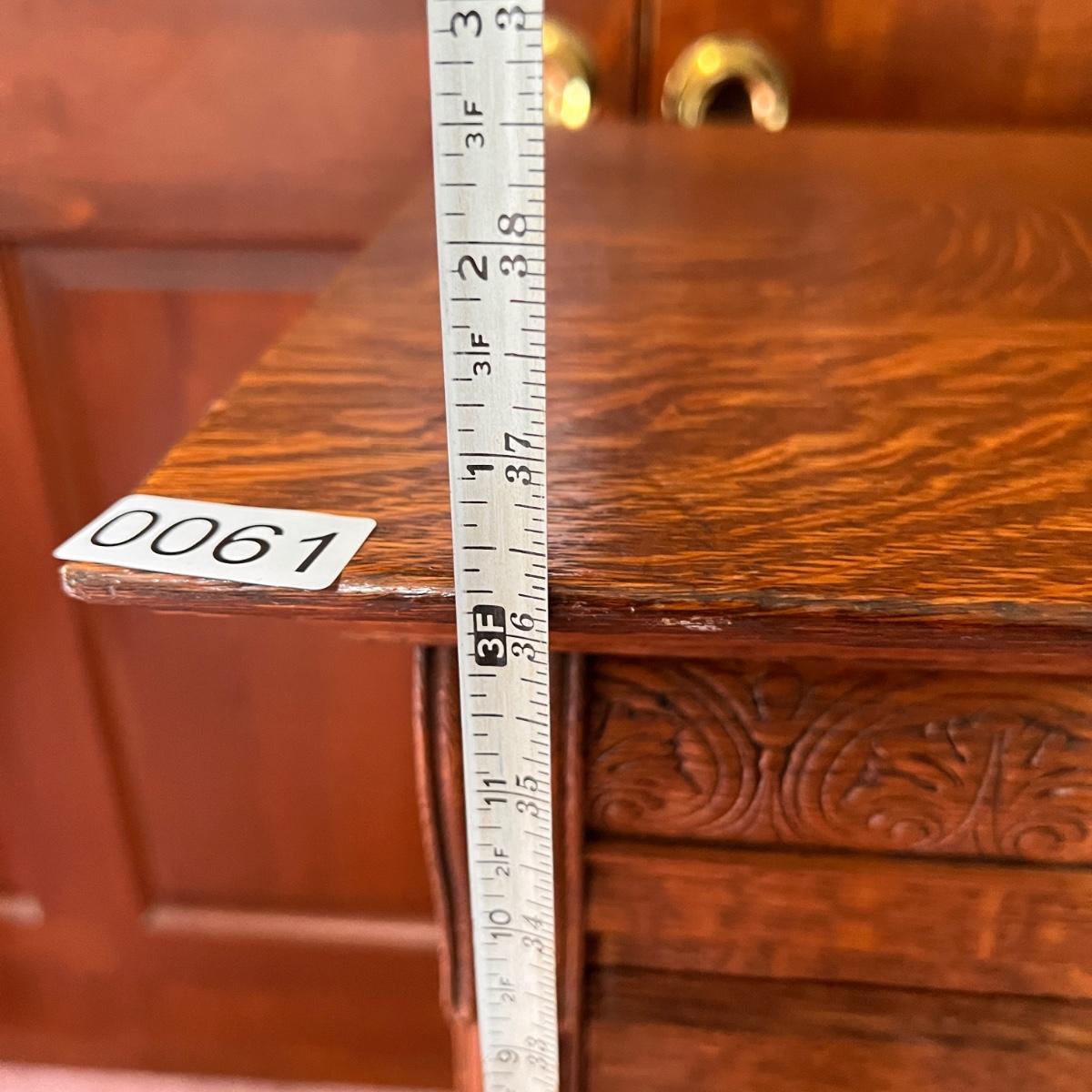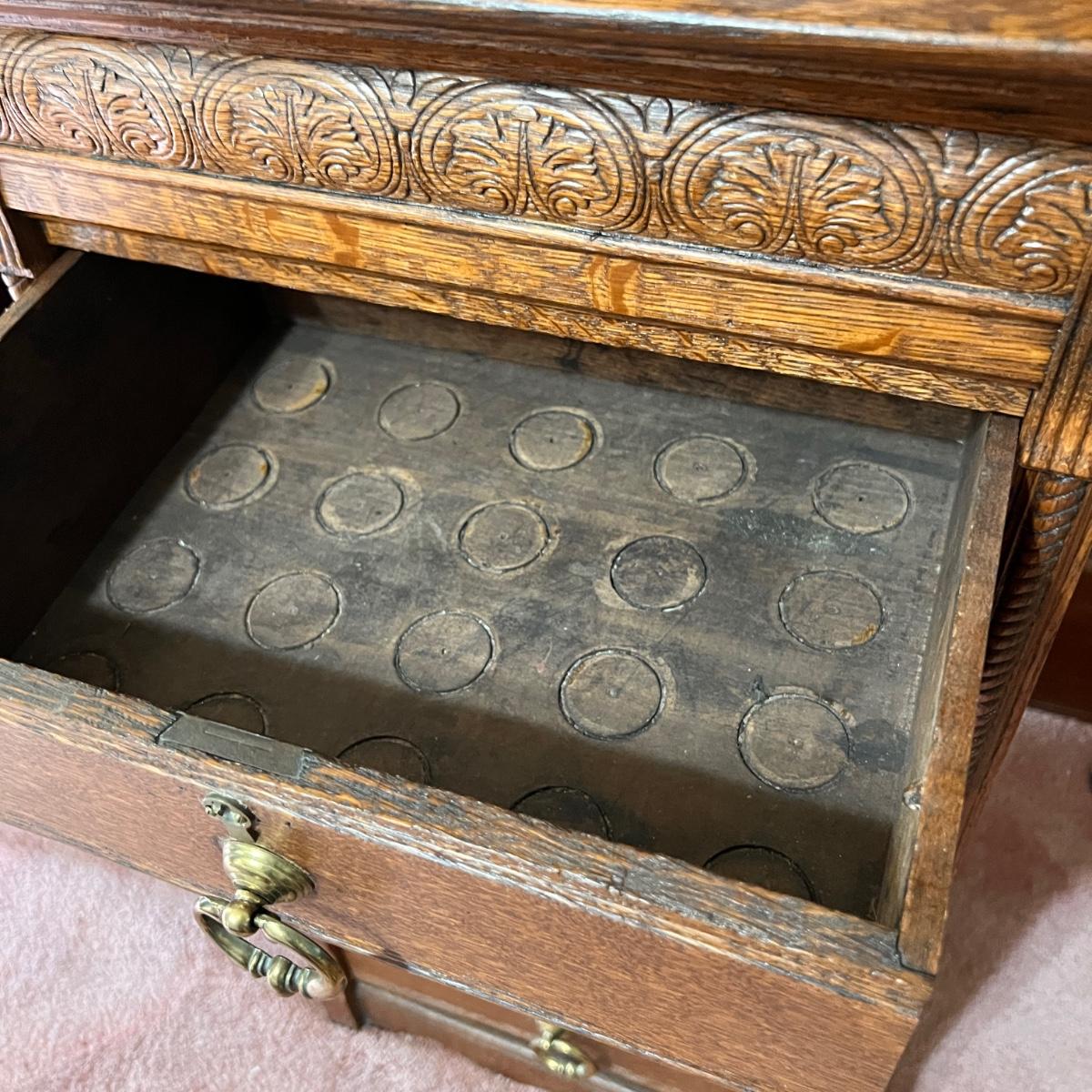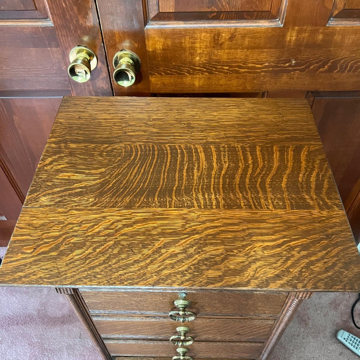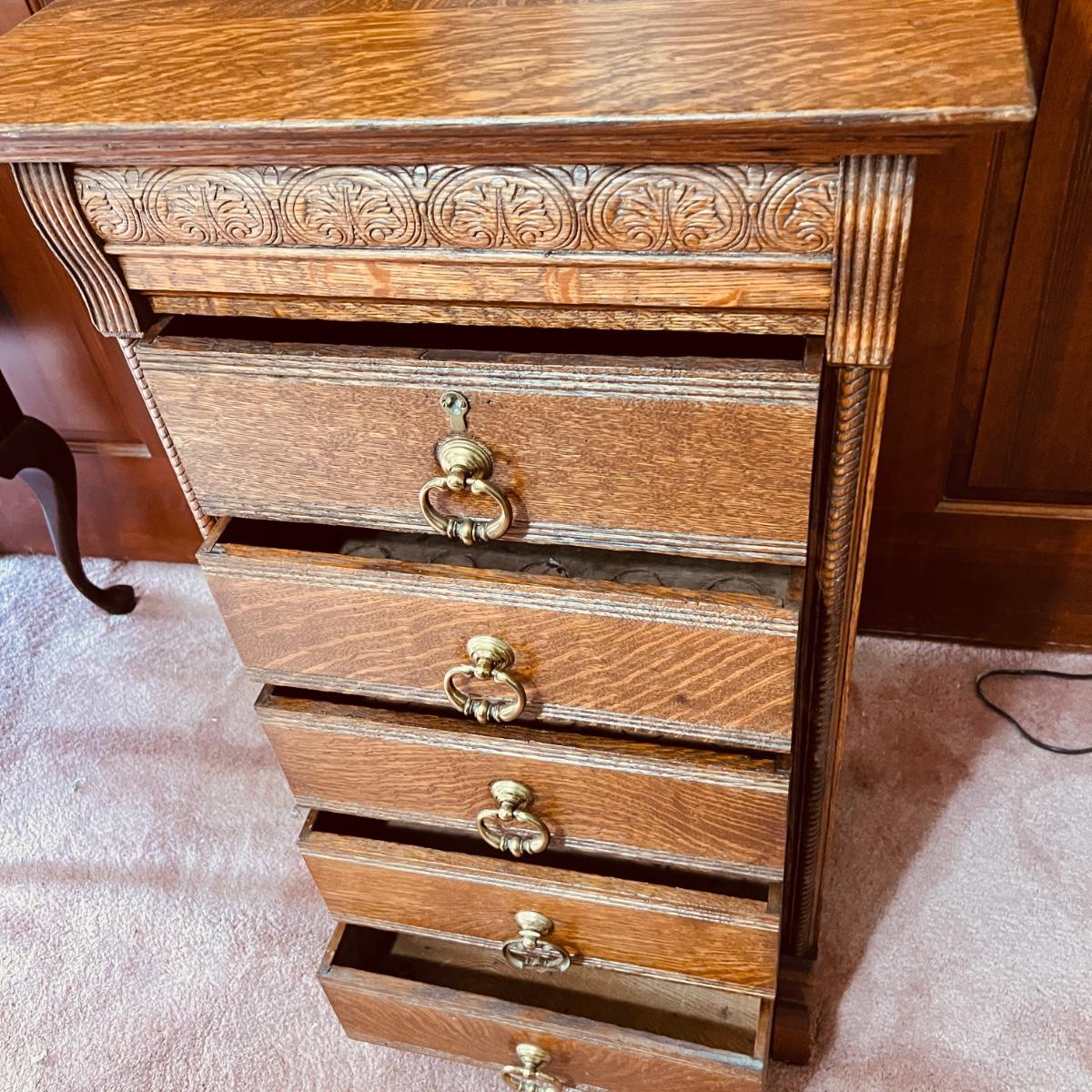 Very ornate oak with carving across the top front. Beaded thin columns on each side. 5 pull out drawers with decorative handles that stored the cylinders. In great condition for its age!