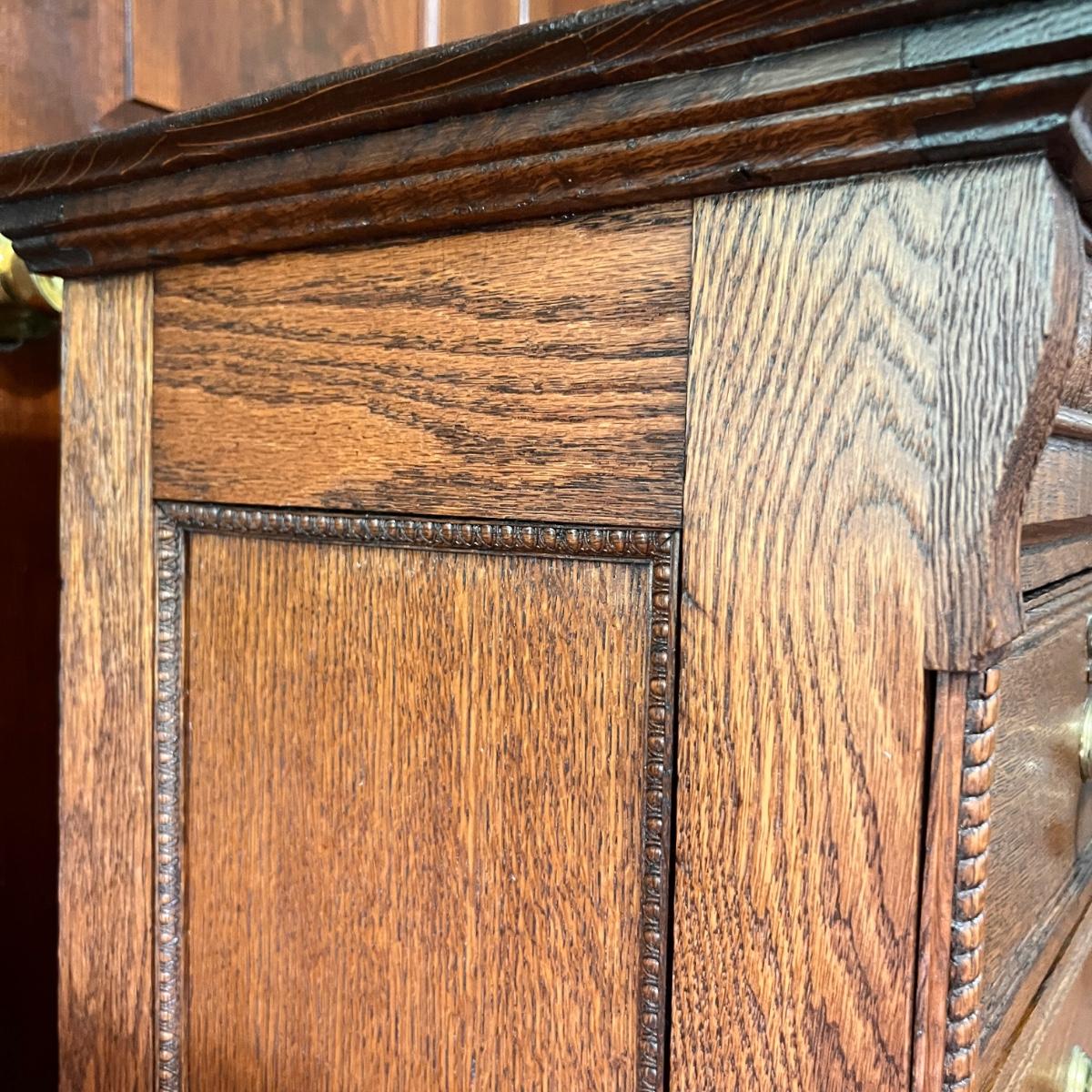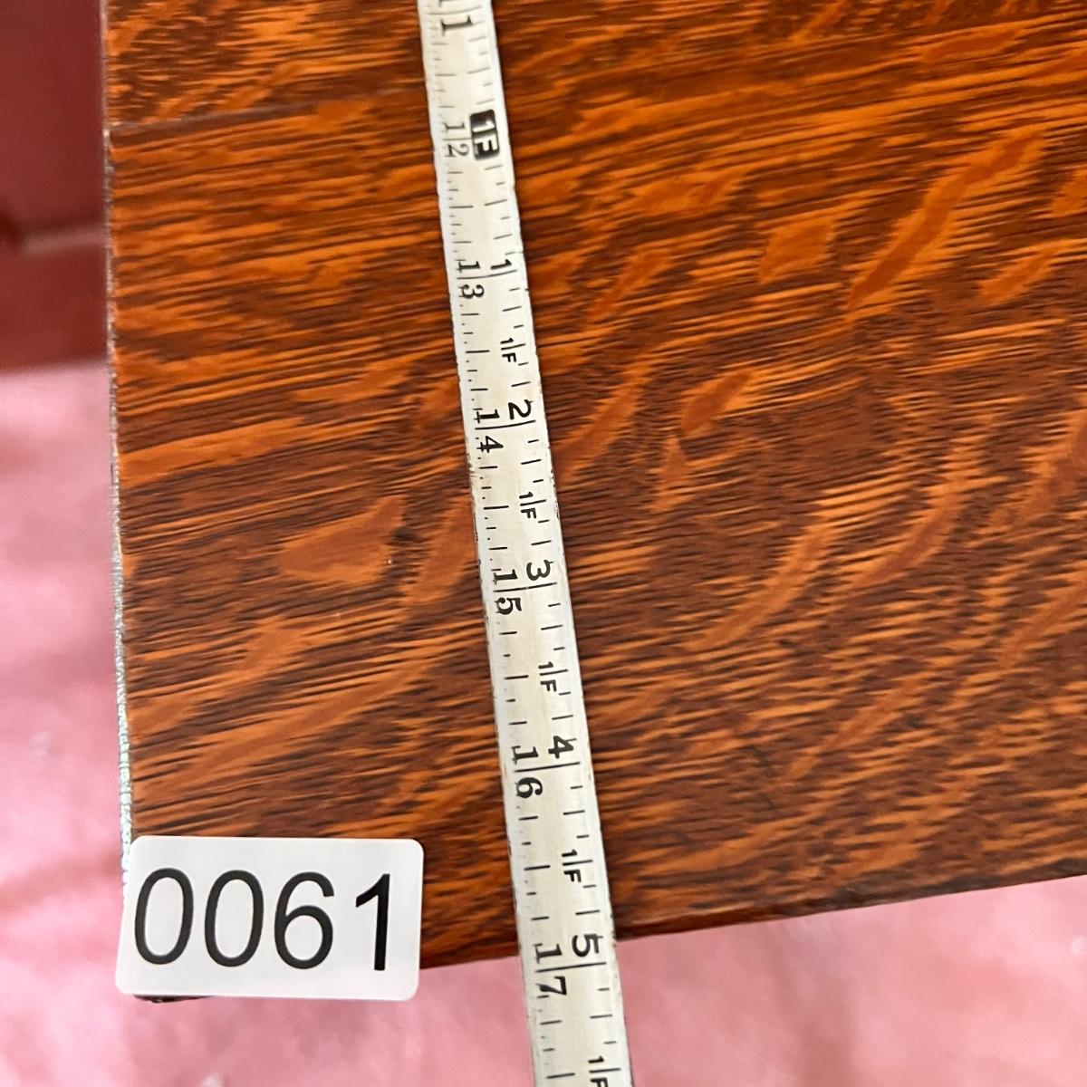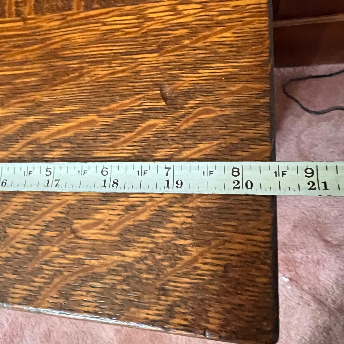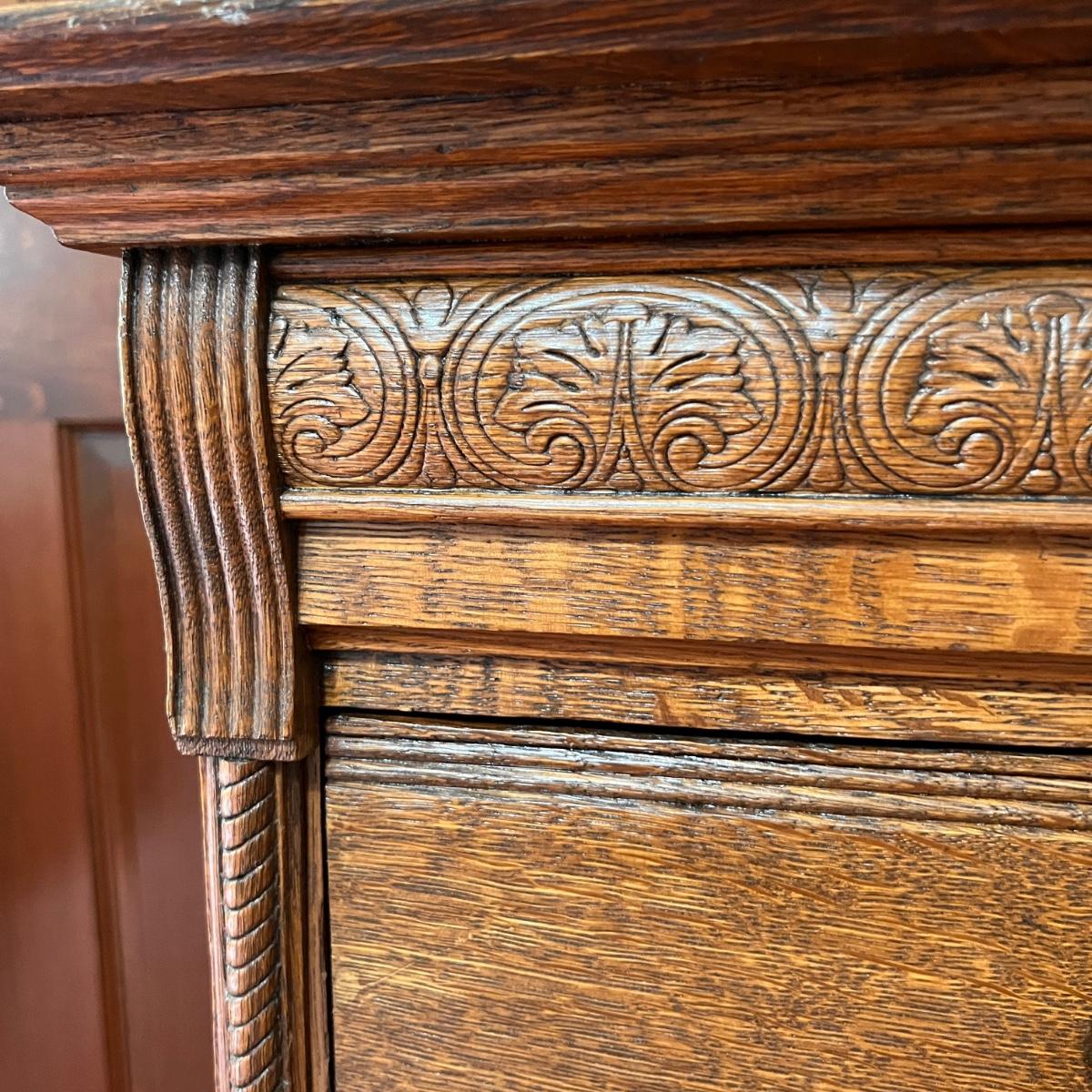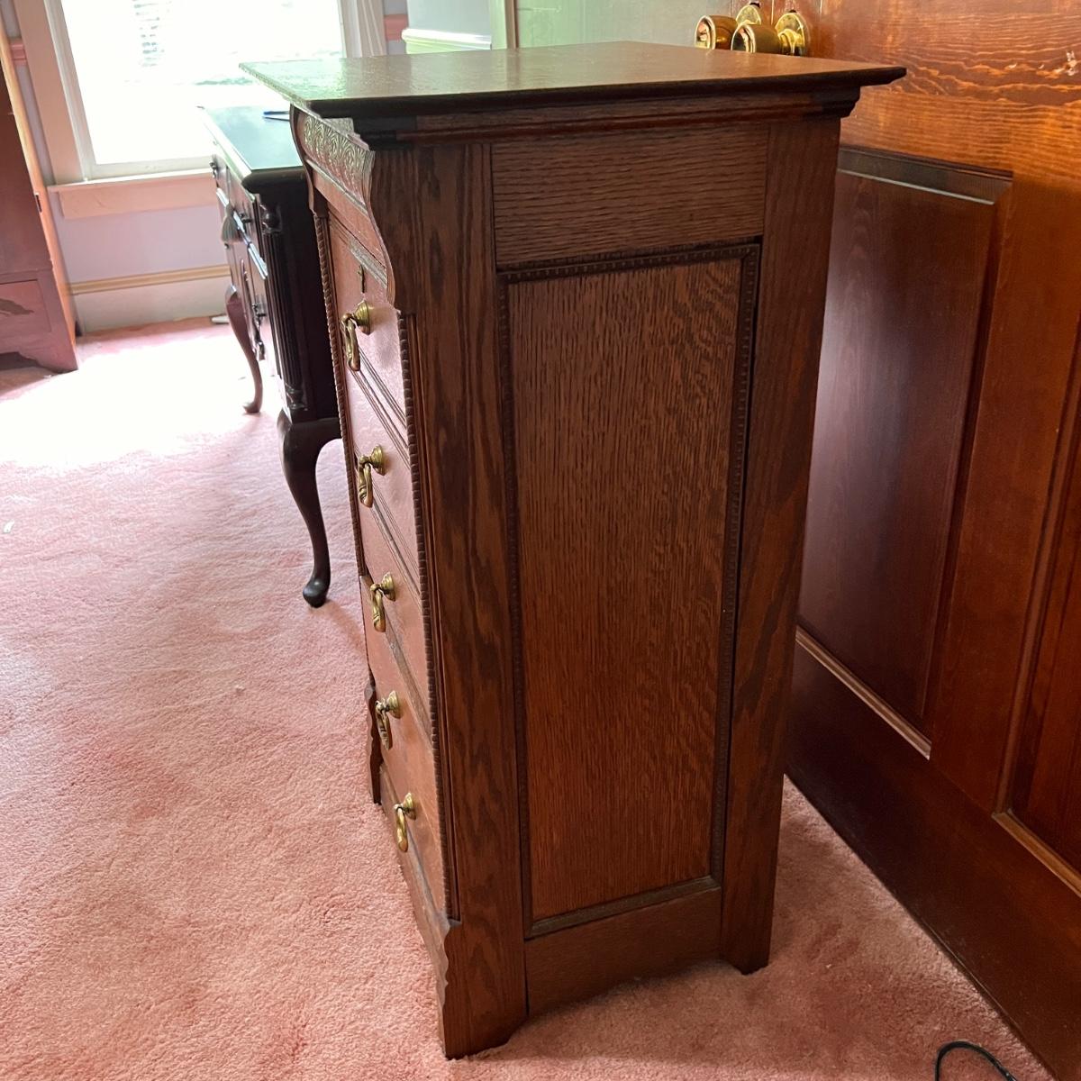 Very ornate oak with carving across the top front. Beaded thin columns on each side. 5 pull out drawers with decorative handles that stored the cylinders. In great condition for its age!