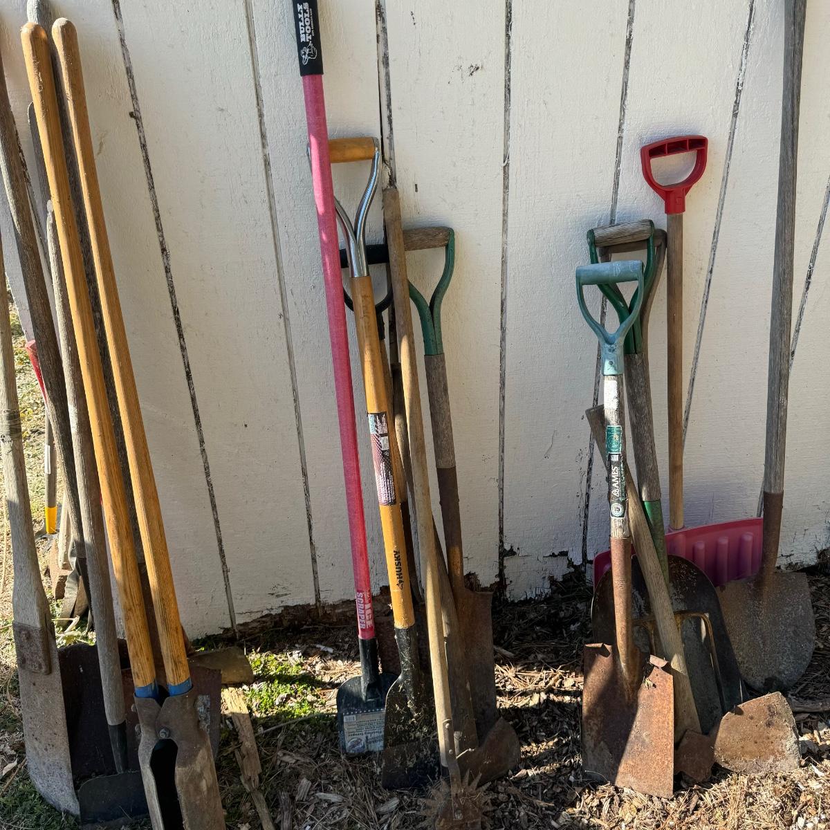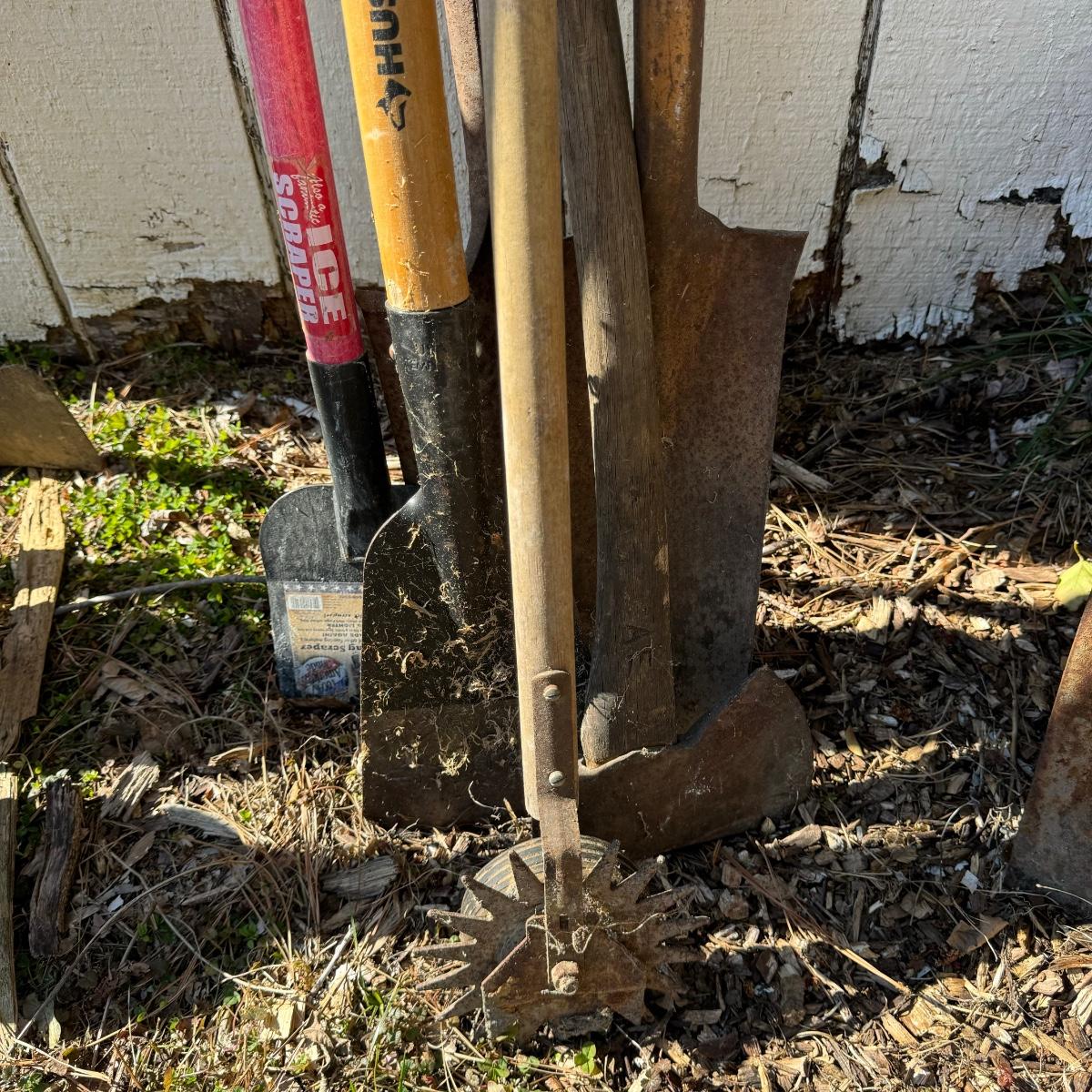 Has Husky Scraper, two spades, one axe and one spiked cultivator