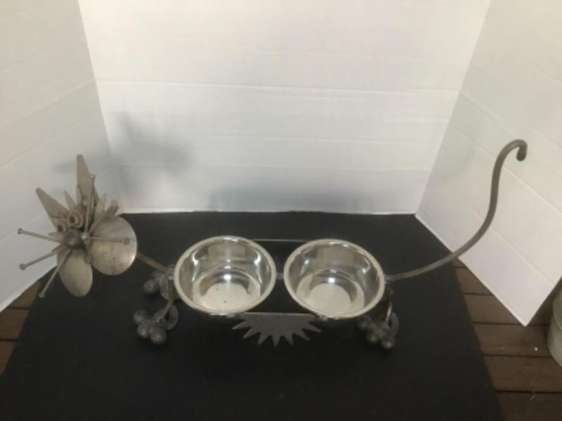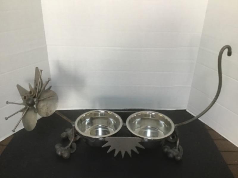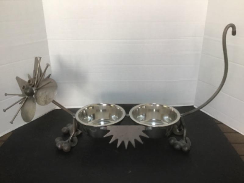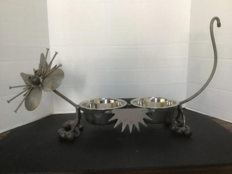 O - 1204 Scrap Metal Cat Sculpture / Food Bowls