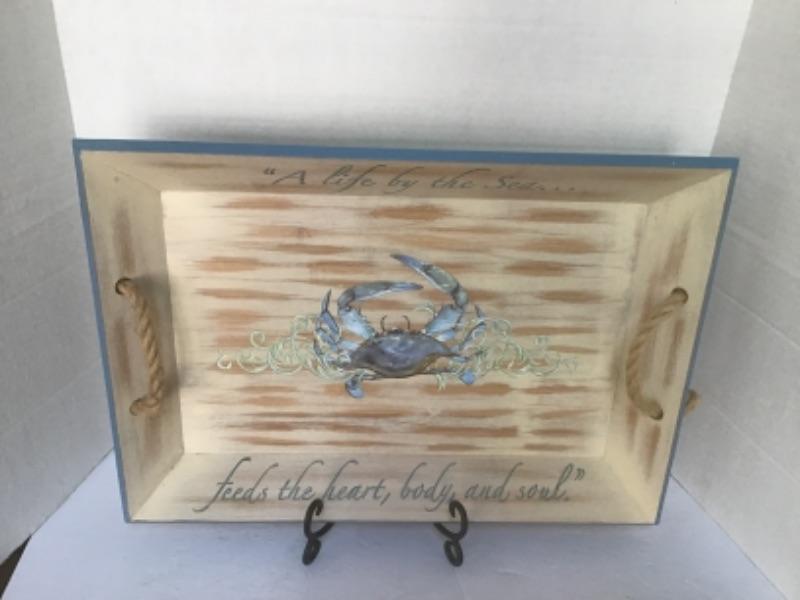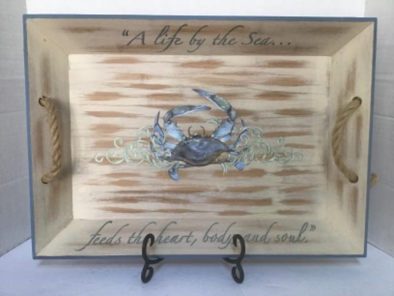 Beautiful Blue Crab Painted Wooden Serving Tray with Rope Handles on each side -