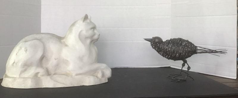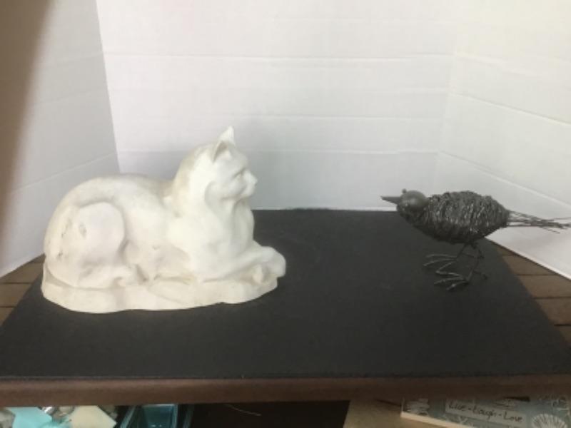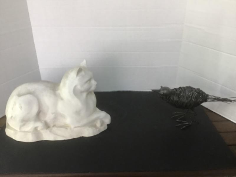Lot with Composite Cat Statue & Metal Bird Sculpture
