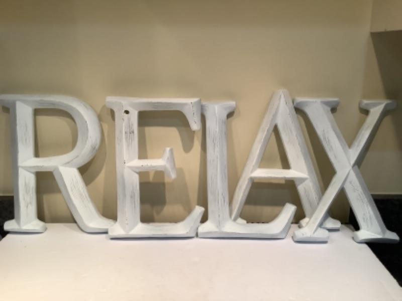 NEW IN PLASTIC Wooden Letters RELAX, Wall Hangings, each measures 11.5” Tall x 10” Wide