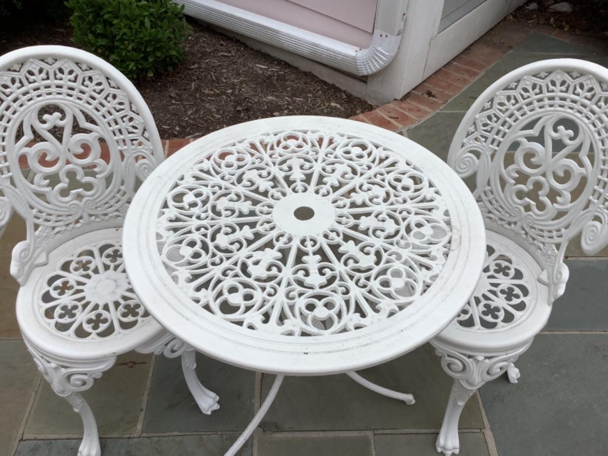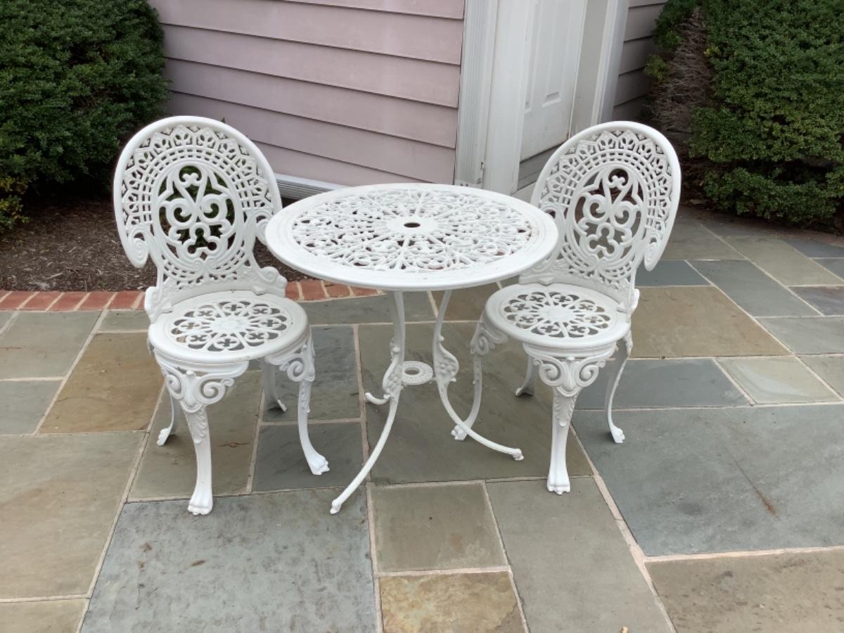 Three Piece Aluminum Bistro Set. Table diameter 27”, table height 26.5”.