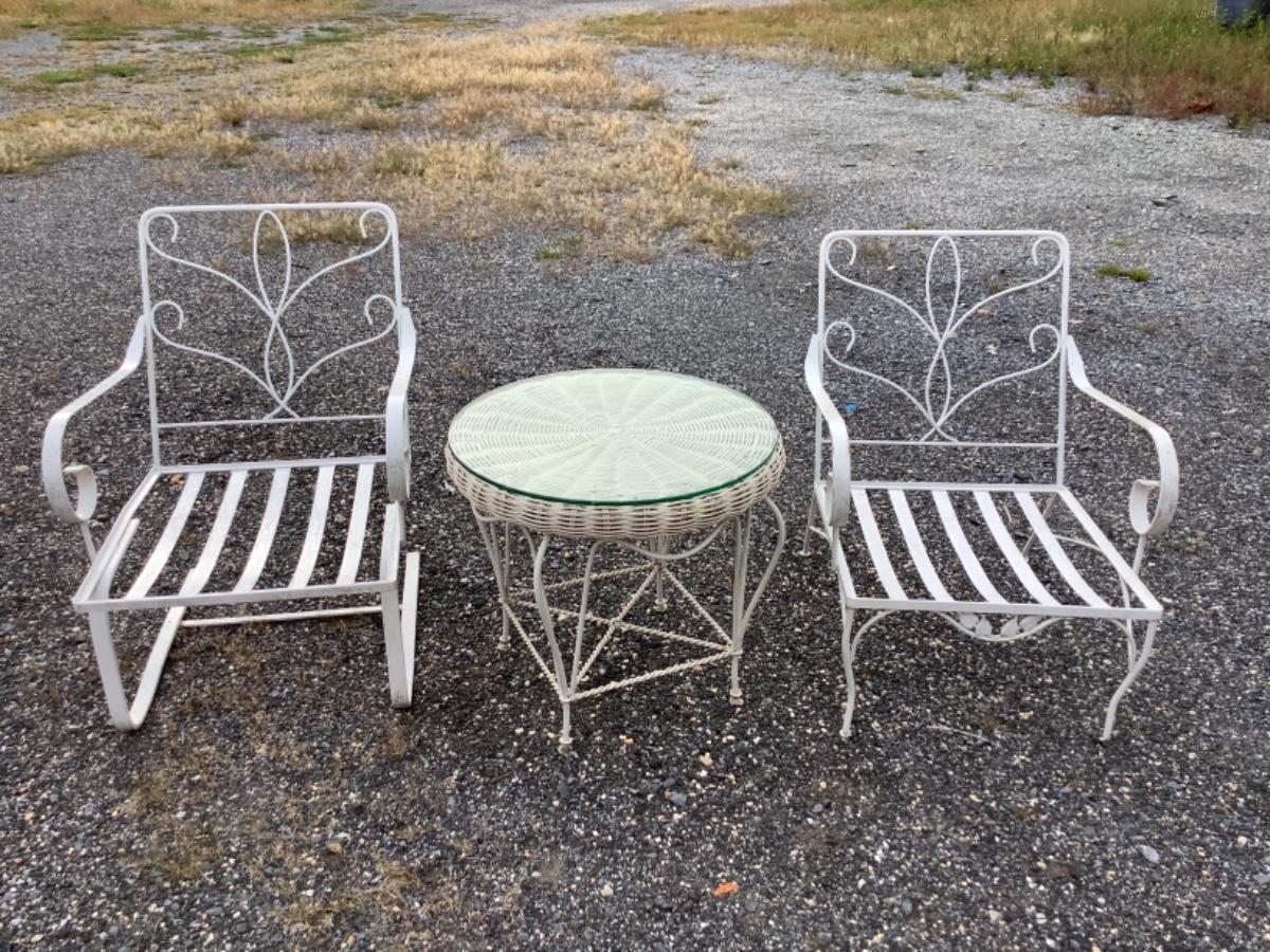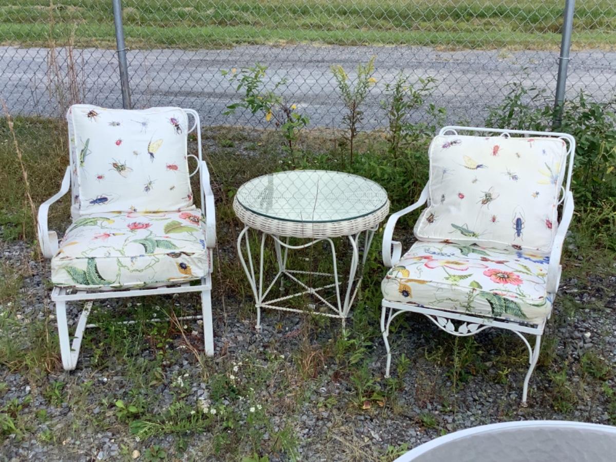 O - 358 Pair White Wrought Iron Chairs with Cushions & White Wicker,Wrought Iron/Glass Table