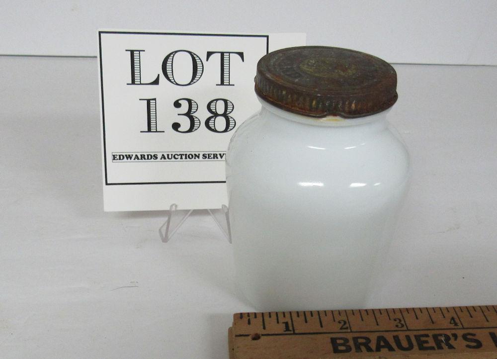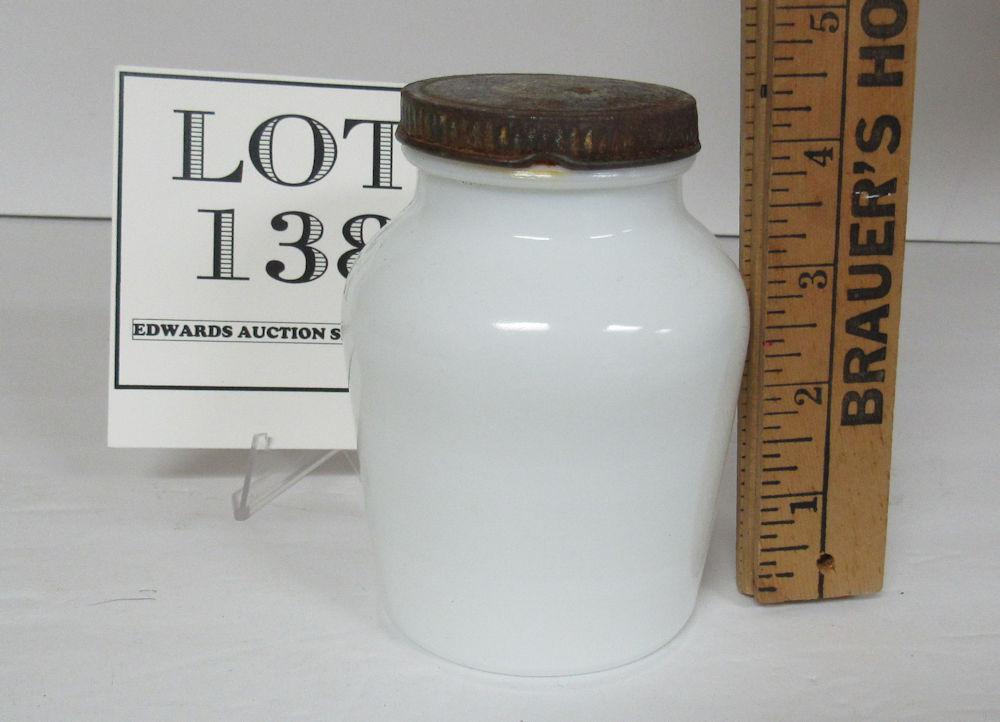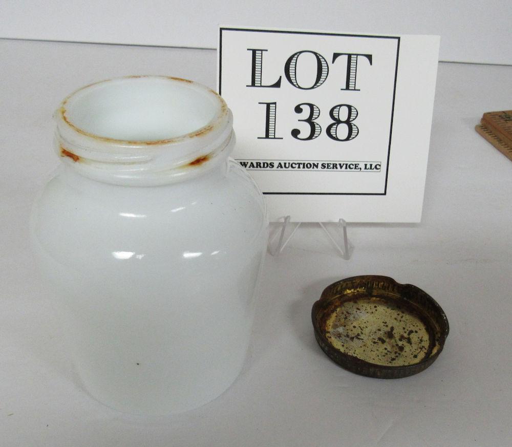 The jar is in good condition but has rust residue on the rim. The cap is very work and rusting, but is original and you can make out the name on top. Shipping is available at shipping cost plus $5.00 handling fee on up to 8 lots, $10.00 handling fee on 9 or more lots.