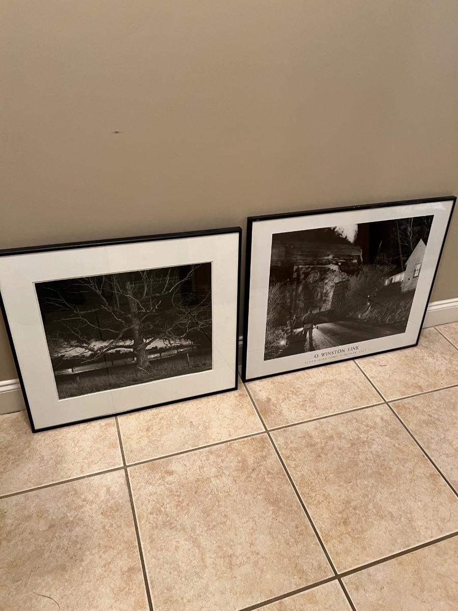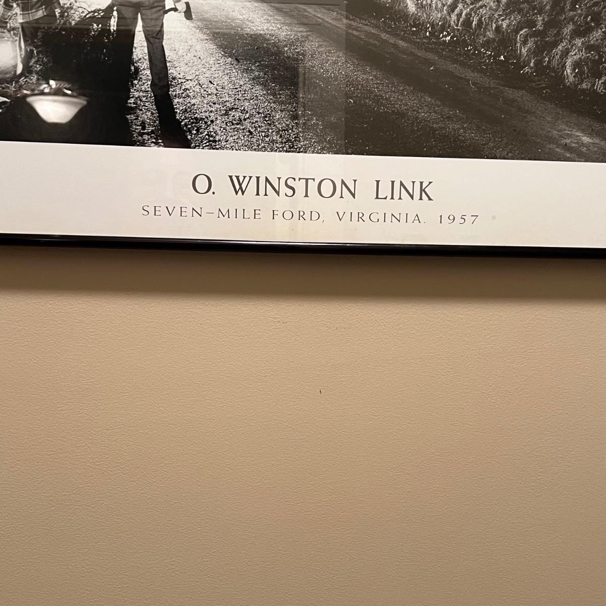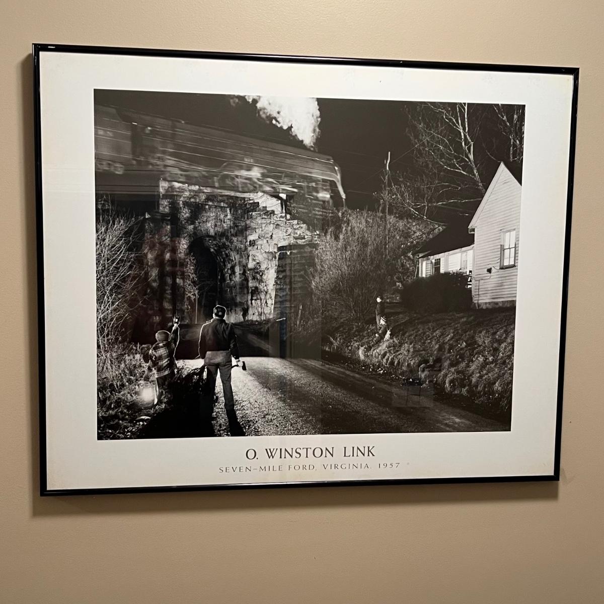 Two framed pieces by O. Winston Link. The print titled ‘West bound Birmingham special train….’ has information on the back to say it is signed, please note no signature is visible without dismantling the frame therefore we cannot guarantee it is signed. Both are framed in black quality poster frames and under glass. Frame of ‘Seven Mile Ford’ measures 30” x 24”H.