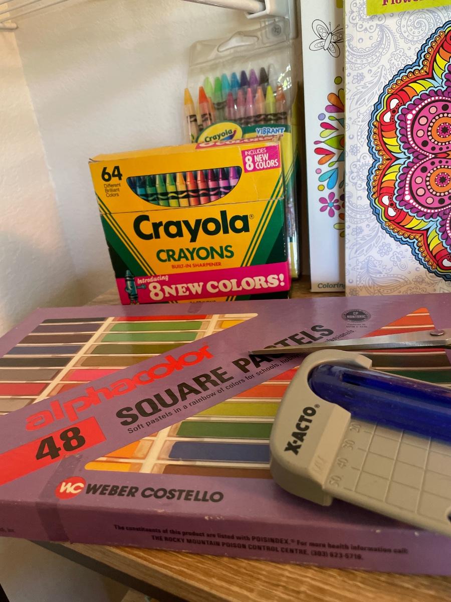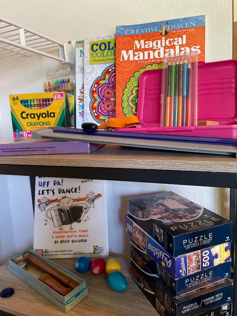 Crayolas, coloring books, puzzles, recorder misc. Shelf not included.