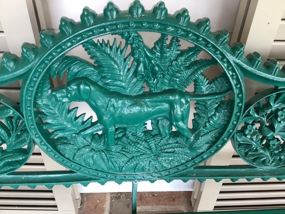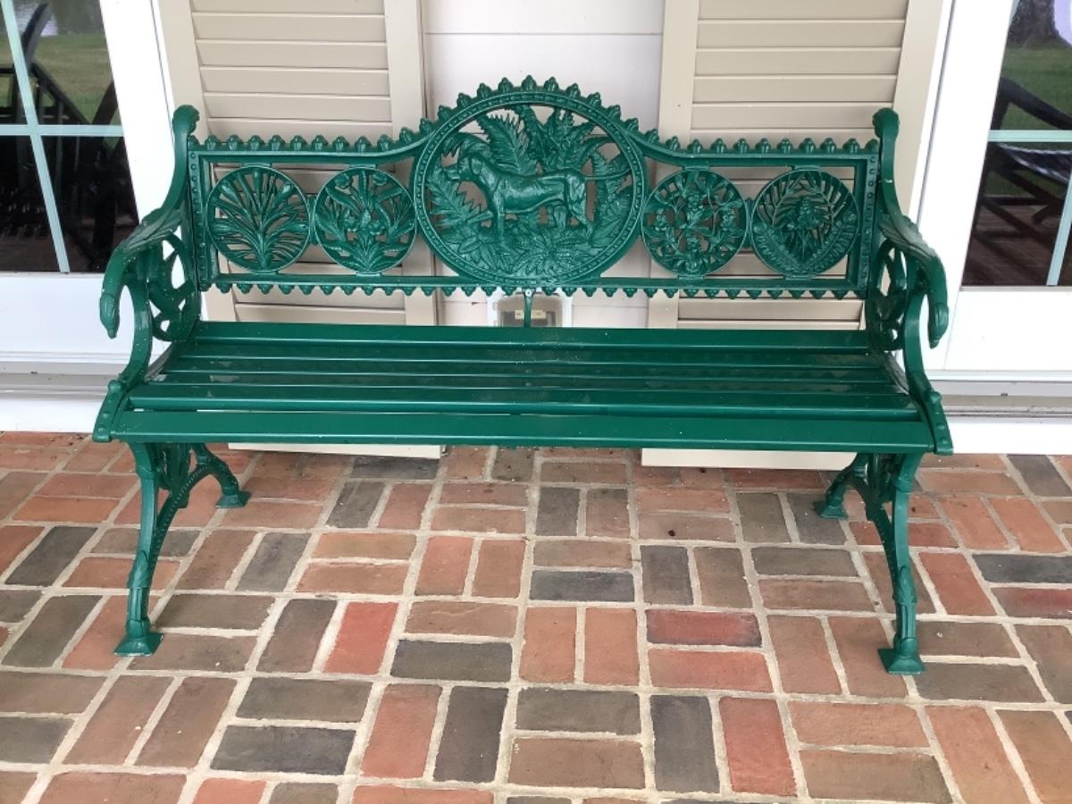 O1127 Outdoor Green Metal Bench with Hunting Dog Scene