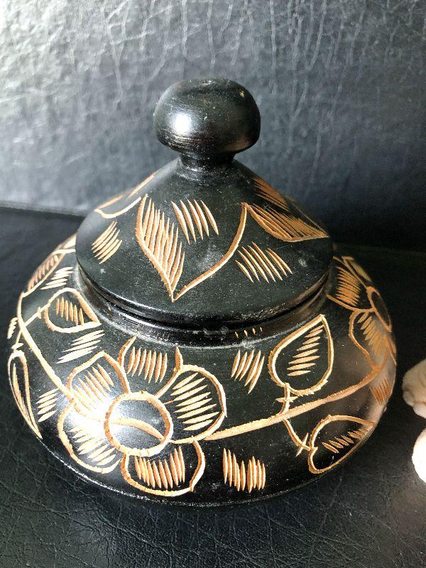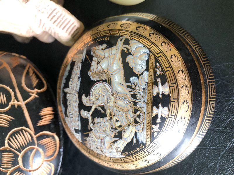 Wood carved trinket boxe, 24K gold trimmed box and collection of elephants