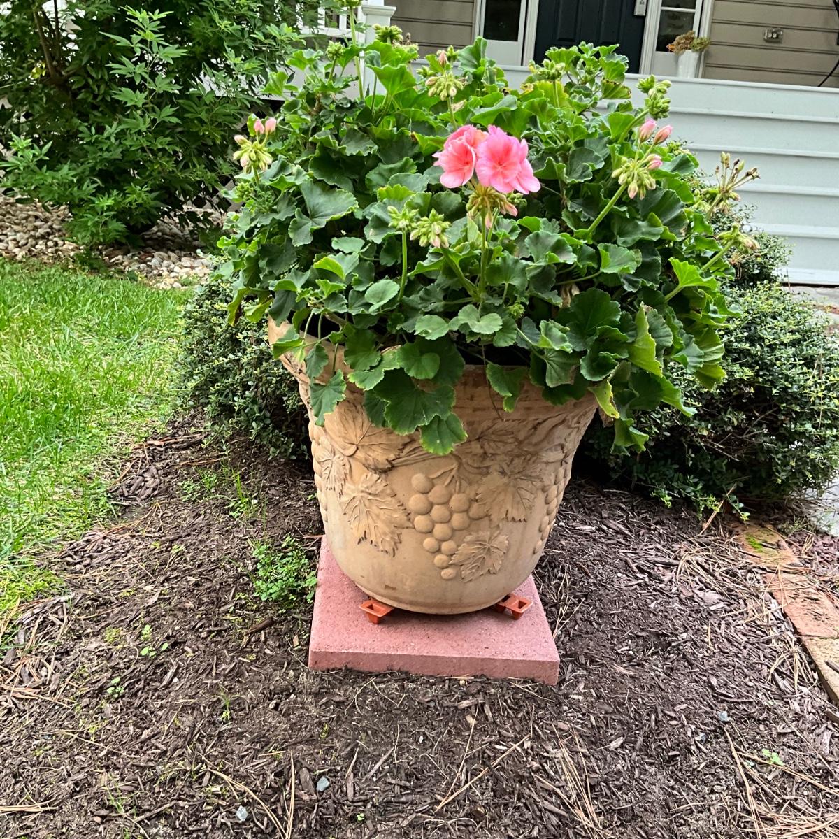 O-1230 Pair of Terra Cotta Grape Design Flower Pots with Pink Geraniums