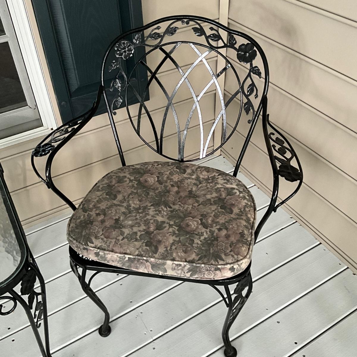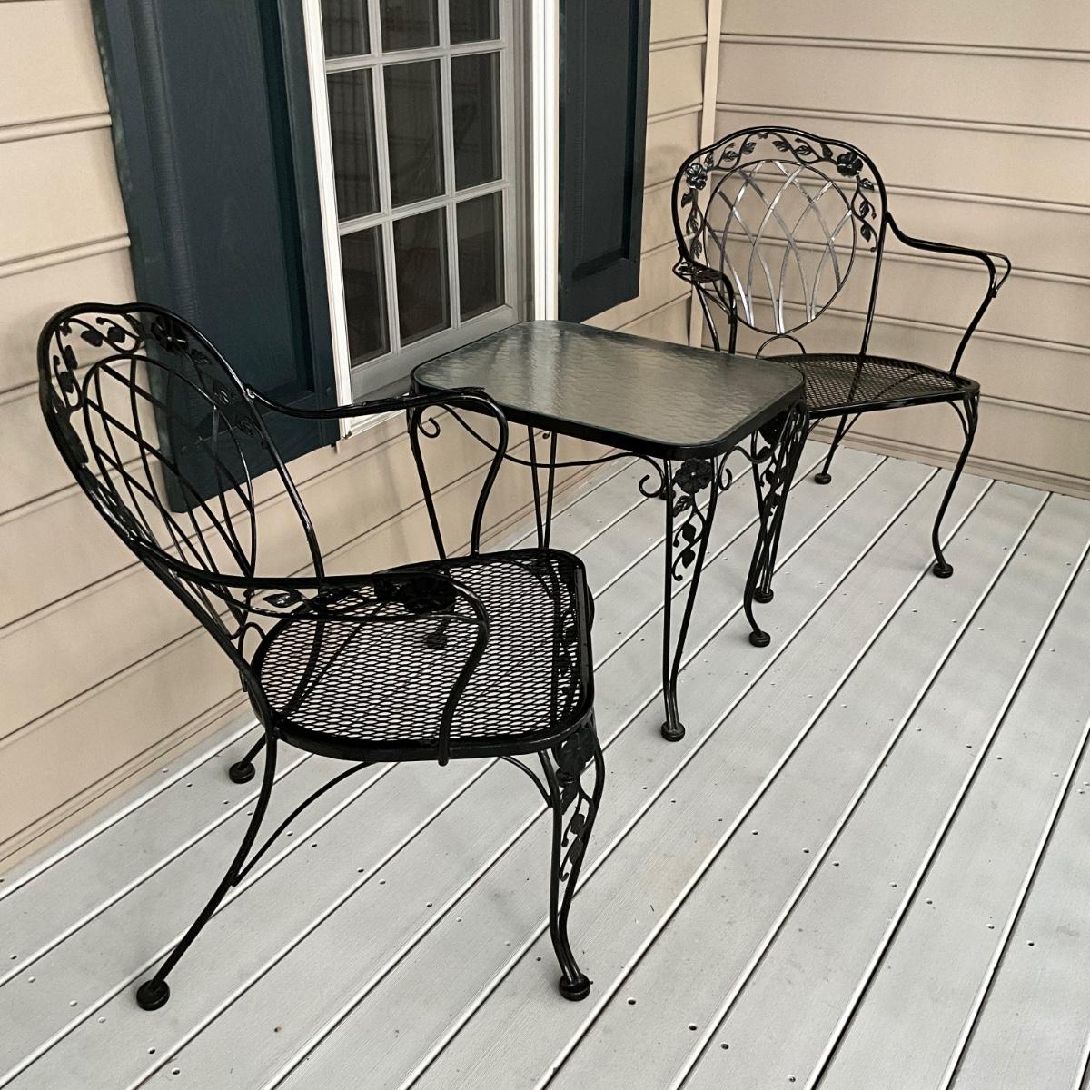 O-1232 Pair of LYON SHAW Wrought Iron Windflower Armchair and Table 3pc Set