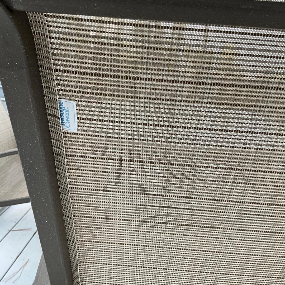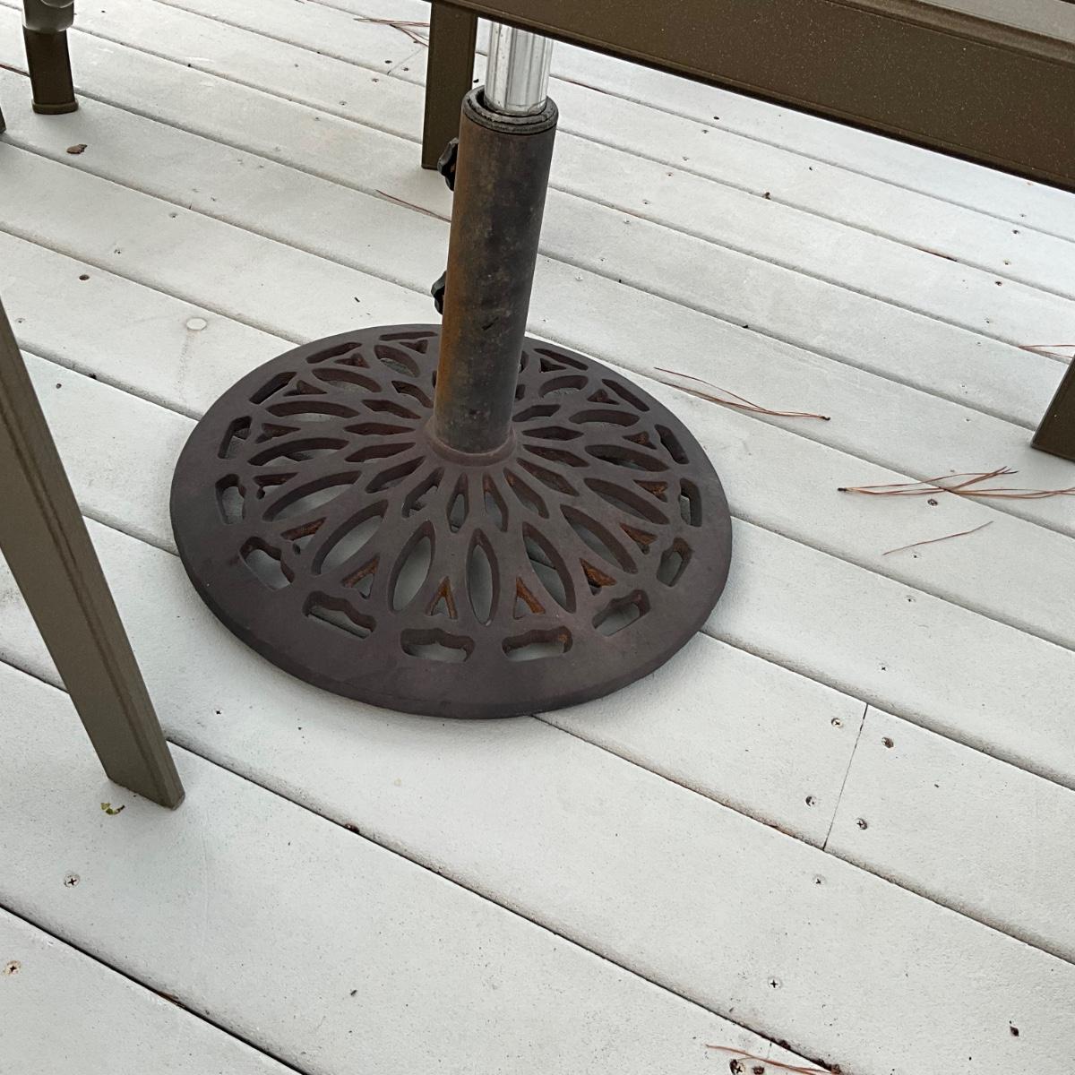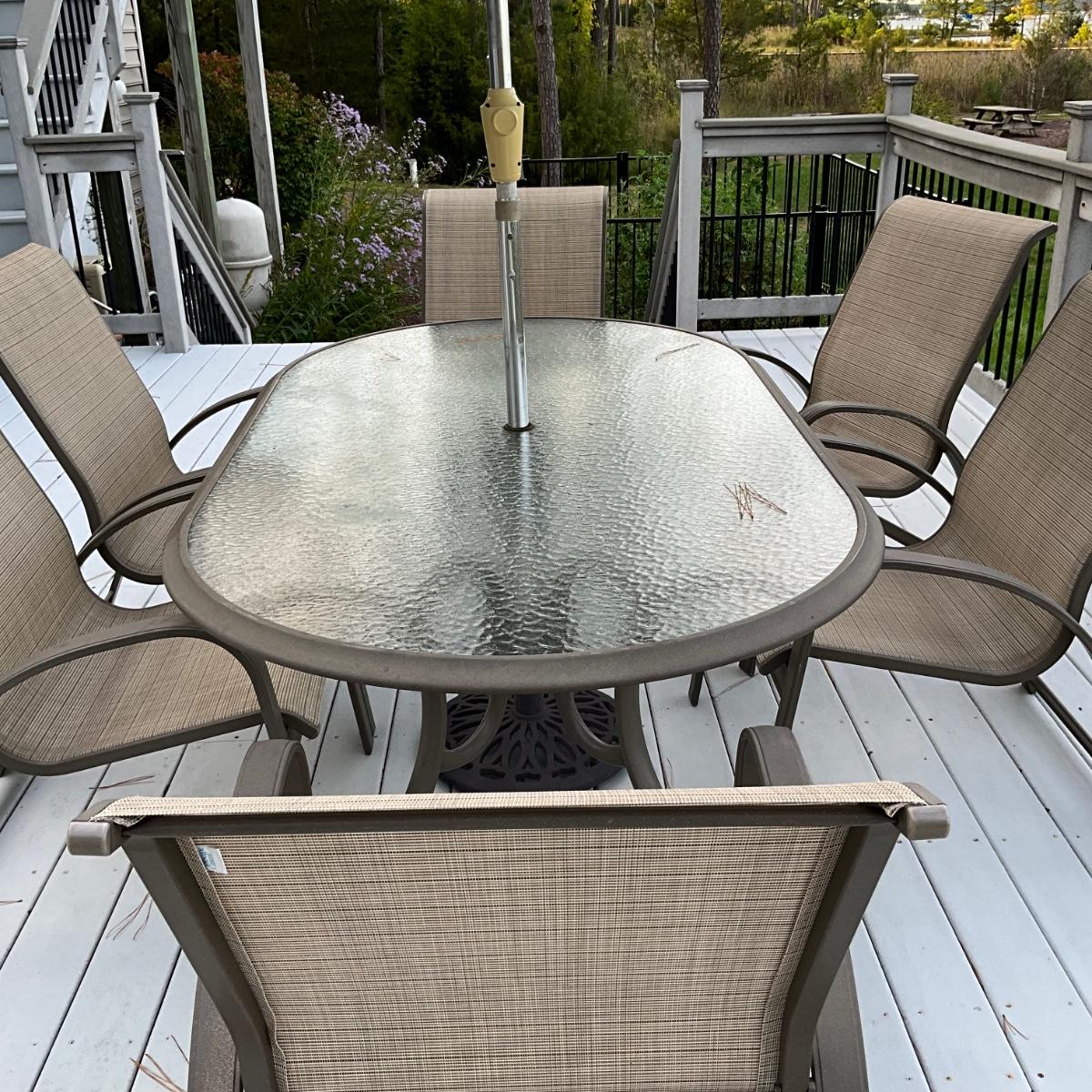 6' oval tempered glass top table with 6 mesh chairs , one 6' telescope 3-way tilt umbrella with cast iron stand