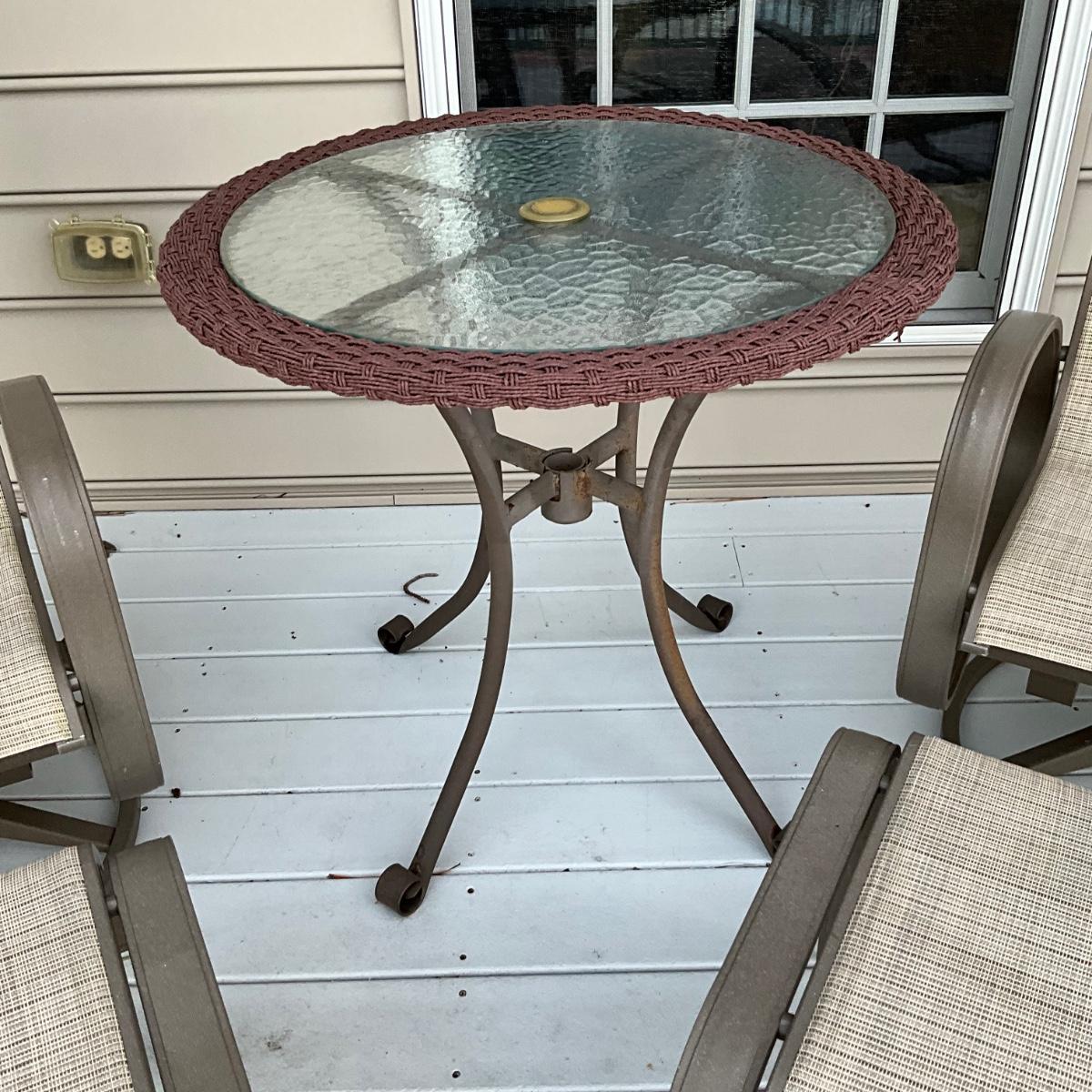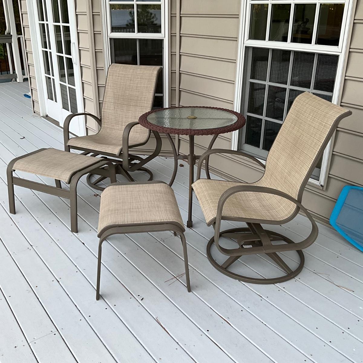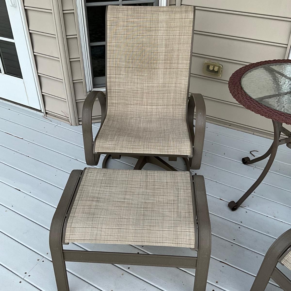 O1262 Pair of Telescope Outdoor Furniture Mesh Swivel Base Chair with Ottoman and Table