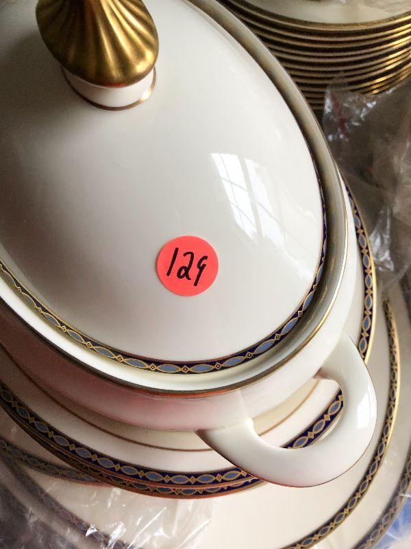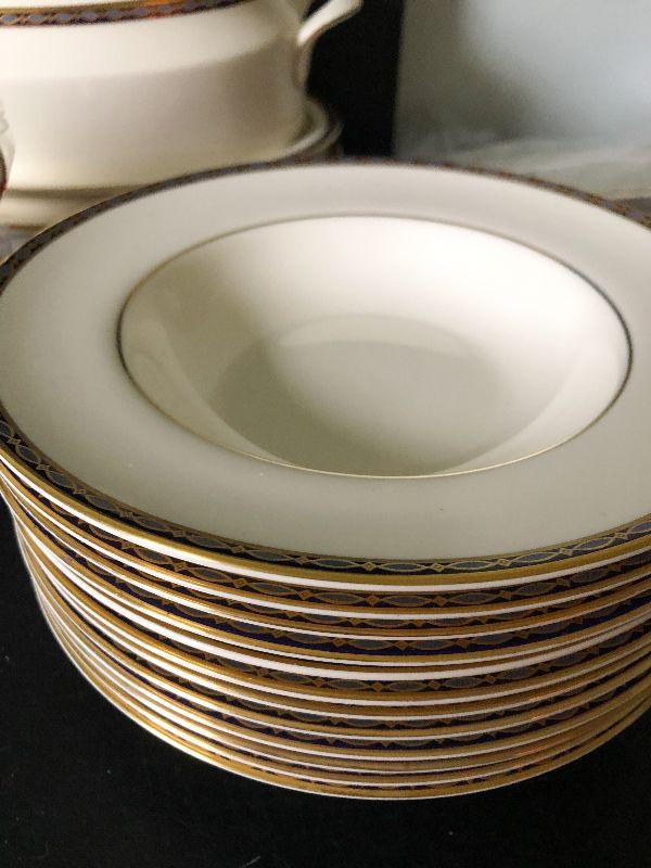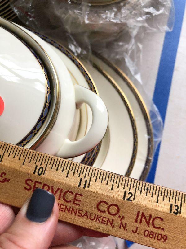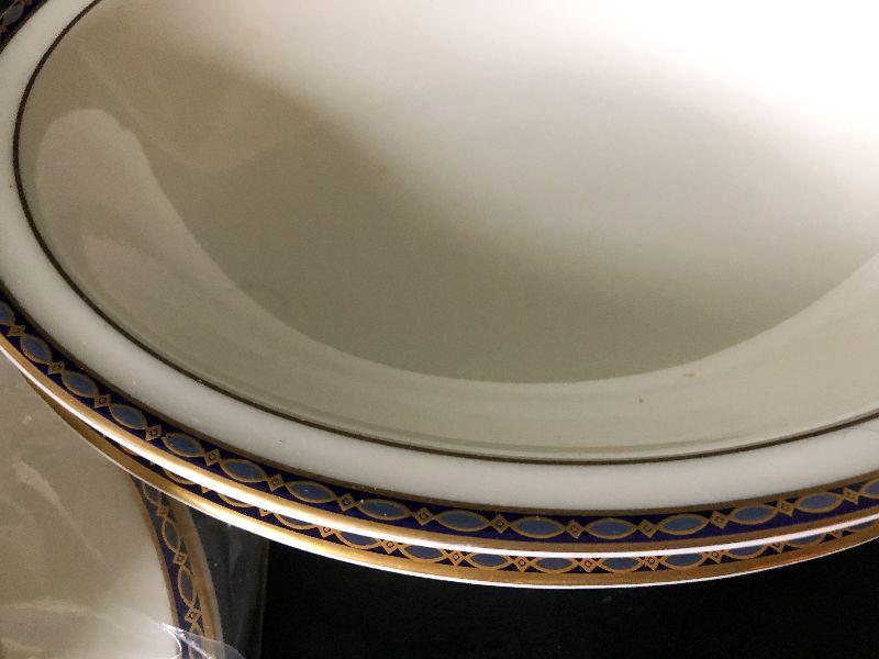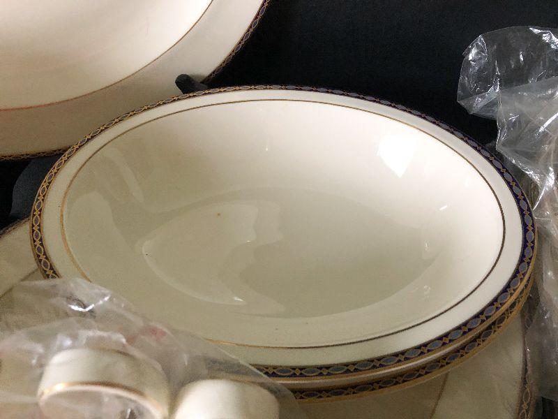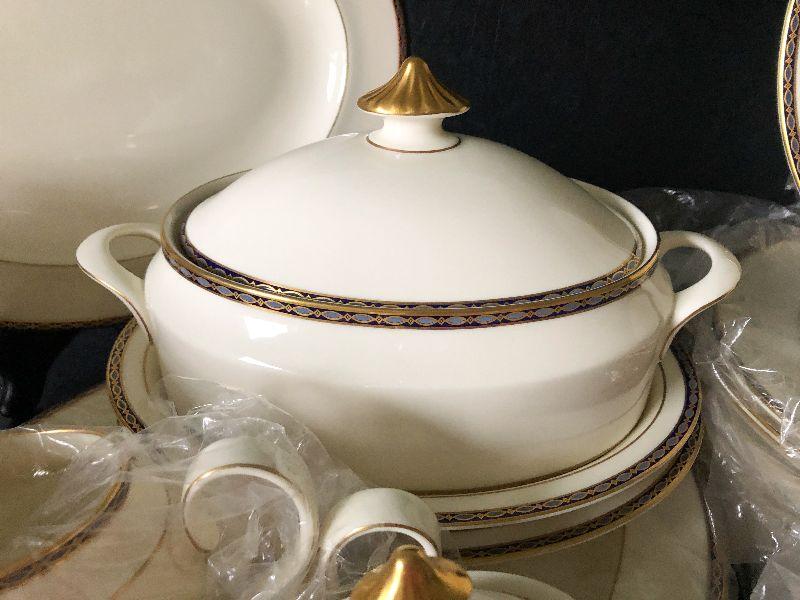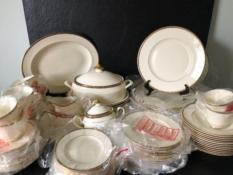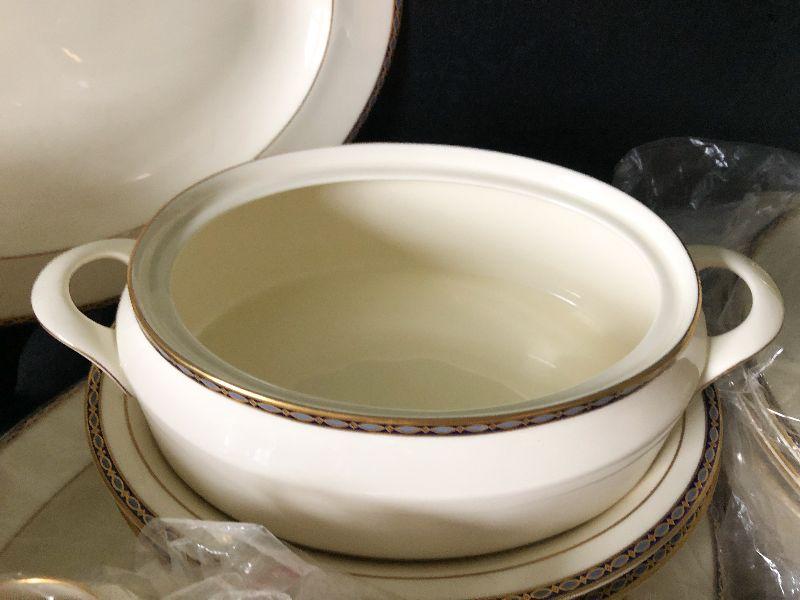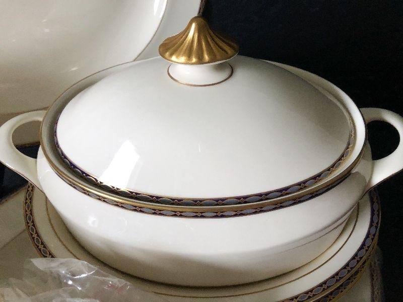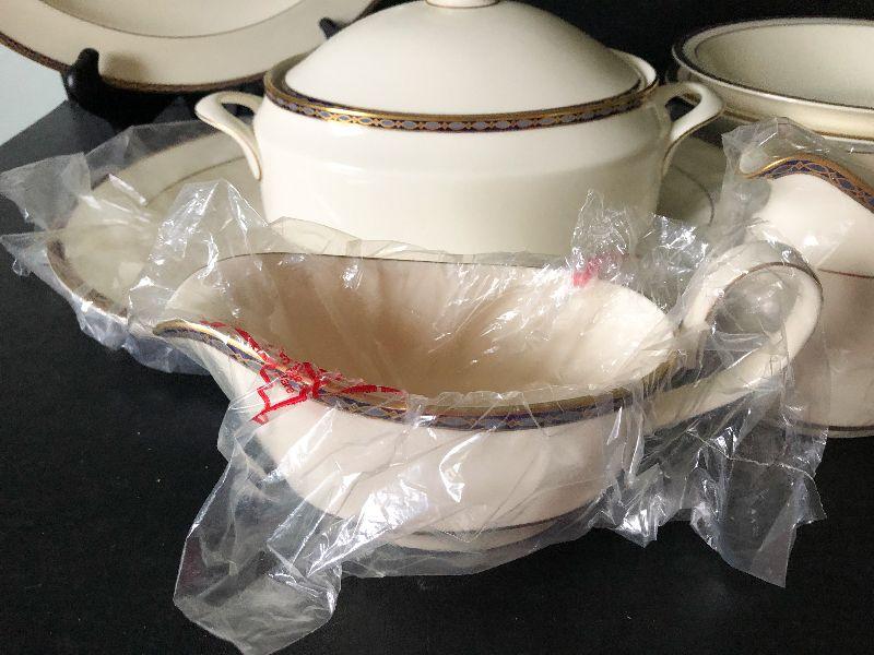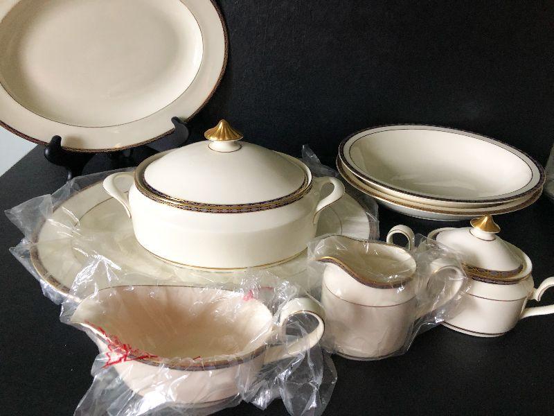 Serving 12, with platters, serving bowls, covered server, and more. A set with 60 pieces just sold on Ebay for over $600, and individually some of these pieces sell for over $100. Beautiful set with no chips or cracks and stored in original plastic.