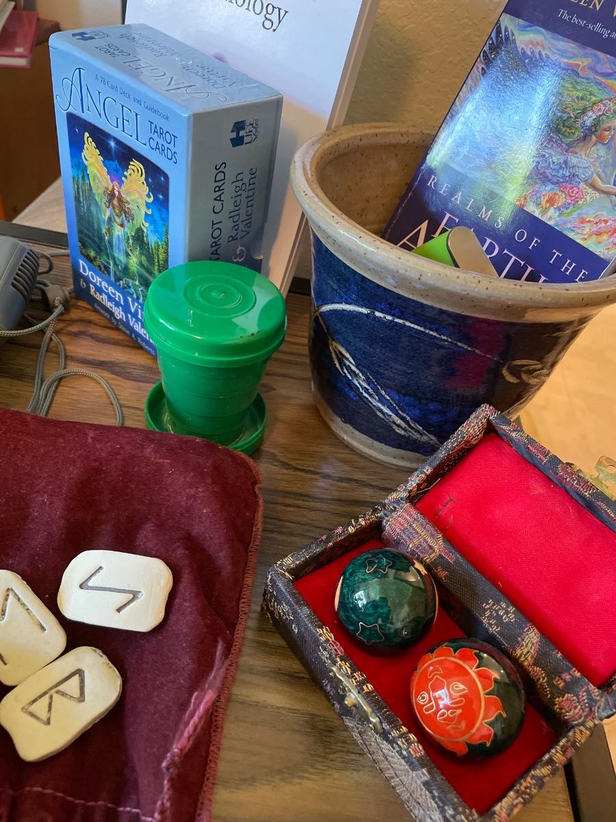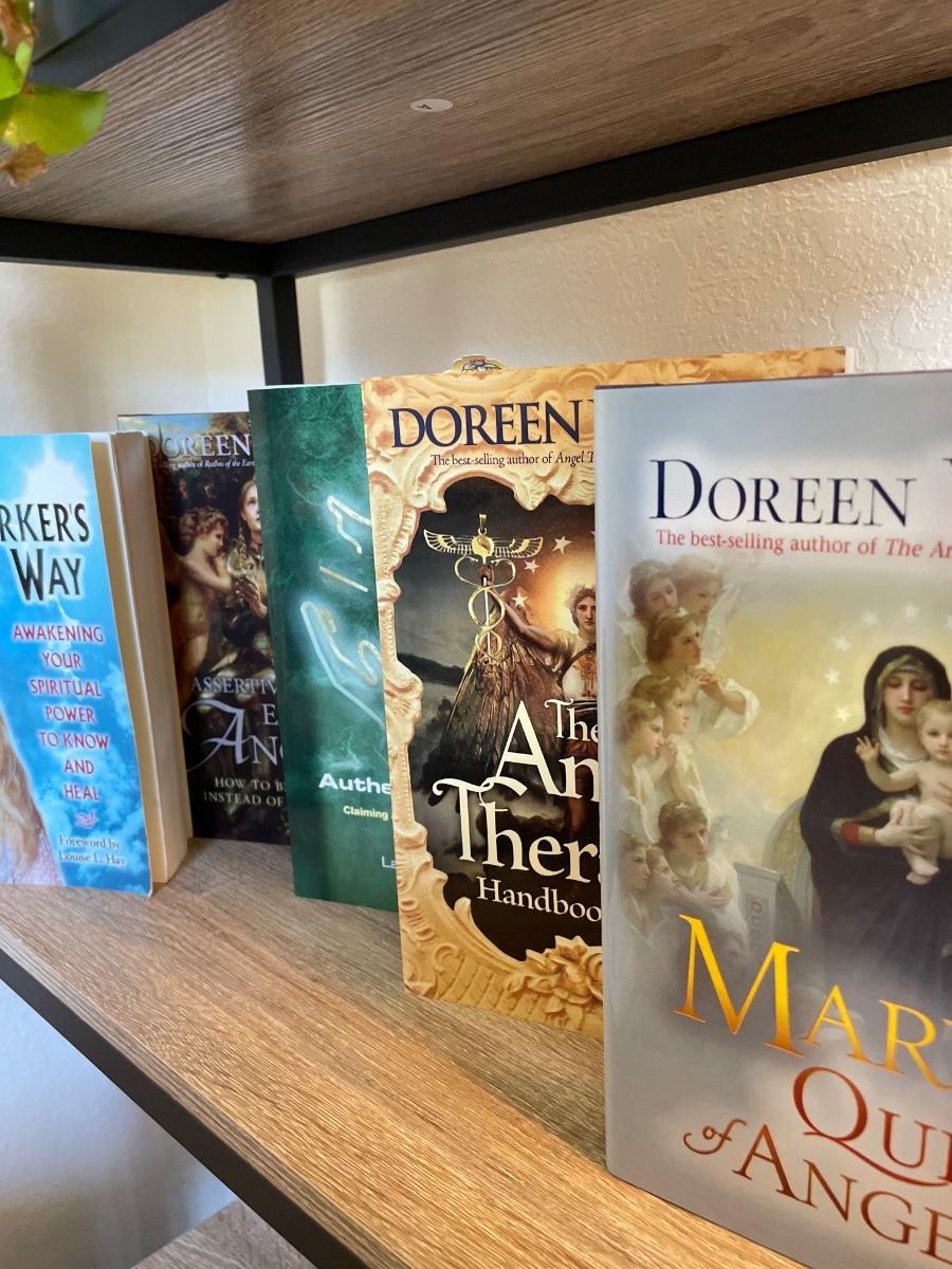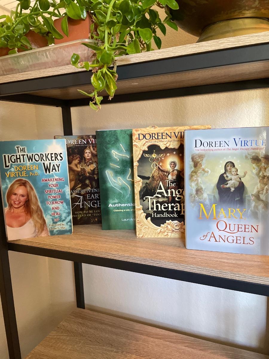 Spiritual books , tiles , stress balls, fan and more misc. Shelf not included.