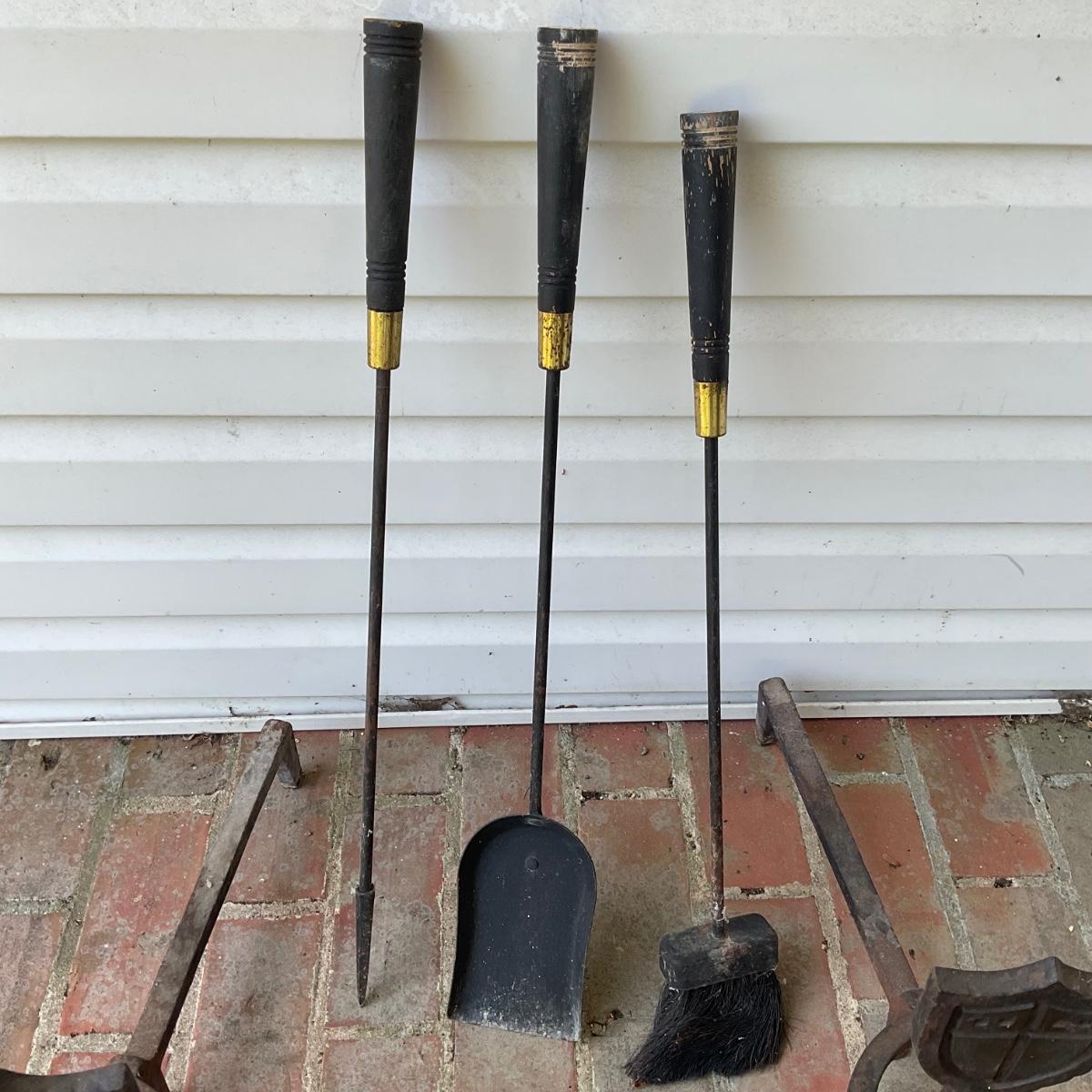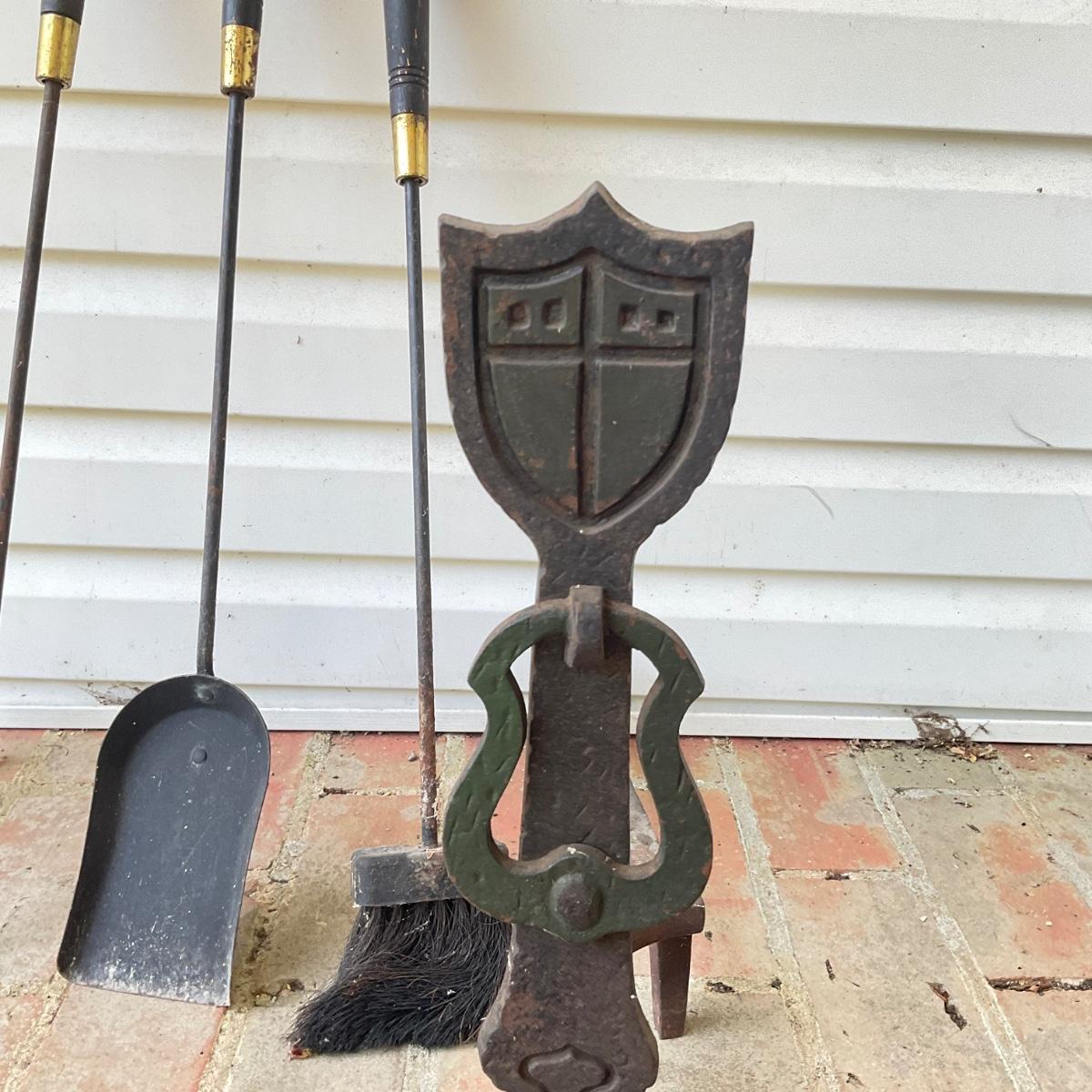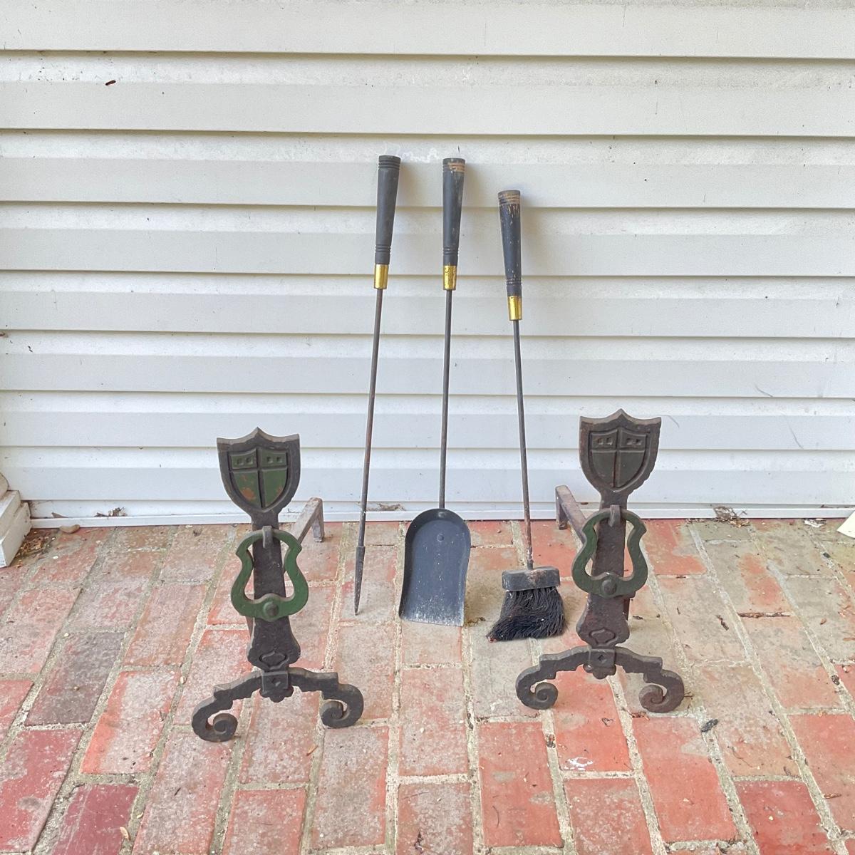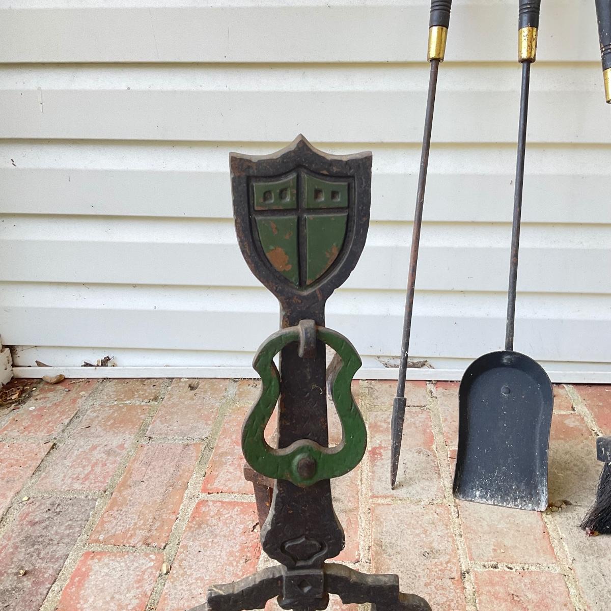 O16 Antique Cast Iron Arts & Crafts Andirons Shield & Lyre Motif