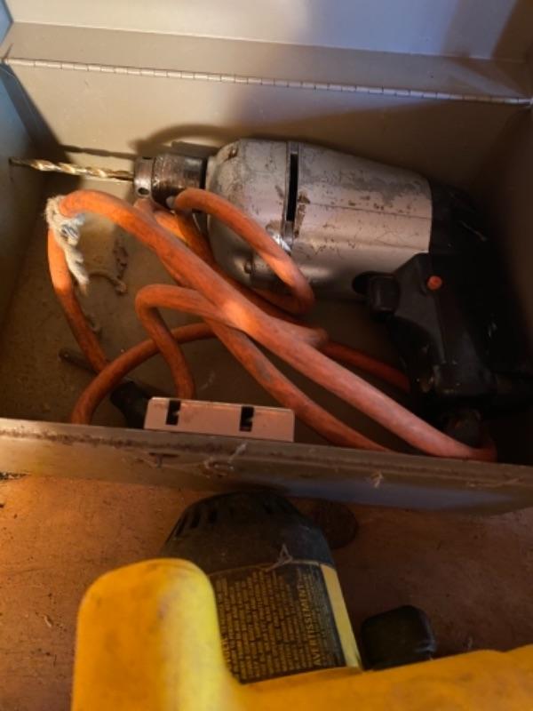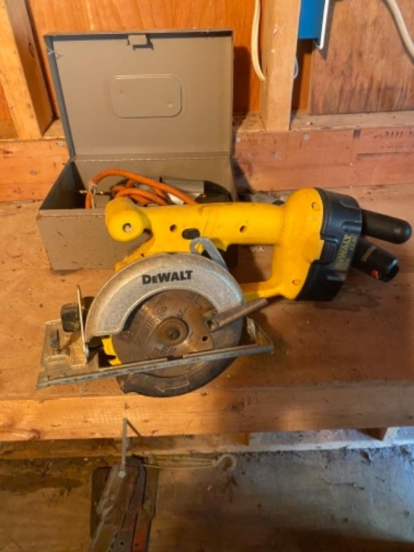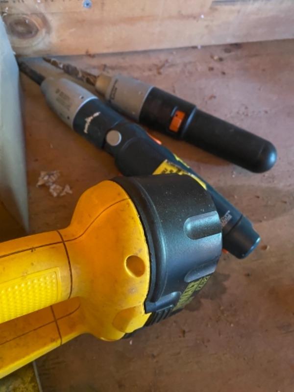 Lot of power handtools with Dewalt 18 V cordless trim Sa model DW936 with no charger vintage plug-in drill with black and decker screwdriver is no batteries