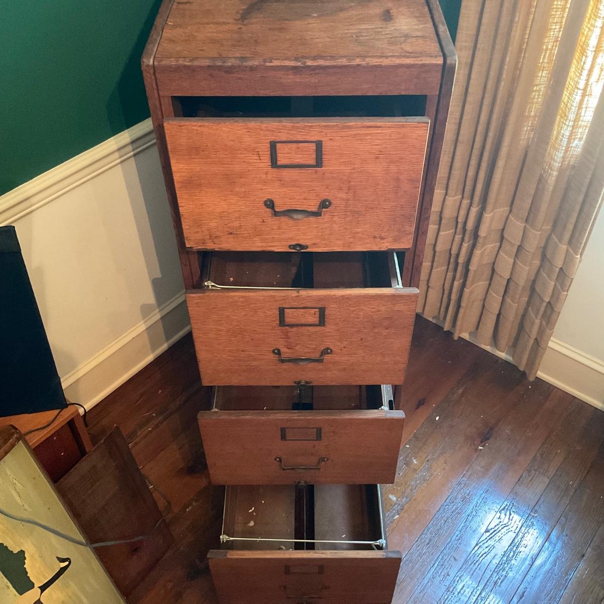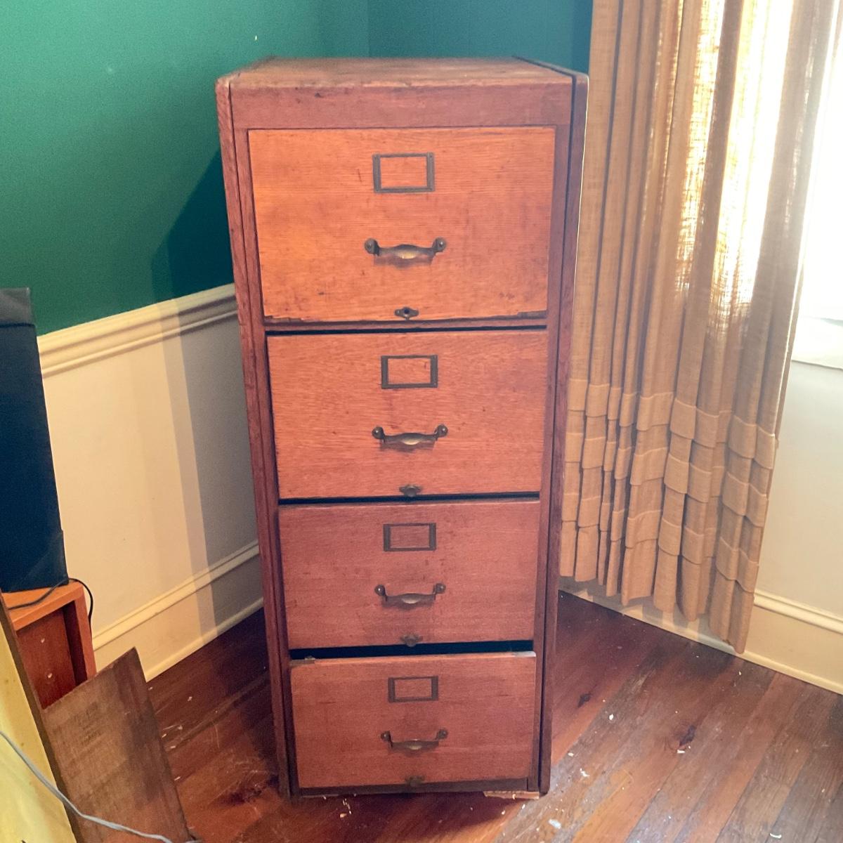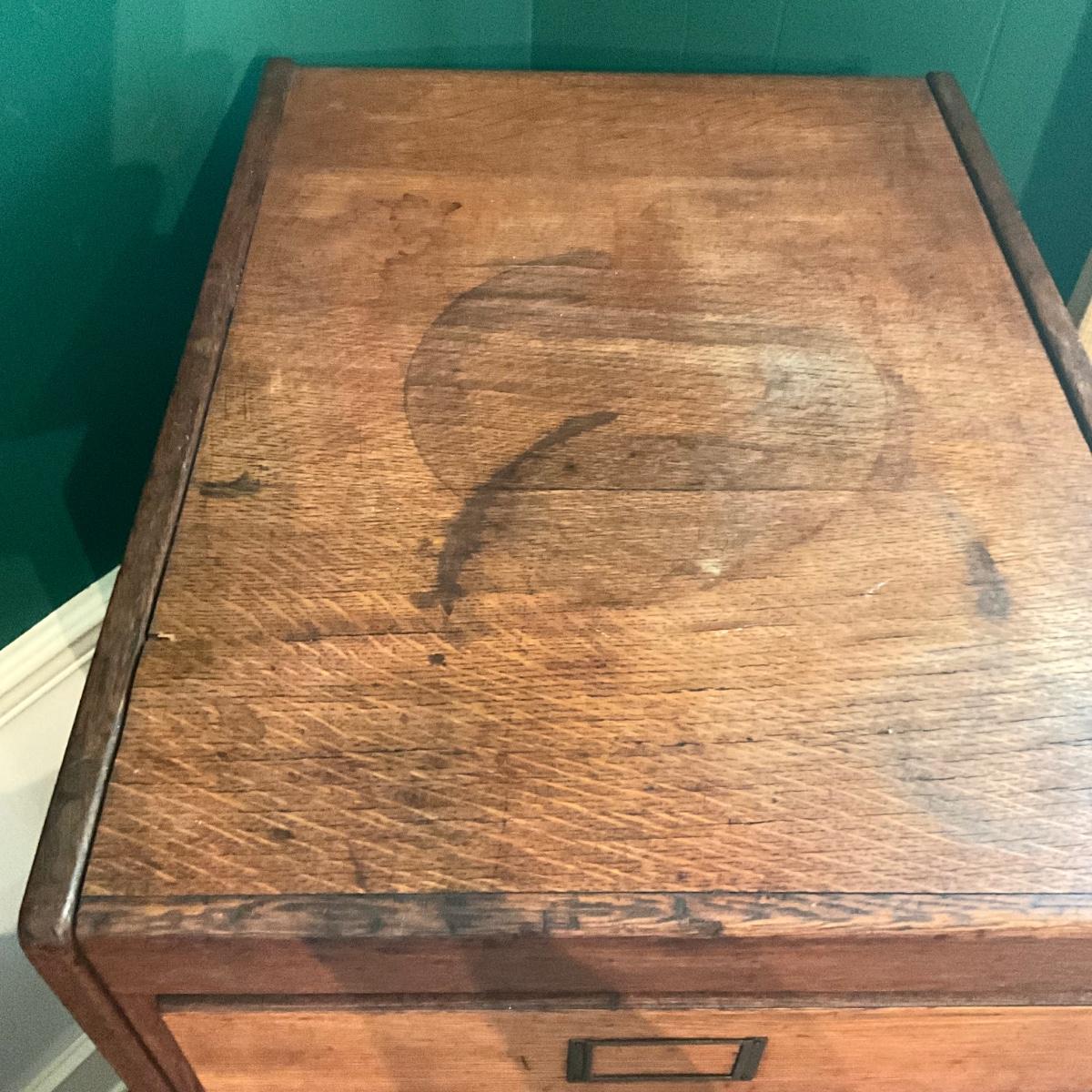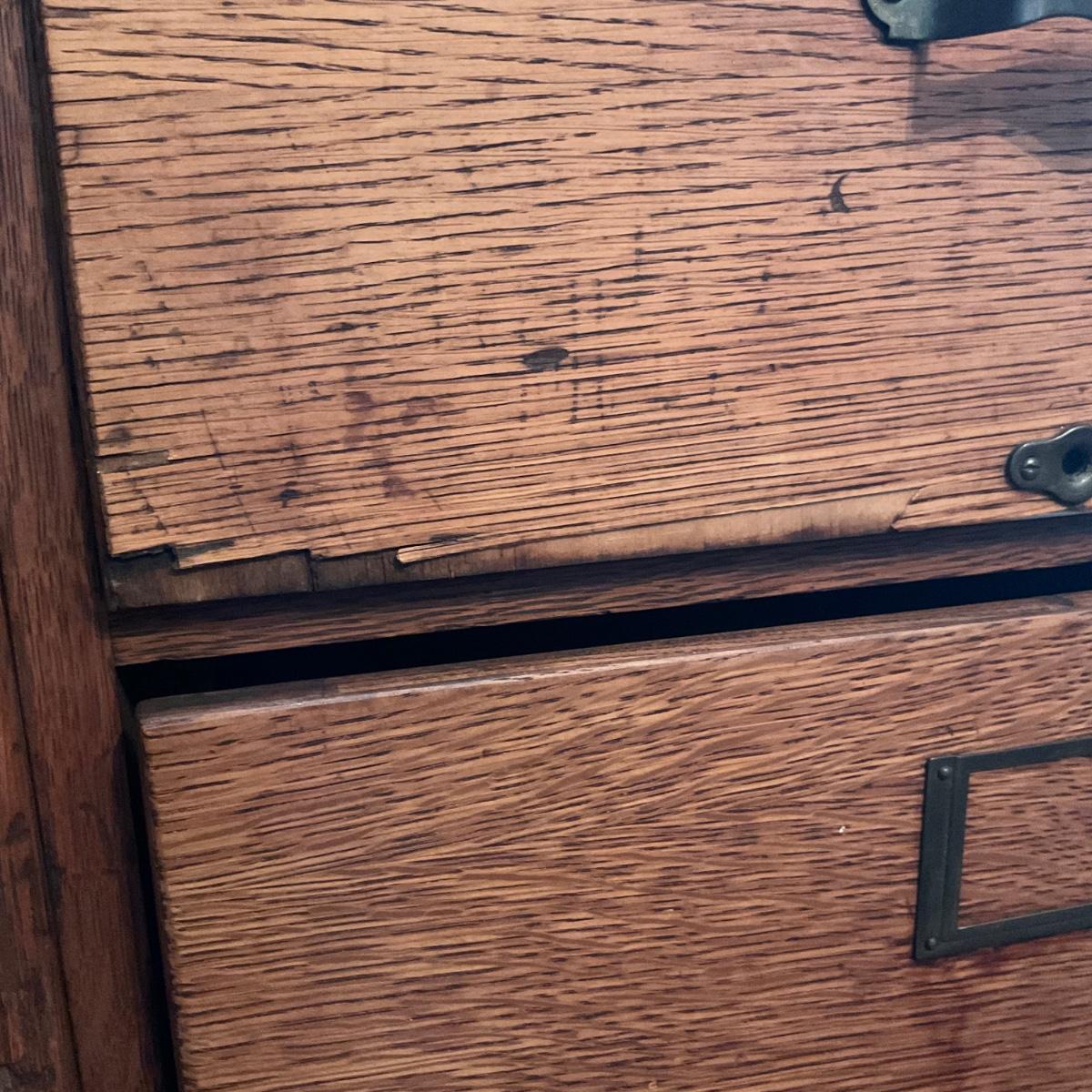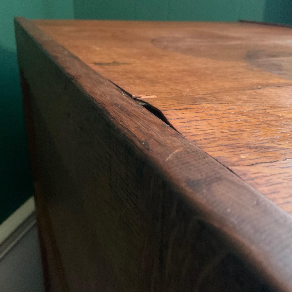 Has slight warping on top of cabinet and stains, also has some minor damage to front face of drawer see pictures