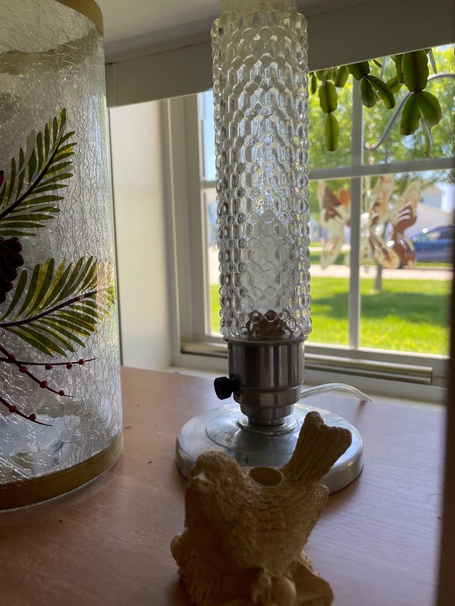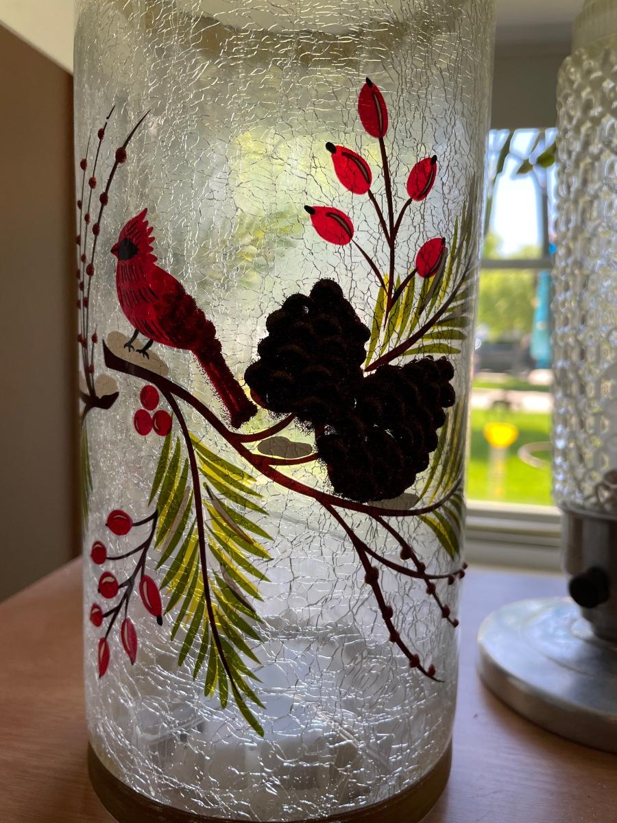 Glass vase with cardinal. Glass lamp and terra cotta bird